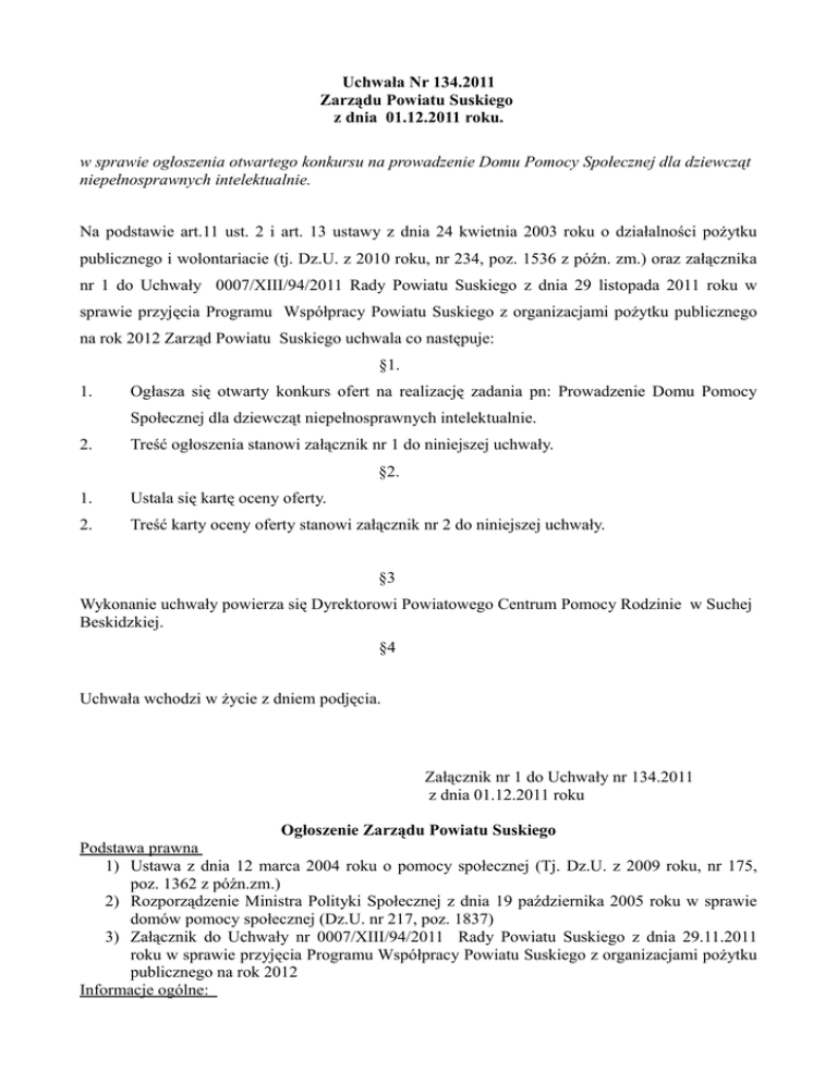 Uchwała Nr 134.2011 Zarządu Powiatu Suskiego z dnia 01.12.2011 roku. w sprawie ogłoszenia otwartego konkursu na prowadzenie Domu Pomocy Społecznej dla dziewcząt niepełnosprawnych intelektualnie. Na podstawie art.11 ust. 2 i art. 13 ustawy z dnia 24 kwietnia 2003 roku o działalności pożytku publicznego i wolontariacie (tj. Dz.U. z 2010 roku, nr 234, poz. 1536 z późn. zm.) oraz załącznika nr 1 do Uchwały 0007/XIII/94/2011 Rady Powiatu Suskiego z dnia 29 listopada 2011 roku w sprawie przyjęcia Programu Współpracy Powiatu Suskiego z organizacjami pożytku publicznego na rok 2012 Zarząd Powiatu Suskiego uchwala co następuje: §1. 1. Ogłasza się otwarty konkurs ofert na realizację zadania pn: Prowadzenie Domu Pomocy Społecznej dla dziewcząt niepełnosprawnych intelektualnie. 2. Treść ogłoszenia stanowi załącznik nr 1 do niniejszej uchwały. §2. 1. Ustala się kartę oceny oferty. 2. Treść karty oceny oferty stanowi załącznik nr 2 do niniejszej uchwały. §3 Wykonanie uchwały powierza się Dyrektorowi Powiatowego Centrum Pomocy Rodzinie w Suchej Beskidzkiej. §4 Uchwała wchodzi w życie z dniem podjęcia. Załącznik nr 1 do Uchwały nr 134.2011 z dnia 01.12.2011 roku Ogłoszenie Zarządu Powiatu Suskiego Podstawa prawna 1) Ustawa z dnia 12 marca 2004 roku o pomocy społecznej (Tj. Dz.U. z 2009 roku, nr 175, poz. 1362 z późn.zm.) 2) Rozporządzenie Ministra Polityki Społecznej z dnia 19 października 2005 roku w sprawie domów pomocy społecznej (Dz.U. nr 217, poz. 1837) 3) Załącznik do Uchwały nr 0007/XIII/94/2011 Rady Powiatu Suskiego z dnia 29.11.2011 roku w sprawie przyjęcia Programu Współpracy Powiatu Suskiego z organizacjami pożytku publicznego na rok 2012 Informacje ogólne: 1) Podmiotami uprawnionymi do udziału w konkursie są organizacje pozarządowe prowadzące działalność w zakresie pomocy społecznej, osoby prawne i jednostki organizacyjne działające na podstawie przepisów o stosunku Państwa do Kościoła Katolickiego w Rzeczypospolitej Polskiej, stosunku Państwa do innych kościołów i związków wyznaniowych oraz gwarancji wolności sumienia i wyznania, jeżeli ich cele statutowe obejmują prowadzenie działalności w zakresie pomocy społecznej. 2) Przed przystąpieniem do otwartego konkursu ofert każdy z podmiotów powinien zapoznać się dokładnie z treścią ogłoszenia w sprawie otwartego konkursu ofert oraz zapoznać się szczegółowo z warunkami konkursu. 3) Szczegółowe warunki konkursu określają rodzaj zadania, wysokość dotacji na realizację zadania, warunki przyznawania dotacji, termin i warunki realizacji zadania, termin składania ofert, tryb i kryteria stosowane przy wyborze ofert. 4) Podmiot zobowiązany jest do przygotowania i złożenia oferty zgodnie ze szczegółowymi warunkami konkursu, w terminie wskazanym w ogłoszeniu. 5) Oferta powinna zawierać wszystkie dokumenty i oświadczenia wymienione w niższej procedurze konkursu oraz być podpisane przez osobę (osoby) uprawnione do składania oświadczeń woli w imieniu podmiotu, pod rygorem nieważności. 6) Ofertę i załączniki należy sporządzić pod rygorem nieważności: w języku polskim, pismem komputerowym/maszynowym, przypadku załączenia do oferty kopii dokumentu, musi być ona potwierdzona przez osobę/osoby podpisujące ofertę. 7) Podmiot składający ofertę ponosi wszelkie koszty związane z związane z przygotowaniem i złożeniem oferty oraz odpowiada za poprawność oferty. I. Rodzaj zadania: Prowadzenie Domu Pomocy Społecznej dla 45 dziewcząt niepełnosprawnych intelektualnie. II. Wysokość dotacji na realizację zadania: Planowana wysokość dotacji na realizację w/w zadania w 2012 roku wynosi 900.000,00 zł i jest uzależniona od dotacji z budżetu wojewody na ten cel. III. Termin i warunki realizacji zadania: a) Do udziału w otwartym konkursie ofert może przystąpić podmiot, który spełni łącznie następujące wymagania formalne: 1) Prowadzi działalność statutową w dziedzinie objętej konkursem. 2) Dysponuje kadrą legitymującą się udokumentowanymi kwalifikacjami, zdolną do realizacji zadania. 3) Posiada doświadczenie niezbędne do realizacji zadania będącego przedmiotem konkursu. 4) Złoży w terminie prawidłowo sporządzoną ofertę wraz z wszystkimi załącznikami wymienionymi w szczegółowych warunkach konkursu, zgodnie z treścią ogłoszenia o konkursie oraz szczegółowymi warunkami konkursu, przy jednoczesnym spełnianiu przez podmiot kryteriów stosowanych przy wyborze oferty. b) zadanie będzie realizowane przez okres od 01.01.2012 do 31.12.2012 roku. c) oferent winien posiadać budynek zezwalający na prowadzenie Domu Pomocy Społecznej. d) szczegółowe warunki realizacji zadania, w tym zakres działania Domu Pomocy Społecznej określony zostanie w umowie zawartej przez powiat z jednostką, której oferta na prowadzenie Domu Pomocy Społecznej zostanie wybrana z zachowaniem zasad i wymogów określonych w obowiązujących przepisach prawa. IV. Termin składania ofert: 1.oferty należy składać w sekretariacie Starostwa Powiatowego w Suchej Beskidzkiej ul. Mickiewicza 19, pok. Nr 20 lub przesłać pocztą – decyduje data wpływu. Oferta winna znajdować się w kopercie opisanej nazwą i adresem pomiotu składającego, imieniem, nazwiskiem i numerem telefonu osoby do kontaktu, nazwy zadania, którego oferta dotyczy. Ostateczny termin składania ofert upływa w dniu 22.12.2011 roku . Wykonawca zostanie wyłoniony w terminie 14 dni od ostatecznego terminu składania ofert. 2. oferty należy składać na drukach – według wzoru określonego w Rozporządzeniu Ministra Pracy i Polityki Społecznej z dnia 15 grudnia 2010 roku w sprawie wzoru oferty realizacji zadania publicznego, ramowego wzoru umowy o wykonanie zadania publicznego i wzoru sprawozdania z wykonania tego zadania (Dz.U. z 2011 roku, nr 6, poz. 25). 3. do składanej oferty należy dołączyć: - aktualny wypis z rejestru sądoweg