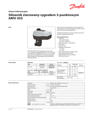 Arkusz Informacyjny Siłownik sterowany sygnałem 3-punktowym AMV 435 Opis Zaawansowana konstrukcja zawiera wyłącznik przeciążeniowy zabezpieczający siłownik i zawór przed nadmiernym obciążeniem. Kombinacje połączeń z innymi zaworami można znaleźć w tabelach Akcesoria. Siłowniki AMV 435 stosowane są z zaworami 2- i 3- drogowymi typu VRB, VRG, VF i VL o średnicy do DN 80 oraz z AHQM DN 40–100. Są one również stosowane z niezależnymi od ciśnienia zaworami równoważącymi i regulacyjnymi typu AB-QM od DN 40 do DN 100. Zamawianie Siłownik Typ AMV 435 Akcesoria - adapter Zasilanie 24 VAC/DC 230 VAC Nr kat. 082H0162 082H0163 Akcesoria - podgrzewacz trzpienia Typ Podgrzewacz trzpienia Dane podstawowe: •Zasilanie: - 24 V, 50 Hz/60 Hz - 230 V AC, 50/60 Hz • Sygnał sterujący: 3-punktowy • Siła: 400 N • Skok: 20 mm • Prędkość (ustawiana): - 7,5 s/mm - 15 s/mm • Max. temperatura czynnika: 130°C • Sygnalizacja diodami LED • Sygnał położenia krańcowego • Sterowanie ręczne DN Zasilanie Nr kat. 15-80 24 V 065Z0315 Zawory DN Dla starej wesrsji zaworów VRB, VRG, VF, VL (o numerach 065....) 15 20 25 32 40 50 max. Δp (bar) 9 4 2 1 0,8 0,5 40 - 100 - Do AB-QM pierwszej gen. Dane techniczne DEN-SMT/SI Nr kat. 065Z0313 Zasilanie V 24 VAC/ VDC, 230 VAC; +10 do -15% Zużycie energii VA 3 (24 V), 7,6 (230 V) Częstotliwość Hz 50 Hz lub 60 Hz (dla zasilania VAC) Sygnał sterujący 3-punktowy Siła N 400 Max. skok mm 20 Prędkość s/mm 7,5 lub 15 Max. temperatura czynnika 130 o Temperatura otoczenia C 0 … 55 Temp. transportu i przechowywania –40 … +70 Klasa ochrony II Stopień ochrony IP 54 Masa kg 0,45 Dyrektywa Niskich Napięć 2006/95/EC: EN 60730-1, EN 60730-2-14 — znak zgodności z normami Dyrektywa EMC 2004/108/EC: EN 61000-6-2, EN 61000-6-3 VD.LE.N5.49 © Danfoss 05/2015 1 Arkusz Informacyjny Siłownik sterowany sygnałem 3-punktowym AMV 435 Montaż Mechaniczny Do montażu siłownika na zaworze nie są potrzebne żadne narzędzia. Zawór z siłownikiem może być montowany w pozycji pionowej z siłownikiem do góry lub w pozycji poziomej. Nie można montować zaworu z silownikiem skierowanym w dół. Niedozwolony jest montaż siłownika w pomieszczeniach, w których mogą występować gazy wybuchowe lub , w których temperatura jest niższa niż 0°C lub wyższa niż 55°C. Siłownik nie może być narażony na działanie strumieni pary, wody oraz kapiących płynów. ① ③ ② ⑤ ④ Uwaga: Po poluzowaniu pierścienia mocującego siłownik na zaworze można go swobodnie obrócić do 360° względem zaworu. Po ustawieniu siłownika należy dokręcić pierścień mocujący. Elektryczny Dostęp do podłączeń elektrycznych można uzyskać po zdjęciu pokrywy siłownika. Do podłączenia dławików kablowych przygotowane są dwa niegwintowane otwory (Ø16 i łączony Ø16/ Ø20). Jeden z otworów jest fabrycznie wyposażony w gumowy dławik kablowy, a drugi jest przygotowany do otwarcia. Uwaga: Kable i dławiki kablowe nie mogą obniżać stopnia ochrony IP siłownika i muszą zapewniać pełne odciążenie połączenia. Dostarczany gumowy dławik kablowy nie obniża stopnia ochrony IP, ale nie zapewnia pełnego odciążenia zgodnie z dyrektywą niskich napięć. Należy przestrzegać lokalnych przepisów i wytycznych. Po zakończeniu montażu mechanicznego oraz elektrycznego sprawdź poprawność podłączeń i wykonaj następujące czynności: • Załącz zasilanie. • Wprowadź odpowiednią wartość sygnału i sprawdź, czy kierunek ruchu trzpienia zaworu jest zgodny z założonym. Urządzenie jest teraz sprawdzone i gotowe do pracy. Sygnalizacja diodami LED/ tryby pracy siłownika Wskaźnik diodowy funkcji Dwukolorowy (zielony/czerwony) wskaźnik diodowy funkcji znajduje się na obudowie siłownika. Sygnalizuje on tryby pracy. ≈ Uruchomienie Dioda kontrolna LED zielona ciągła: trzpień w pozycji wsuniętej Dioda kontrolna LED czerwona błyska: siłownik w trakcie wysuwania trzpienia Dioda kontrolna LED czerwona ciągła: trzpień w pozycji wysuniętej ≈ Dioda kontrolna LED zielona błyska: siłownik w trakcie wsuwania trzpienia 2 VD.LE.N5.49 © Danfoss 05/2015 DEN-SMT/SI Arkusz Informacyjny Siłownik sterowany sygnałem 3-punktowym AMV 435 Sterowanie ręczne Sterowanie ręczne odbywa się przy użyciu pokrętła sterującego na obudowie siłownika: • Odłącz sygnał sterujący • Wyreguluj położenie zaworu przy użyciu pokrętła regulacyjnego (zwróć uwagę na kierunek obrotu) Gdy regulacja ręczna nie jest już wymagana: • Załącz sygnał sterujący Podłączenia elektryczne Zaciski 1, 3: Sygnał sterujący z regulatora. Zasilanie 24 VAC/DC, 230 VAC (w zależności od typu) Nie wolno niczego dotykać na płytce obwodu drukowanego, gdy urządzenie jest pod napięciem! Nie zdejmować pokrywy przed całkowitym odłączeniem napięcia zasilania Maksymalna moc dopuszczalna na zaciskach 4 i 5 wynosi 7 VA. Uwaga: Zawór AB-QM zamyka się po wysunięciu trzpienia zaworu(zacisk 1) a otwiera się po jego wsunięcia (zacisk 3). p.górna p. dolna Zaciski 4, 5: Wyjścia sygnału służące do sygnalizacji pozycji siłownika lub do monitoringu N Neutralny/Wspólny (0 V) zasilanie na dół Długość przewodu Zalecany przekrój przewodu 0-50 m 0,75 mm2 > 50 m 1,5 mm2 do góry Złomowanie Przed złomowaniem siłownik należy rozłożyć na części i posortować na różne grupy materiałowe. DEN-SMT/SI VD.LE.N5.49 © Danfoss 05/2015 3 Arkusz Informacyjny Siłownik sterowany sygnałem 3-punktowym AMV 435 Wymiary 147 159,5 min. 180 82,5 Kombinacje zawór — siłownik 4 AMV 435 + VRB 2, VRG 2 AMV 435 + VRB 3, VRG 3 VD.LE.N5.49 AMV 435 + VF 2, VL 2 AMV 435 + VF 3, VL 3 AMV 435 + AB-QM (DN 40-100) AMV 435 + AHQM (DN 40-100) Produced by Danfoss A/S © 05/2015