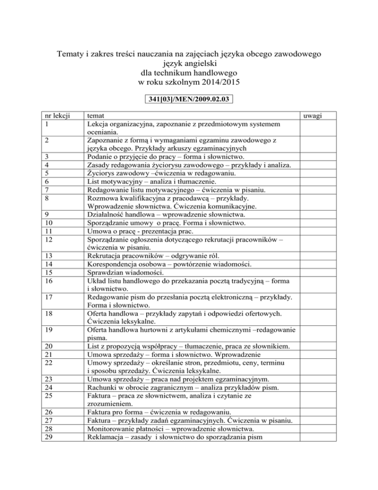 Tematy i zakres treści nauczania na zajęciach języka obcego zawodowego język angielski dla technikum handlowego w roku szkolnym 2014/2015 341[03]/MEN/2009.02.03 nr lekcji 1 2 3 4 5 6 7 8 9 10 11 12 13 14 15 16 17 18 19 20 21 22 23 24 25 26 27 28 29 temat Lekcja organizacyjna, zapoznanie z przedmiotowym systemem oceniania. Zapoznanie z formą i wymaganiami egzaminu zawodowego z języka obcego. Przykłady arkuszy egzaminacyjnych Podanie o przyjęcie do pracy – forma i słownictwo. Zasady redagowania życiorysu zawodowego – przykłady i analiza. Życiorys zawodowy –ćwiczenia w redagowaniu. List motywacyjny – analiza i tłumaczenie. Redagowanie listu motywacyjnego – ćwiczenia w pisaniu. Rozmowa kwalifikacyjna z pracodawcą – przykłady. Wprowadzenie słownictwa. Ćwiczenia komunikacyjne. Działalność handlowa – wprowadzenie słownictwa. Sporządzanie umowy o pracę. Forma i słownictwo. Umowa o pracę - prezentacja prac. Sporządzanie ogłoszenia dotyczącego rekrutacji pracowników – ćwiczenia w pisaniu. Rekrutacja pracowników – odgrywanie ról. Korespondencja osobowa – powtórzenie wiadomości. Sprawdzian wiadomości. Układ listu handlowego do przekazania pocztą tradycyjną – forma i słownictwo. Redagowanie pism do przesłania pocztą elektroniczną – przykłady. Forma i słownictwo. Oferta handlowa – przykłady zapytań i odpowiedzi ofertowych. Ćwiczenia leksykalne. Oferta handlowa hurtowni z artykułami chemicznymi –redagowanie pisma. List z propozycją współpracy – tłumaczenie, praca ze słownikiem. Umowa sprzedaży – forma i słownictwo. Wprowadzenie Umowy sprzedaży – określanie stron, przedmiotu, ceny, terminu i sposobu sprzedaży. Ćwiczenia leksykalne. Umowa sprzedaży – praca nad projektem egzaminacyjnym. Rachunki w obrocie zagranicznym – analiza przykładów pism. Faktura – praca ze słownictwem, analiza i czytanie ze zrozumieniem. Faktura pro forma – ćwiczenia w redagowaniu. Faktura – przykłady zadań egzaminacyjnych. Ćwiczenia w pisaniu. Monitorowanie płatności – wprowadzenie słownictwa. Reklamacja – zasady i słownictwo do sporządzania pism uwagi 30 31 32 33 34 35 36 37 38 39 40 41 42 43-60 reklamacyjnych. Reklamacja jakościowa i ilościowa – ćwiczenia w pisaniu. Sprawdzian wiadomości. Typowe druki bankowe – przykłady. Praca ze słownictwem. Rachunek bankowy – wprowadzenie słownictwa ćwiczenia leksykalne. Sporządzanie pisma z zapytaniem o warunki założenia rachunku bankowego i możliwości uzyskania kredytu. prezentacja przedsiębiorstwa handlowego. Praca z tekstem. Przygotowanie prezentacji przedsiębiorstwa – zadania egzaminacyjne. Reklama – forma i słownictwo. Analiza przykładów. Reklama – przygotowanie reklamy własnego przedsiębiorstwa handlowego. Notatka służbowa – zasady sporządzania. Negocjowanie – poszerzenie słownictwa. Ćwiczenia w mówieniu. Pracownik handlu – określanie cech wyglądu i postaw zawodowych. Ćwiczenia w mówieniu. Etykietki i opakowania – tłumaczenie. Praca ze słownikiem. Rezerwa. Ćwiczenia utrwalające i systematyzujące przerobiony materiał.