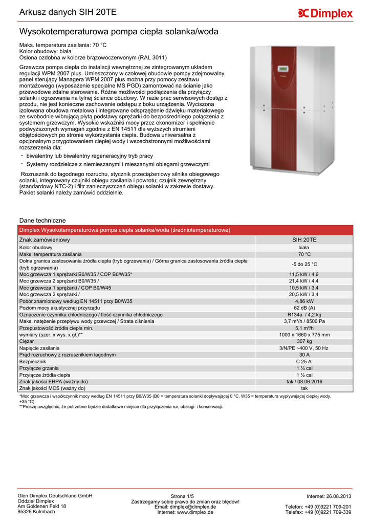 Arkusz danych Wysokotemperaturowa pompa ciep³a solanka/woda