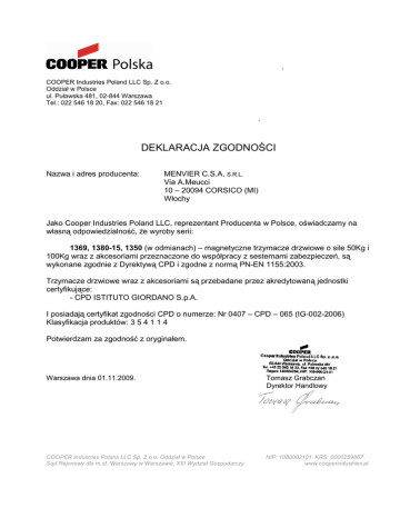 . COOPER Industries Poland LLC Sp. Z o.o. Oddział w Polsce ul. Puławska 481, 02-844 Warszawa Tel.: 022 546 18 20, Fax: 022 546 18 21 . DEKLARACJA ZGODNOŚCI Nazwa i adres producenta: MENVIER C.S.A. S.R.L. Via A.Meucci 10 – 20094 CORSICO (MI) Włochy Jako Cooper Industries Poland LLC, reprezentant Producenta w Polsce, oświadczamy na własną odpowiedzialność, Ŝe wyroby serii: 1369, 1380-15, 1350 (w odmianach) – magnetyczne trzymacze drzwiowe o sile 50Kg i 100Kg wraz z akcesoriami przeznaczone do współpracy z sestemami zabezpieczeń, są wykonane zgodnie z Dyrektywą CPD i zgodne z normą PN-EN 1155:2003. Trzymacze drzwiowe wraz z akcesoriami są przebadane przez akredytowaną jednostki certyfikujące: - CPD ISTITUTO GIORDANO S.p.A. I posiadają certyfikat zgodności CPD o numerze: Nr 0407 – CPD – 065 (IG-002-2006) Klasyfikacja produktów: 3 5 4 1 1 4 Potwierdzam za zgodność z oryginałem. Warszawa dnia 01.11.2009. Tomasz Grabczan Dyrektor Handlowy COOPER Industries Polans LLC Sp. Z o.o. Oddział w Polsce Sąd Rejonowy dla m.st. Warszawy w Warszawie, XIII Wydział Gospodarczy NIP: 1080002101, KRS: 0000259867 www.cooperindustries.pl