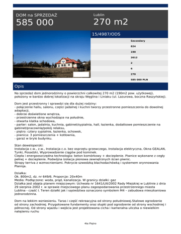 DOM na SPRZEDAŻ 585 000 Lublin 270 m2 15/4987/ODS Secondary 824 190 2012 2 6 270 585 000 PLN Opis Na sprzedaż dom jednorodzinny o powierzchni całkowitej 270 m2 (190m2 pow. użytkowej), położony w bardzo dobrej lokalizacji na skraju Węglina i Liniaku (ul. Lazurowa, boczna Raszyńskiej). Dom jest przestronny i sprawdzi się dla dużej rodziny: - połączenie hallu, salonu, części jadalnej i kuchni tworzy przestronne pomieszczenia do dowolnej adaptacji, - dobrze doświetlone wnętrza, - przestrzenne okna wychodzące na południe, - otwarta klatka schodowa, - parter: salon, jadalnia, kuchnia, gabinet/sypialnia, hall, łazienka, dodatkowe pomieszczenie na gabinet/pracownię/pokój relaksu, - piętro: cztery sypialnie, łazienka, schowek, - piwnica: 3 pomieszczenia + kotłownia, - garaż w bryle budynku. Stan deweloperski: Instalacja c.w., z.w., Instalacja c.o. bez osprzętu grzewczego, Instalacja elektryczna, Okna GEALAN, Tynki, Posadzki, Wyprowadzenie ciągów pod kominek. Ciepła i energooszczędna technologia: beton komórkowy + docieplenie. Piwnice wykonane z cegły pełnej + docieplenie. Podwójna izolacja pionowa zewnętrznych ścian piwnic. Stropy terriva z wzmocnieniami. Pokrycie szwedzką blachodachówką i systemem orynnowania Plannja. Działka: Ok. 800m2, dz. nr 649/6. Proporcje: 20x40m Media: Podłączone: woda, prąd, kanalizacja. W granicy działki: gaz Działka jest objęta planem miejscowym: Uchwała nr 1641/LIII/2002 Rady Miejskiej w Lublinie z dnia 29 sierpnia 2002 r. w sprawie miejscowego planu zagospodarowania przestrzennego miasta Lublina - część I. Teren działki jak i sąsiedztwa oznaczono symbolem M4 – zabudowa mieszkaniowa jednorodzinna. Dom na lekkim wzniesieniu. Taras i część rekreacyjna od strony południowej.Stalowe ogrodzenie od strony zachodniej. Przygotowane fundamenty oraz słupki pod ogrodzenie od strony wschodniej i północnej. Od strony wjazdu i wejścia jest projektowana cicha i kameralna uliczka o niewielkim natężeniu ruchu 4te Piętro Łukasz Łukawski tel. +48737490490 email: [email protected] 4te Piętro Powered by TCPDF (www.tcpdf.org)