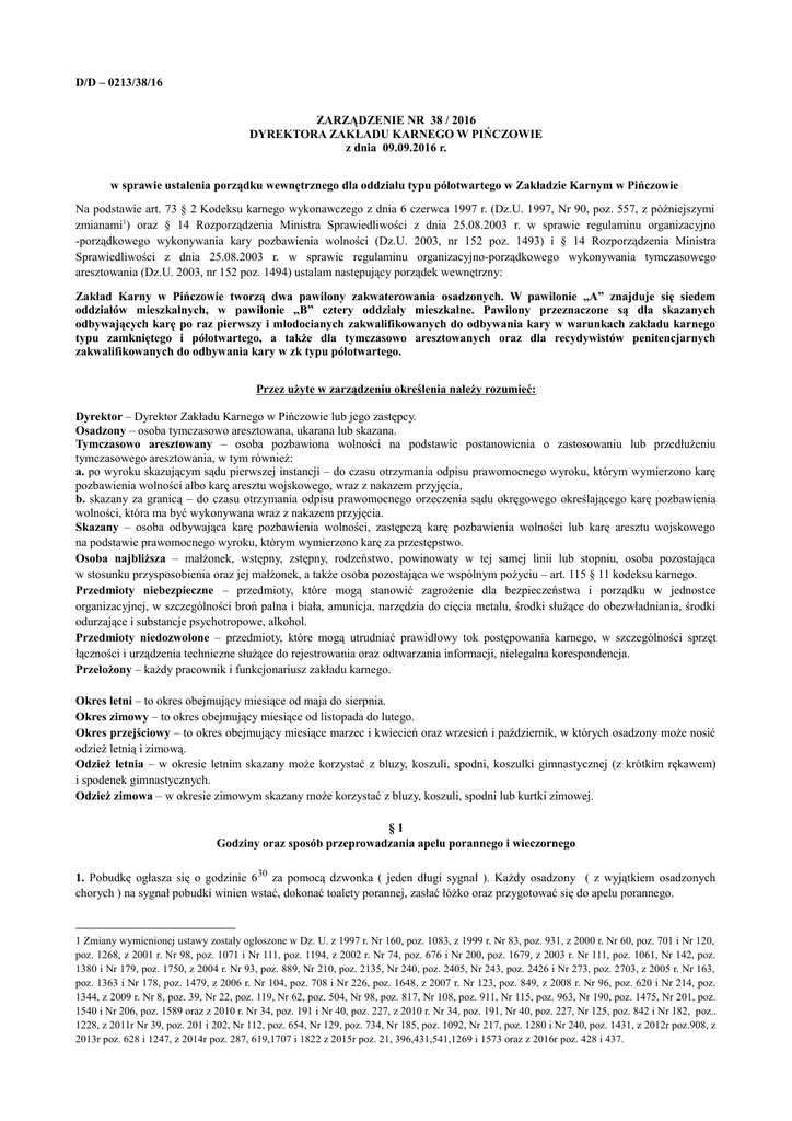 D/D – 0213/38/16 ZARZĄDZENIE NR 38 / 2016 DYREKTORA ZAKŁADU KARNEGO W PIŃCZOWIE z dnia 09.09.2016 r. w sprawie ustalenia porządku wewnętrznego dla oddziału typu półotwartego w Zakładzie Karnym w Pińczowie Na podstawie art. 73 § 2 Kodeksu karnego wykonawczego z dnia 6 czerwca 1997 r. (Dz.U. 1997, Nr 90, poz. 557, z późniejszymi zmianami1) oraz § 14 Rozporządzenia Ministra Sprawiedliwości z dnia 25.08.2003 r. w sprawie regulaminu organizacyjno -porządkowego wykonywania kary pozbawienia wolności (Dz.U. 2003, nr 152 poz. 1493) i § 14 Rozporządzenia Ministra Sprawiedliwości z dnia 25.08.2003 r. w sprawie regulaminu organizacyjno-porządkowego wykonywania tymczasowego aresztowania (Dz.U. 2003, nr 152 poz. 1494) ustalam następujący porządek wewnętrzny: Zakład Karny w Pińczowie tworzą dwa pawilony zakwaterowania osadzonych. W pawilonie ,,A” znajduje się siedem oddziałów mieszkalnych, w pawilonie ,,B” cztery oddziały mieszkalne. Pawilony przeznaczone są dla skazanych odbywających karę po raz pierwszy i młodocianych zakwalifikowanych do odbywania kary w warunkach zakładu karnego typu zamkniętego i półotwartego, a także dla tymczasowo aresztowanych oraz dla recydywistów penitencjarnych zakwalifikowanych do odbywania kary w zk typu półotwartego. Przez użyte w zarządzeniu określenia należy rozumieć: Dyrektor – Dyrektor Zakładu Karnego w Pińczowie lub jego zastępcy. Osadzony – osoba tymczasowo aresztowana, ukarana lub skazana. Tymczasowo aresztowany – osoba pozbawiona wolności na podstawie postanowienia o zastosowaniu lub przedłużeniu tymczasowego aresztowania, w tym również: a. po wyroku skazującym sądu pierwszej instancji – do czasu otrzymania odpisu prawomocnego wyroku, którym wymierzono karę pozbawienia wolności albo karę aresztu wojskowego, wraz z nakazem przyjęcia, b. skazany za granicą – do czasu otrzymania odpisu prawomocnego orzeczenia sądu okręgowego określającego karę pozbawienia wolności, która ma być wykonywana wraz z nakazem przyjęcia. Skazany – osoba odbywająca karę pozbawienia wolności, zastępczą karę pozbawienia wolności lub karę aresztu wojskowego na podstawie prawomocnego wyroku, którym wymierzono karę za przestępstwo. Osoba najbliższa – małżonek, wstępny, zstępny, rodzeństwo, powinowaty w tej samej linii lub stopniu, osoba pozostająca w stosunku przysposobienia oraz jej małżonek, a także osoba pozostająca we wspólnym pożyciu – art. 115 § 11 kodeksu karnego. Przedmioty niebezpieczne – przedmioty, które mogą stanowić zagrożenie dla bezpieczeństwa i porządku w jednostce organizacyjnej, w szczególności broń palna i biała, amunicja, narzędzia do cięcia metalu, środki służące do obezwładniania, środki odurzające i substancje psychotropowe, alkohol. Przedmioty niedozwolone – przedmioty, które mogą utrudniać prawidłowy tok postępowania karnego, w szczególności sprzęt łączności i urządzenia techniczne służące do rejestrowania oraz odtwarzania informacji, nielegalna korespondencja. Przełożony – każdy pracownik i funkcjonariusz zakładu karnego. Okres letni – to okres obejmujący miesiące od maja do sierpnia. Okres zimowy – to okres obejmujący miesiące od listopada do lutego. Okres przejściowy – to okres obejmujący miesiące marzec i kwiecień oraz wrzesień i październik, w których osadzony może nosić odzież letnią i zimową. Odzież letnia – w okresie letnim skazany może korzystać z bluzy, koszuli, spodni, koszulki gimnastycznej (z krótkim rękawem) i spodenek gimnastycznych. Odzież zimowa – w okresie zimowym skazany może korzystać z bluzy, koszuli, spodni lub kurtki zimowej. §1 Godziny oraz sposób przeprowadzania apelu porannego i wieczornego 1. Pobudkę ogłasza się o godzinie 630 za pomocą dzwonka ( jeden długi sygnał ). Każdy osadzony ( z wyjątkiem osadzonych chorych ) na sygnał pobudki winien wstać, dokonać toalety porannej, zasłać łóżko oraz przygotować się do apelu porannego. 1 Zmiany wymienionej ustawy zostały ogłoszone w Dz. U. z 1997 r. Nr 160, poz. 1083, z 1999 r. Nr 83, poz. 931, z 2000 r. Nr 60, poz. 701 i Nr 120, poz. 1268, z 2001 r. Nr 98, poz. 1071 i Nr 111, poz. 1194, z 2002 r. Nr 74, poz. 676 i Nr 200, poz. 1679, z 2003 r. Nr 111, poz. 1061, Nr 142, poz. 1380 i Nr 179, poz. 1750, z 2004 r. Nr 93, poz. 889, Nr 210, poz. 2135, Nr 240, poz. 2405, Nr 243, poz. 2426 i Nr 273, poz. 2703, z 2005 r. Nr 163, poz. 1363 i Nr 178, poz. 1479, z 2006 r. Nr 104, poz. 708 i Nr 226, poz. 1648, z 2007 r. Nr 123, poz. 849, z 2008 r. Nr 96, poz. 620 i Nr 214, poz. 1344, z 2009 r. Nr 8, poz. 39, Nr 22, poz. 119, Nr 62, poz. 504, Nr 98, poz. 817, Nr 108, poz. 911, Nr 115, poz. 963, Nr 190, poz. 1475, Nr 201, poz. 1540 i Nr 206, poz. 1589 oraz z 2010 r. Nr 34, poz. 191 i Nr 40, poz. 227, z 2010 r. Nr 34, poz. 191, Nr 40, poz. 227, Nr 125, poz. 842 i Nr 182, poz.. 1228, z 2011r Nr 39, poz. 201 i 202, Nr 112, poz. 654, Nr 129, poz. 734, Nr 185, poz. 1092, Nr 217, poz. 1280 i Nr 240, poz. 1431, z 2012r poz.908, z 2013r poz. 628 i 1247, z 2014r poz. 287, 619,1707 i 1822 z 2015r poz. 21, 396,431,541,1269 i 1573 oraz z 2016r poz. 428 i 437. 2. Apel poranny i wieczorny przeprowadza się w celach oraz w innych miejscach przebywania osadzonych ( dotyczy zatrudnienia ) w godzinach : a. apel poranny – 700 – 715, b. apel wieczorny – 1900 – 1915. Apel poranny oraz wieczorny ogłasza się za pomocą dzwonka ( dwa krótkie sygnały ). W czasie apelu osadzeni przebywają w celach mieszkalnych, w których są zakwaterowani. Skazani stają do apelu schludnie ubrani w odzież stosowną do pory roku. W czasie przeprowadzania apelu osadzeni pozostają w pozycji stojącej, w szeregu lub dwuszeregu z zachowaniem ciszy. Starszy celi składa meldunek o ilości osadzonych w celi mieszkalnej. Do czasu zakończenia apelu porannego w oddziale, osadzeni pozostają w celach mieszkalnych. 3. Na czas przeprowadza