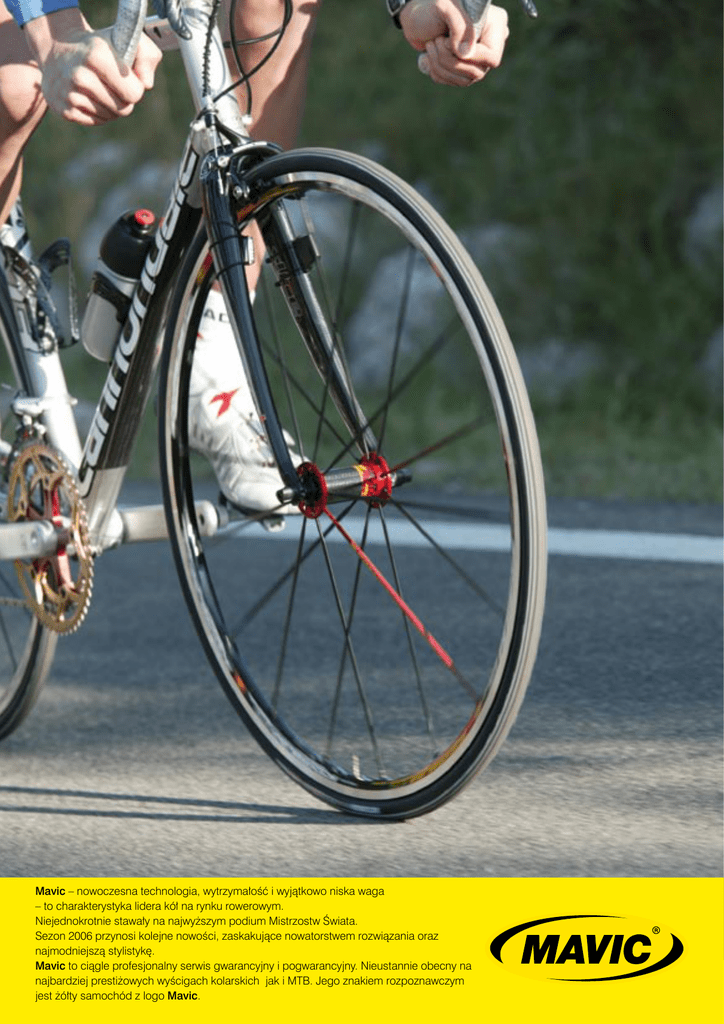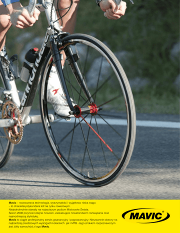 Mavic – nowoczesna technologia, wytrzymałość i wyjątkowo niska waga – to charakterystyka lidera kół na rynku rowerowym. Niejednokrotnie stawały na najwyższym podium Mistrzostw Świata. Sezon 2006 przynosi kolejne nowości, zaskakujące nowatorstwem rozwiązania oraz najmodniejszą stylistykę. Mavic to ciągle profesjonalny serwis gwarancyjny i pogwarancyjny. Nieustannie obecny na najbardziej prestiżowych wyścigach kolarskich jak i MTB. Jego znakiem rozpoznawczym jest żółty samochód z logo Mavic. www.harfa-harryson.com.pl znaki technologiczne CD Technologia polegająca na utwardzaniu powierzchni obręczy przez anodowanie. Zabieg wzmacnia ścianki obręczy, podnosi odporność na zużycie i podwyższa trwałość. ISOPULSE Metoda splotu szprych podnosząca sztywność, redukująca różnice naprężeń między szprychami i pozwalająca przenieść całą energię w napęd. CERAMIC 2 W procesie produkcyjnym powierzchnia obręczy zostaje obustronnie pokryta powłoką ceramiczną, składającą się z mieszanki tlenków aluminium i tytanu. Zastosowanie tej metody daje perfekcyjną jakość użytkowania w najbardziej ekstremalnych warunkach terenowych i pogodowych. Podstawowe atuty obręczy Ceramic: • trzydziestokrotne zmniejszenie temperatury obręczy podczas ostrego hamowania względem obręczy tradycyjnych • s krócenie drogi hamowania do 20% na powierzchni suchej i do 50% w warunkach deszczowych • p owłoka ceramiczna przy częstym hamowaniu nie ulega ścieraniu, co znacznie wydłuża żywotność obręczy. MAXTAL Patent firmy MAVIC. Specjalny stop aluminium który sprawia, że obręcze są lżejsze i o 30% wytrzymalsze. FORE Nowa technologia „wiercenia” otworów, która poprzez topienie materiału powoduje powstawanie kołnierza w jednej ściance obręczy. Obręcz wykonana tą metodą jest czterokrotnie wytrzymalsza i sztywniejsza. Ma też niższą masę. FTS - L Force Transfer System Light Patent technologiczny FTS - L to jeden z największych wynalazków firmy MAVIC,a. Utwardzona strefa kontaktu piasty z korpusem kasety i przenoszona transmisja dwoma osadzonymi po przeciwnej stronie zapadkami, pozwala na całkowitą niezawodność systemu. Zaletami tego systemu są: mała waga, toczenia, ciche funkcjonowanie, długa żywotność i kompatybilność (możliwość zamiany korpusu kasety ED na M10 i odwrotnie). H 2 Hammer Hardening Wzmocnienie lokalne obręczy w okolicy otworów, gdzie szprycha wywołuje największe przeciążenie. Technologia ta, wzmacniając, przedłuża jednocześnie żywotność obręczy uodparniając ją przed mikropęknięciami. ISM Przeszlifowanie zewnętrznej płaszczyzny obręczy, między otworami na szprychy (znacznie obniża wagę). Zalety: • z mniejszenie wagi obręczy pomiędzy 30 a 40 g, • z achowanie sztywności i wytrzymałości obręczy, a tym samym koła. Mniejsza waga obręczy pozwala osiągnąć znakomite wyniki. Obręcz w trudnych warunkach terenowych nadal zachowuje swoje właściwości, bez narażania koła na defekty. Jest to wyłączny patent firmy MAVIC. QRM Uszczelnione łożyska maszynowe we wszystkich piastach firmy MAVIC. Wyjątkowo solidne i odporne, mają minimalne opory toczenia, są regulowane i wymienialne. QRM+ Technologia idealnie uszczelnionych i dopasowanych łożysk. Umożliwia łatwe i szybkie dostosowanie kół do potrzeb. Stwarzają minimalny opór toczenia lub idealną odporność na wilgoć. R3 Unikalna technologia zastosowana w hamulcach SSC zapewnia szybki powrót sprężyny. Technologia ta eliminuje drgania powstające pomiędzy sprężyną a szczękami. Umożliwia to płynne i efektywne hamowanie. SUP Metoda specjalnego łączenia obręczy bezpośrednio za pomocą procesu spawania, a następnie frezowania miejsca spawu. Dzięki temu obręcz jest ok. 40% sztywniejsza od obręczy o tradycyjnym łączeniu. Podczas hamowania miejsce złącza nie jest w ogóle odczuwalne. UB CONTROL Technologia UB Control polega na przetoczeniu obu boków obręczy w końcowej fazie procesu technologicznego. W efekcie podwyższono jakość hamowania, dzięki osiągnięciu idealnego kontaktu klocka hamulcowego z obręczą. Dodatkowo wpływa na estetyczny wygląd. UST TUBELESS - Universal Standard For Tubeless Przylega idealnie, daje większą kontrolę, bez dętki, bez opaski na obręcz. Koncept UST eliminuje ryzyko defektu przez dobicie opony z góry. W razie przebicia opony (utkwienia ostrza) gwarantuje, że powietrze nagle nie zejdzie, a jazda może być kontynuowana przez jakiś czas. WIN Patent firmy Mavic. Komputerek bezprzewodowy z nadajnikiem cyfrowo kodowanym. System ten gwarantuje perfekcyjne funkcjonowanie i zabezpiecza przed wszelkimi zakłóceniami zewnętrznymi. ZICRAL Specjalny stop aluminium o najwyższych parametrach mechanicznych, użyty do produkcji szprych. Szprychy sztywne i lekkie jak „pióro”. Wytrzymalsze o 10% od najlepszych szprych stalowych. koła torowe ELLIPSE – MV-32374314 Przeznaczone specjalnie do treningu. Koła torowe używane przez mistrza olimpijskiego z Aten Ryana Bayley`a. Uznane zostały przez niego za znakomite koła do treningu, zarówno pod względem osiągów, sztywności jak i pod względem praktycznym. Charakterystyka techniczna: WAGA: Przód - 955 g tył - 1040 g OBRĘCZ: Materiał: aluminium 6106 Łączenie: spaw SUP Kolor: anodowana na czarno Wysokość: profil 30mm Wiercenie: tradycyjne Ogumienie: wyłącznie oponka Nity: profilowane, aluminiowe Wentyl: otwór wentyla 6,5mm SZPRYCHY: Stal nierdzewna Typ: proste, płaskie, czarne Nyple: mosiężne typ ABS Ilość szprych: 20 przód i tył Splot: przód radialnie, tył na dwa krzyże PIASTA: Korpus: przód i tył ze stopu aluminium, czarne Oś przednia i tylna: stal Łożyska: QRM+ System mocowania trybu: koronka nakręcana na gwint 1,37x24 TPI KOMPATYBILNE: Opony Możliwość nakręcania koronki na tylną piastę po obu stronach. DOSTARCZANE Z:w komplecie nakrętki do przykręcania, kontra do koronki, instrukcja o