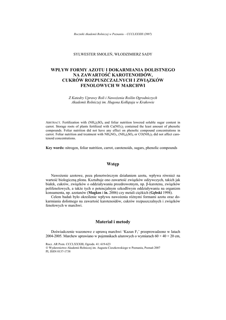 Roczniki Akademii Rolniczej w Poznaniu – CCCLXXXIII (2007) SYLWESTER SMOLEŃ, WŁODZIMIERZ SADY WPŁYW FORMY AZOTU I DOKARMIANIA DOLISTNEGO NA ZAWARTOŚĆ KAROTENOIDÓW, CUKRÓW ROZPUSZCZALNYCH I ZWIĄZKÓW FENOLOWYCH W MARCHWI Z Katedry Uprawy Roli i Nawożenia Roślin Ogrodniczych Akademii Rolniczej im. Hugona Kołłątaja w Krakowie ABSTRACT. Fertilization with (NH4)2SO4 and foliar nutrition lowered soluble sugar content in carrot. Storage roots of plants fertilized with Ca(NO3)2 contained the least amount of phenolic compounds. Foliar nutrition did not have any effect on phenolic compound concentrations in carrot. Foliar nutrition and treatment with NH4NO3, (NH4)2SO4 or CO(NH2)2 did not affect carotenoid concentrations. Key words: nitrogen, foliar nutrition, carrot, carotenoids, sugars, phenolic compounds Wstęp Nawożenie azotowe, poza plonotwórczym działaniem azotu, wpływa również na wartość biologiczną plonu. Kształtuje ono zawartość związków odżywczych, takich jak białek, cukrów, związków o oddziaływaniu prozdrowotnym, np. β-karotenu, związków polifenolowych, a także tych o potencjalnym szkodliwym oddziaływaniu na organizm konsumenta, np. azotanów (Magkos i in. 2006) czy metali ciężkich (Gębski 1998). Celem badań było określenie wpływu nawożenia różnymi formami azotu oraz dokarmiania dolistnego na zawartość karotenoidów, cukrów rozpuszczalnych i związków fenolowych w marchwi. Materiał i metody Doświadczenie wazonowe z uprawą marchwi ‘Kazan F1’ przeprowadzono w latach 2004-2005. Marchew uprawiano w pojemnikach ażurowych o wymiarach 60 × 40 × 20 cm, Rocz. AR Pozn. CCCLXXXIII, Ogrodn. 41: 619-623 © Wydawnictwo Akademii Rolniczej im. Augusta Cieszkowskiego w Poznaniu, Poznań 2007 PL ISSN 0137-1738 620 S. Smoleń, W. Sady umieszczonych na terenie otwartym pod cieniówką. Pojemniki wypełniono gliną średnią pylastą (30% piasku, 28% pyłu, 37% iłu) o zawartości substancji organicznej 3,25%, średnio w 2004 i 2005 roku. Na podstawie wyników analiz chemicznych gleby, zawartość przyswajalnych form składników pokarmowych utrzymywano w 1 dm3 gleby na poziomie: 100 mg N, 80 mg P, 120 mg K, 80 mg Mg i 2000 mg Ca. Doglebowe nawożenie azotem do wyżej wymienionego poziomu wykonywano trzy razy w ciągu uprawy (tj. w 2004 roku – 20 kwietnia, 5 lipca i 23 sierpnia oraz w 2005 roku – 25 kwietnia, 1 lipca i 22 sierpnia). Badaniami objęto dwa podbloki z dolistnym i bez dolistnego dokarmiania roślin. Rośliny dokarmiano dolistnie trzykrotnie (w 2004 roku – 30 kwietnia, 6 sierpnia i 24 sierpnia oraz w 2005 roku – 28 czerwca, 1 sierpnia i 23 sierpnia), używając kolejno: 2-procentowego roztworu mocznika, 1-procentowego roztworu nawozu wieloskładnikowego Supervit R i ponownie 2-procentowego roztworu mocznika. W obrębie podbloków wyróżniono obiekty z doglebowym nawożeniem różnymi formami azotu: kontrola (nienawożona azotem), Ca(NO3)2, NH4NO3, (NH4)2SO4 i CO(NH2)2. W korzeniach spichrzowych marchwi oznaczono sumaryczną zawartość: związków karotenoidowych według PN-90/A-75101.12, związków fenolowych z użyciem odczynnika Folina i Ciocalteu’a (Swain i Hillis 1959), cukrów rozpuszczalnych metodą antronową (Yemm i Wills 1954). Obliczenia statystyczne uzyskanych wyników przeprowadzono modułem ANOVA programu Statistica 6.0 PL dla α = 0,05. Bardziej szczegółowy opis metody prowadzenia badań przedstawiono w innej publikacji (Smoleń i in. 2006). Wyniki i dyskusja a 30 20 10 0 1 2 3 4 5 6 b 5 4 3 2 1 0 1 2 3 4 5 mg·100 g-1 św.m. – f.w. 40 g·100 g-1 św.m. – f.w. mg·100 g-1 św.m. – f.w. Współdziałanie dokarmiania dolistnego z doglebowym nawożeniem azotem nie miało istotnego wpływu na sumaryczną zawartość związków karotenoidowych, cukrów rozpuszczalnych i związków fenolowych w marchwi (ryc. 1). 40 c 30 20 10 0 1 2 3 4 5 Ryc. 1. Zawartość karotenoidów (a), cukrów rozpuszczalnych (b) i związków fenolowych (c) w korzeniach spichrzowych marchwi. 1 – kontrola, 2 – Ca(NO3)2, 3 – NH4NO3, 4 – (NH4)2SO4, 5 – CO(NH2)2, □ bez dokarmiania dolistnego, ■ dokarmianie dolistne. Brak istotnego współdziałania dokarmiania dolistnego z nawożeniem na zawartość a), b) i c) Fig. 1. Content of carotenoids (a), soluble sugars (b) and phenolics compound (c) in carrot storage roots. 1 – control, 2 – Ca(NO3)2, 3 – NH4NO3, 4 – (NH4)2SO4, 5 – CO(NH2)2, □ without foliar nutrition, ■ with foliar nutrition. No significant co-operation of foliar nutrition with fertilization on content of a), b) and c) 621 Wpływ formy azotu i dokarmiania dolistnego... Nawożenie roślin (NH4)2SO4 i CO(NH2)2 przyczyniło się do istotnego zmniejszenia zawartości cukrów rozpuszczalnych w marchwi w porównaniu z roślinami nawożonymi Ca(NO3)2 z kontrolą. Rośliny nawożone Ca(NO3)2 charakteryzowały się istotnie mniejszą zawartością związków fenolowych w porównaniu z roślinami kontrolnymi oraz nawożonymi innymi nawozami azotowymi. Korzenie spichrzowe roślin kontrolnych (nienawożonych azotem) charakteryzowały się podobną zawartością związków karotenoidowych, jak korzenie roślin nawożonych poszczególnymi formami azotu nawozowego (tab. 1). Tabela 1 Zawartość karotenoidów, cukrów rozpuszczalnych i związków fenolowych w korzeniach spichrzowych marchwi w zależności od nawożenia i dokarmiania dolistnego Content of carotenoids, soluble sugars and phenolics compound in the carrot storage roots concerning soil fertilization and foliar nutrition Forma nawozu N-form Suma karotenoidów Total carotenoids Suma cukrów rozpuszczalnych Total soluble sugars Suma fenoli Total phenolics compound (mg·100 g-1 św.m. – mg·100 g-1 f.w.) średnie dla nawożenia – means for fertilization Kontrola – Control 30,02 4 950,68 30,15 Ca(NO3)2 26,88 4 894,40 18,51 NH4NO3 27,85 4 612,58 30,28 (NH4)2SO4 29,42 4 176,15 28,90 CO(NH2)2 29,18 4 415,06 27,68 NIR (dla nawożenia) LSD (for fertilization