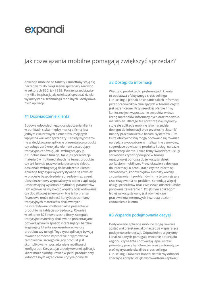 Jak rozwiązania mobilne pomagają zwiększyć sprzedaż? Aplikacje mobilne na tablety i smartfony stają się narzędziami do zwiększenia sprzedaży zarówno w sektorach B2C, jak i B2B. Poniżej przedstawiamy kilka inspiracji, jak zwiększyć sprzedaż dzięki wykorzystaniu technologii mobilnych i dedykowanych aplikacji. #1 Doświadczenie klienta Budowa odpowiedniego doświadczenia klienta w punktach styku między marką a firmą jest jednym z kluczowych elementów, mających wpływ na wielkość sprzedaży. Tablety wyposażone w dedykowane aplikacje prezentujące produkt czy usługę zarówno jako element zastępujący tradycyjną cenówkę, jak i wzbogacający ją o zupełnie nowe funkcje, takie jak prezentacja materiałów multimedialnych na temat produktu czy też funkcja przywołania personelu sklepu, doskonale wzbogacają doświadczenie klienta. Aplikacje tego typu wykorzystywane są również w procesie bezpośredniej sprzedaży (np. agent ubezpieczeniowy wyposażony w tablet z aplikacją umożliwiającą wykonanie symulacji parametrów i ich wpływu na wysokość wypłaty odszkodowania czy dodatkowej emerytury). Nie tylko branża finansowa może odnieść korzyści ze zamiany tradycyjnych materiałów drukowanych na interaktywne, multimedialne prezentacje produktu na tablecie sprzedawcy. Również w sektorze B2B nowoczesne firmy zastępują tradycyjne materiały drukowane prezentacjami pozwalającymi w sposób interesujący i bardziej angażujący klienta zaprezentować walory produktu czy usługi. Tego typu aplikacje bywają również pomocne w procesie przyjmowania zamówienia, szczególnie gdy produkt jest skomplikowany i posiada wiele możliwości konfiguracji. Korzystając z dedykowanej aplikacji, klient może skonfigurować w pełni produkt przy jednoczesnym ograniczeniu ryzyka pomyłek. #2 Dostęp do informacji Wiedza o produktach i preferencjach klienta to podstawa efektywnego cross-sellingu i up-sellingu, jednak posiadanie takich informacji przez pracowników działających w terenie często jest ograniczone. Przy szerokiej ofercie firmy konieczne jest wyposażenie zespołów w dużą liczbę materiałów informacyjnych oraz zapewnienie szkoleń. Dlatego też coraz częściej wykorzystuje się aplikacje mobilne jako narzędzia dostępu do informacji oraz przenośny „łącznik” między pracownikiem a bazami systemów CRM. Dużą efektywnością mogą pochwalić się również narzędzia wyposażone w inteligentne algorytmy, sugerujące powiązane produkty i usługi na bazie preferencji klienta. Także firmy świadczące usługi serwisowe czy też operujące w branży maszynowej odnoszą duże korzyści dzięki aplikacjom mobilnym. Przez ułatwienie dostępu do informacji o produktach czy też informacji serwisowych, kodów błędów lub bazy wiedzy z rozwiązaniami problemów firmy te zmniejszają czas reagowania na problem, sprzedają więcej usług i produktów oraz zwiększają odsetek umów ponownie zawieranych. Dzięki tym aplikacjom lepiej wykorzystywany jest również czas pracowników terenowych i wzrasta poziom zadowolenia klienta. #3 Wsparcie podejmowania decyzji Dedykowane aplikacje mobilne mogą również zostać wykorzystane jako narzędzia wspierające podejmowanie decyzji. Odpowiednie algorytmy i analiza danych pomagają w ocenie potencjału regionu czy klienta i pozwalają lepiej ustalić priorytety pracy handlowców oraz zautomatyzować wykrywanie okazji do cross-sellingu i up-sellingu. Również handel detaliczny odnośni znaczące korzyści dzięki wprowadzeniu aplikacji mobilnych, które wspierają decyzje podejmowane przez menadżerów poszczególnych jednostek. Dzięki temu lepiej zarządzają rotacją produktów i stanami magazynowymi, w efekcie czego zwiększają sprzedaż i osiągane marże. Takie aplikacje pozwalają lepiej wykorzystać potencjał drzemiący w gromadzonych przez centralę i poszczególne jednostki danych oraz wydobyć wiedzę o klientach i ich preferencjach płynącą z danych transakcyjnych. #4 Raportowanie Dobrze zaprojektowane aplikacje mobilne pozwalają również ograniczyć czas, jaki pracownicy terenowi poświęcają na raportowanie. W ten sposób firmy odnoszą podwójną korzyść. Odzyskują czas pracowników, który następnie mogą przeznaczyć na sprzedaż, oraz gromadzą dane z terenu niemal w czasie rzeczywistym. Zdecydowane skrócenie czasu przepływu informacji z terenu do centrali pozwala również szybciej podejmować decyzje na najwyższym szczeblu. Centrala może oprzeć decyzje na danych, a nie na intuicji, którą musi się kierować w oczekiwaniu na obróbkę danych i przepływ tradycyjnych raportów. Sprawna komunikacja pozwala szybciej wykrywać zagrożenia konkurencyjne, jak i okazje do zwiększenia sprzedaży. © 2014 Expandi sp. z o.o. Przedstawiliśmy tylko kilka z wielu przykładów, jak można dzięki dedykowanym mobilnym aplikacjom, dostosowanym do potrzeb i wyzwań stojących przed firmami, zwiększyć sprzedaż i jednocześnie obniżyć koszty. Mobilność wpływa na transformację całych branż i osiągnięcie zupełnie nowych poziomów efektywności. Jednak sama inwestycja w technologie nie jest gwarancją zwiększenia sprzedaży czy produktywności. Tylko zrozumienie potrzeb, ustalenie priorytetów, właściwa strategia oraz zaprojektowanie i implementacja w pełni mobilnych, bezpiecznych rozwiązań przyniosą oczekiwane rezultaty i uczynią z technologii mobilnych element przewagi konkurencyjnej. Co dalej? Skontaktuj się z nami. Pomagamy z sukcesem dużym korporacjom i średnim firmom odnieść znaczące korzyści z wprowadzenia rozwiązań mobilnych i uczynić z nich element przewagi konkurencyjnej. Zadzwoń pod numer 33 815 04 68 lub wyślij mail na adres [email protected] i umów się na darmową konsultację, podczas której nasi specjaliści zapoznają Cię z możliwościami podniesienia efektywności dzięki wykorzystaniu rozwiązań mobilnych. 2 Expandi sp. z o.o., ul. Cyniar
