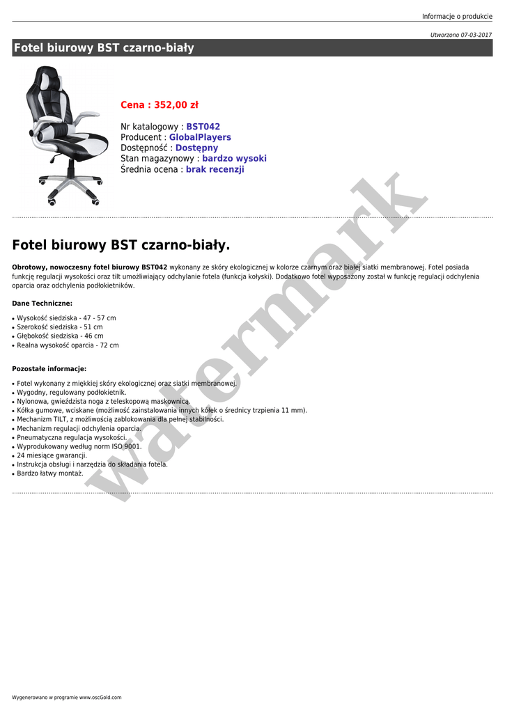 Informacje o produkcie Utworzono 07-03-2017 Fotel biurowy BST czarno-biały Cena : 352,00 zł er m ar k Nr katalogowy : BST042 Producent : GlobalPlayers Dostępność : Dostępny Stan magazynowy : bardzo wysoki Średnia ocena : brak recenzji Fotel biurowy BST czarno-biały. Obrotowy, nowoczesny fotel biurowy BST042 wykonany ze skóry ekologicznej w kolorze czarnym oraz białej siatki membranowej. Fotel posiada funkcję regulacji wysokości oraz tilt umożliwiający odchylanie fotela (funkcja kołyski). Dodatkowo fotel wyposażony został w funkcję regulacji odchylenia oparcia oraz odchylenia podłokietników. Dane Techniczne: ● ● ● ● Wysokość siedziska - 47 - 57 cm Szerokość siedziska - 51 cm Głębokość siedziska - 46 cm Realna wysokość oparcia - 72 cm Pozostałe informacje: ● ● ● ● ● ● ● ● ● Fotel wykonany z miękkiej skóry ekologicznej oraz siatki membranowej. Wygodny, regulowany podłokietnik. Nylonowa, gwieździsta noga z teleskopową maskownicą. Kółka gumowe, wciskane (możliwość zainstalowania innych kółek o średnicy trzpienia 11 mm). Mechanizm TILT, z możliwością zablokowania dla pełnej stabilności. Mechanizm regulacji odchylenia oparcia. Pneumatyczna regulacja wysokości. Wyprodukowany według norm ISO 9001. 24 miesiące gwarancji. Instrukcja obsługi i narzędzia do składania fotela. Bardzo łatwy montaż. at ● w ● Wygenerowano w programie www.oscGold.com