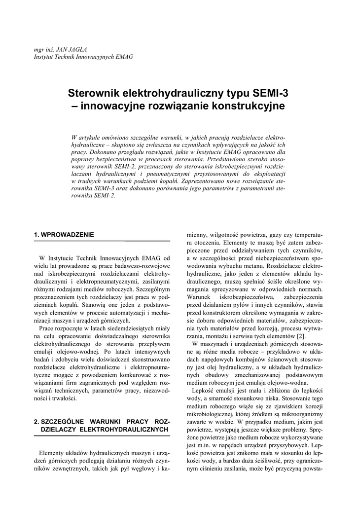 mgr inż. JAN JAGŁA Instytut Technik Innowacyjnych EMAG Sterownik elektrohydrauliczny typu SEMI-3 – innowacyjne rozwiązanie konstrukcyjne W artykule omówiono szczególne warunki, w jakich pracują rozdzielacze elektrohydrauliczne – skupiono się zwłaszcza na czynnikach wpływających na jakość ich pracy. Dokonano przeglądu rozwiązań, jakie w Instytucie EMAG opracowano dla poprawy bezpieczeństwa w procesach sterowania. Przedstawiono szeroko stosowany sterownik SEMI-2, przeznaczony do sterowania iskrobezpiecznymi rozdzielaczami hydraulicznymi i pneumatycznymi przystosowanymi do eksploatacji w trudnych warunkach podziemi kopalń. Zaprezentowano nowe rozwiązanie sterownika SEMI-3 oraz dokonano porównania jego parametrów z parametrami sterownika SEMI-2. 1. WPROWADZENIE W Instytucie Technik Innowacyjnych EMAG od wielu lat prowadzone są prace badawczo-rozwojowe nad iskrobezpiecznymi rozdzielaczami elektrohydraulicznymi i elektropneumatycznymi, zasilanymi różnymi rodzajami mediów roboczych. Szczególnym przeznaczeniem tych rozdzielaczy jest praca w podziemiach kopalń. Stanowią one jeden z podstawowych elementów w procesie automatyzacji i mechanizacji maszyn i urządzeń górniczych. Prace rozpoczęte w latach siedemdziesiątych miały na celu opracowanie doświadczalnego sterownika elektrohydraulicznego do sterowania przepływem emulsji olejowo-wodnej. Po latach intensywnych badań i zdobyciu wielu doświadczeń skonstruowano rozdzielacze elektrohydrauliczne i elektropneumatyczne mogące z powodzeniem konkurować z rozwiązaniami firm zagranicznych pod względem rozwiązań technicznych, parametrów pracy, niezawodności i trwałości. 2. SZCZEGÓLNE WARUNKI PRACY ROZDZIELACZY ELEKTROHYDRAULICZNYCH Elementy układów hydraulicznych maszyn i urządzeń górniczych podlegają działaniu różnych czynników zewnętrznych, takich jak pył węglowy i ka- mienny, wilgotność powietrza, gazy czy temperatura otoczenia. Elementy te muszą być zatem zabezpieczone przed oddziaływaniem tych czynników, a w szczególności przed niebezpieczeństwem spowodowania wybuchu metanu. Rozdzielacze elektrohydrauliczne, jako jeden z elementów układu hydraulicznego, muszą spełniać ściśle określone wymagania sprecyzowane w odpowiednich normach. Warunek iskrobezpieczeństwa, zabezpieczenia przed działaniem pyłów i innych czynników, stawia przed konstruktorem określone wymagania w zakresie doboru odpowiednich materiałów, zabezpieczenia tych materiałów przed korozją, procesu wytwarzania, montażu i serwisu tych elementów [2]. W maszynach i urządzeniach górniczych stosowane są różne media robocze – przykładowo w układach napędowych kombajnów ścianowych stosowany jest olej hydrauliczny, a w układach hydraulicznych obudowy zmechanizowanej podstawowym medium roboczym jest emulsja olejowo-wodna. Lepkość emulsji jest mała i zbliżona do lepkości wody, a smarność stosunkowo niska. Stosowanie tego medium roboczego wiąże się ze zjawiskiem korozji mikrobiologicznej, której źródłem są mikroorganizmy zawarte w wodzie. W przypadku medium, jakim jest powietrze, występują jeszcze większe problemy. Sprężone powietrze jako medium robocze wykorzystywane jest m.in. w napędach urządzeń przyszybowych. Lepkość powietrza jest znikomo mała w stosunku do lepkości wody, a bardzo duża ściśliwość, przy ograniczonym ciśnieniu zasilania, może być przyczyną powsta- 30 nia zjawiska „młotka pneumatycznego”. Dodatkowo częsty brak odwodnienia powietrza zasilającego potęguje zjawisko korozji. W urządzeniach i maszynach górniczych występuje również problem pracy rozdzielaczy z dużą częstotliwością. Przerwy pomiędzy załączeniami rozdzielacza mogą sięgać nawet 100 i więcej godzin. W przypadku długich przerw w pracy z dużym natężeniem występuje wytrącanie się zanieczyszczeń z medium roboczego. Dotyczy to głównie emulsji olejowowodnej. Długie przerwy w pracy układu hydraulicznego są również przyczyną bardzo niekorzystnego zjawiska, jakim jest jego zapowietrzenie. Ze względu na proces pracy w warunkach eksploatacyjnych rozdzielacze muszą spełniać także warunek trwałości, wynoszący co najmniej 30 000 cykli przesterowań. Rozdzielacze opracowane przez Instytut EMAG spełniają ten warunek i z powodzeniem zapewniają 60 000 cykli przesterowań. Konstrukcja rozdzielaczy elektrohydraulicznych i elektropneumatycznych składa się z sterownika elektrohydraulicznego, tj. rozdzielacza pilotującego, zintegrowanego z elektromagnesem i rozdzielacza wykonawczego. Konstrukcję rozdzielaczy pilotowych oparto na technice zaworowej, zapewniając dużą szczelność zamknięcia, nie do osiągnięcia przy rozdzielaczach suwakowych. Jest to szczególnie ważne, gdy medium robocze stanowi powietrze lub emulsja olejowo-wodna. Sterownik elektrohydrauliczny steruje dużymi mocami hydraulicznymi rozdzielaczy wykonawczych przy bardzo małych siłach lub mocach elektrycznych potrzebnych do zasilania elektromagnesu. Elektromagnesy stosowane w rozdzielaczach muszą być dopuszczone do stosowania w podziemnych wyrobiskach zakładów górniczych w polach niemetanowych i metanowych w pomieszczeniach zaliczonych do stopnia „a”, „b” i „c” niebezpieczeństwa wybuchu zgodnie z właściwościami określonymi cechą budowy przeciwwybuchowej ExsiaI. Elektromagnes może współpracować z iskrobezpiecznym obwodem wyjściowym kategorii ia zasilacza dopuszczonego dla I grupy wybuchowości gazu o następujących parametrach U = 12 V DC(-15% +10%), Imax = 1,6 A. 3. PRZEGLĄD PIERWSZYCH KONSTRUKCJI STEROWNIKÓW ELEKTROHYDRAULICZYCH Pierwszym z rozwiązań opracowanych w Instytucie EMAG był sterownik SEMI-1, który posiadał różne konstrukcje (rys. 1). MECHANIZACJA I AUTOMATYZACJA GÓRNICTWA Rys. 1. Pierwsze rozwiązanie konstrukcyjne sterownika SEMI-1 (opracowanie własne) Z kolei pierwszym prototypem zbudowanym w Instytucie był sterownik elektrohydr