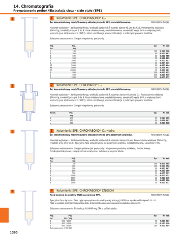 14. Chromatografia Przygotowanie próbek/Ekstrakcja ciecz - ciało stałe (SPE) 1 1 Kolumienki SPE, CHROMABOND® C18 Żel krzemionkowy modyfikowany oktadecylem do SPE, niestabilizowana. MACHEREY-NAGEL Materiał wyjściowy - żel krzemionkowy, wielkość porów 60 Å rozmiar ziarna 45 µm dla C18. Powierzchnia właściwa 500 m2/g; trwałość przy pH 2 do 8. Faza oktadecylowa, niestabilizowana, zawartość węgla 14% o większej ilości wolnych grup siloksanowych (SiOH), które umożliwiają wtórne interakcje z polarnymi grupami analitów. Zalecane zastosowania: Związki niepolarne, pestycydy. Poj. mL 1 3 3 6 6 6 15 45 70 3 6 6 2 2 Poj. mg 100 200 500 500 2000 1000 2000 5000 10000 500 500 1000 Op. Nr kat. 100 50 50 30 30 30 20 20 10 250 250 250 6.226 798 9.003 487 9.003 488 6.902 222 4.003 512 6.234 031 4.003 464 6.700 747 4.003 561 4.003 433 4.003 435 4.003 437 Kolumienki SPE, CHROMAFIX® C18 Żel krzemionkowy modyfikowany oktadecylem do SPE, niestabilizowany. MACHEREY-NAGEL Materiał wyjściowy - żel krzemionkowy, wielkość porów 60 Å, rozmiar ziarna 45 µm dla C18. Powierzchnia właściwa 500 m2/g, trwałość przy pH 2 do 8. Faza oktadecylowa, niestabilizowana, zawartość węgla 14% o większej ilości wolnych grup siloksanowych (SiOH), które umożliwiają wtórne interakcje z polarnymi grupami analitów. Zalecane zastosowania: Związki niepolarne, pestycydy. Rozm. S M L 3 3 Poj. mg 270 530 950 Op. Nr kat. 50 50 50 7.083 665 7.079 617 4.003 838 Kolumienki SPE, CHROMABOND® C18 Hydra Żel krzemionkowy modyfikowany oktadecylem do SPE polarnych analitów. MACHEREY-NAGEL Materiał wyjściowy - żel krzemionkowy, wielkość porów 60 Å, rozmiar ziarna 45 µm. Powierzchnia właściwa 500 m2/g, trwałość przy pH 2 do 8. Specjalna faza oktadecylowa do polarnych analitów, niestabilizowana, zawartość 15%. Zalecane zastosowania: Związki polarne jak pestycydy i ich polarne produkty rozkładu, fenole, kwasy fenoksykarboksylowe, związki nitroaromatyczne, substancje czynne leków. Poj. mL 1 1 3 3 6 3 6 6 6 4 4 Poj. mg 50 100 200 500 500 1000 1000 2000 3000 Op. Nr kat. 100 100 50 50 30 50 30 30 30 4.003 565 4.003 566 4.003 567 4.003 569 4.003 573 4.003 571 4.003 575 4.003 576 4.003 577 Kolumienki SPE, CHROMABOND® CN/SiOH Faza łączona do analizy WWA za pomocą SPE. MACHEREY-NAGEL Specjalna faza łączona. Faza cyjanopropylowa do selektywnej adsorpcji WWA w wyniku oddziaływań Π - Π. Faza w postaci niemodyfikowanego żelu krzemionkowego do usuwania związków polarnych. Zalecane zastosowania: Ekstrakcja 16 WWA wg EPA z próbek gleby. Poj. mL 3 6 6 Poj. mL / mg 500 / 1000 500 / 1000 500 / 1000 Duże opakowanie: 4.003 514 1360 Op. Nr kat. 50 30 250 4.003 507 6.233 128 4.003 514 14. Chromatografia Przygotowanie próbek/Ekstrakcja ciecz - ciało stałe (SPE) 1 Kolumienki SPE, CHROMABOND® HR-X Żel sferyczny, hydrofobowy, kopolimer polistyren-diwinylobenzen do SPE 1 MACHEREY-NAGEL Hydrofobowy kopolimer styrenu i diwinylobenzenu. Trwały przy pH od 1 do 14. Materiał o wysokiej czystości, najwyższej powtarzalności właściwości, o niskich wartościach tła. Ziarna sferyczne 85 µm; wielkość porów 55 do 60 Å; duża powierzchnia właściwa 1000 m2/g; pojemność 390 mg/g (kofeina w wodzie). Wysoki odzysk, szczególnie przy zatężaniu leków/składników aktywnych, dzięki sferycznemu kształtowi cząstek, wyjątkowo jednorodnej powierzchni i optymalnej strukturze porów. Zalecane zastosowania: Narkotyki i substancje czynne leków obecne w kremach, wodzie i ściekach, moczu, krwi, osoczu i analizie śladowej pestycydów. Poj. mL 1 3 1 6 3 15 15 3 6 Poj. mg 30 60 100 200 500 500 1000 200 200 Op. Nr kat. 30 30 30 30 30 20 20 250 250 4.003 808 4.003 811 4.003 809 4.003 814 4.003 813 4.003 819 4.003 820 4.003 806 4.003 815 Duże opakowanie: 4.003 806/4.003 815. Inne wypełnienia, fazy, rozmiary do HR-X dostepne na życzenie. 2 Kolumienki SPE, CHROMABOND® NH2 Żel krzemionkowy modyfikowany aminopropylem do SPE 2 MACHEREY-NAGEL Materiał wyjściowy - żel krzemionkowy, wielkość porów 60 Å, rozmiar ziarna 45 µm. Powierzchnia właściwa 500 m2/g, trwałość przy pH 2 do 8. Faza aminopropylowa, zawartość węgla 3,5 %, polarna, słaby wymieniacz anionów. Zalecane zastosowania: Analiza śladowa, lipidy. Poj. mL 1 3 3 3 6 6 Poj. mg 100 200 500 500 500 1000 Op. Nr kat. 100 50 50 250 30 30 4.003 465 4.003 609 6.228 063 4.003 466 6.224 868 6.224 845 Duże opakowanie: 4.003 466. 3 Kolumienki SPE, CHROMABOND® SiOH Żel krzemionkowy niemodyfikowany do SPE. 3 MACHEREY-NAGEL Niemodyfikowany, słabo kwaśny żel krzemionkowy, wielkość porów 60 Å, rozmiar ziarna 45 µm. Powierzchnia właściwa 500 m2/g, trwałość przy pH 2 do 8. Bardzo polarny. Adsorbuje wilgoć z powietrza, z tego względu powinien być bardzo dokładnie zamykany i jeżeli to potrzebne, suszony przed użyciem. Z powodu tego wysokiego powinowactwa do związków polarnych nie powinien być kondycjonowany rozpuszczalnikami polarnymi (np. metanolem) lub rozpuszczalnikami zawierającymi wodę. Zalecane zastosowania: aflatoksyny, chloramfenikol, pestycydy, steroidy, witaminy. Poj. mL 1 3 3 6 6 6 15 45 70 150 3 6 6 Poj. mg 100 200 500 500 1000 2000 2000 5000 10000 50000 500 1000 2000 Op. Nr kat. 100 50 50 30 30 30 20 20 10 10 250 250 250 6.225 223 4.003 547 7.085 047 6.801 894 4.003 481 4.003 498 4.003 550 4.003 605 6.202 850 4.003 630 4.003 477 4.003 482 4.003 499 Duże opakowanie: 4.003 477/4.003 482/4.003 499 1361 14. Chromatografia Przygotowanie próbek/Ekstrakcja ciecz - ciało stałe (SPE) 1 1 Kolumienki SPE, CHROMABOND® Florisil® MACHEREY-NAGEL Krzemian magnezu do SPE. Krzemian magnezu (MgO-SiOH 15:85), o wysokiej czystości, rozmiar ziarna 150 - 250 µm. Zalecane zastosowania: organiczne związki cyny, alifatyczne kwasy karboksylowe, PCB, WWA Poj. mL 3 3 6 6 6 6* Poj. mg 200 500 500 1000 1000 1000 Op. Nr kat. 50 50 30 30 250 30 4.003 624 4.003 488 4.003 557 6.224 842 4.003 489 4.003 490 Duże opakowanie: 4.003 489.