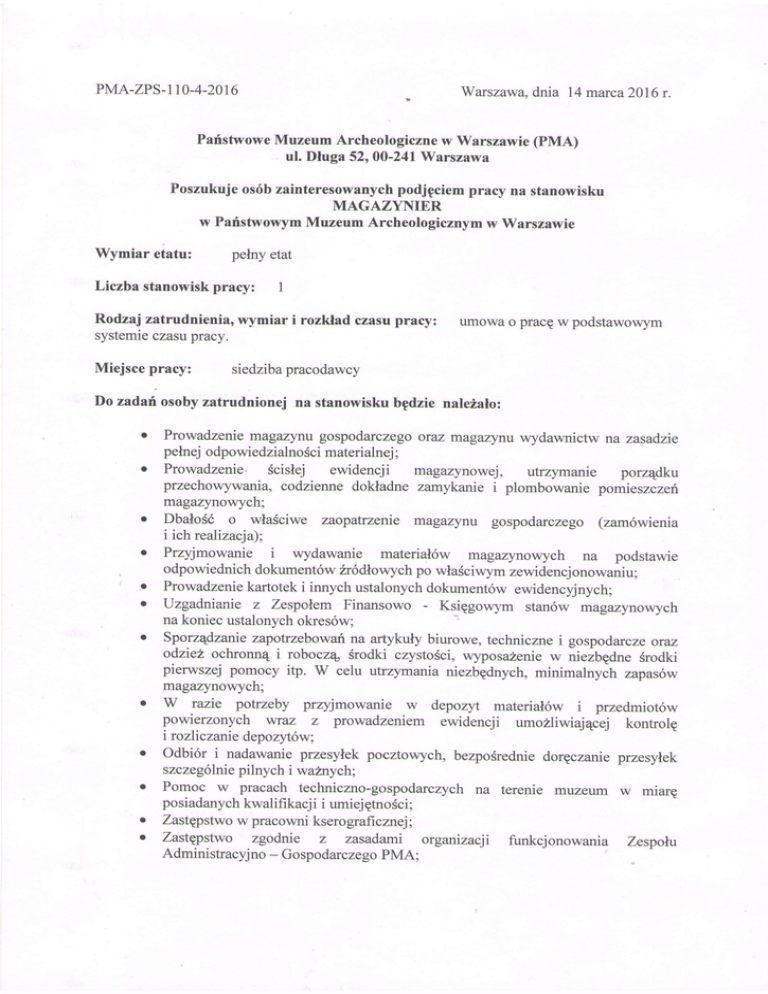PMA-ZPS-I10-4-20T6 Warszawa,dnia 14 marca2016 r. ParistwoweMuzeum Archeologicznew Warszawie (pMA) ul. Dluga 52, 00-241 Warszawa Poszukuje os6b zainteresowanychpodjpciem pracy na stanowisku MAGAZYNIER w ParfistwowymMuzeum Archeologicznym w Warszawie Wymiar etatu: pelny etat Liczba stanowisk pracy: 1 Rodzaj zatrudnienia, wymiar i rozklad czasu pracy: systemieczasupracy. Miejsce pracy: umowa o pracg w podstawowym siedzibapracodawcy Do zadarflosoby zatrudnionej na stanowisku bgdzie naleialo: o o t o o o o o o o Prowadzenie magazynu gospodarczego oraz magazynu wydawnictw na zasadzie pelnej odpowiedzialnoScimaterialnej; Prowadzenie" scislej ewidencji magazynowej, utrzyrnanie porzqdku przechowywania, codzienne dokladne zarnykanie i plombowanie pomieszczeri magazynowych; Dbalo56 o wla6ciwe zaopatrzenie magazynu gospodarczego (zam6wienia i ich realizacja); Przyjmowanie i wydawanie material6w magazynowych na podstawie odpowiednich dokument6w 2r6dlowychpo wlasciwym zewidencjonowaniu; Prowadzeniekartotek i innych ustalonych dokument6w ewidencyjnych; uzgadnianie z zespokem Finansowo - KsiEgowym stan6w magazynowych na koniec ustalonychokres6w; Sporzqdzaniezapotrzebowarina artykuly biurowe, techniczne i gospodarcze oraz odzieL ochronn4 i robocz4 Srodki czystoSci, wyposaZenie w nieibgdne Srodki pierwszej pomocy itp. W celu utrzymania niezbgdnych, minimalnych zapas6w magazynowych; w razie potrzeby przyjmowanie w depozyt material6w i przedmiot6w powierzonych wraz z prowadzeniem ewidencji umozliwiajqcej kontrolg i r o zliczanie depozyt6w ; Odbi6r i nadawanie przesylek pocztowych, bezpoSredniedorgczanie przesylek szczeg6lnie pilnych i w a2nych; Pomoc w pracach techniczno-gospodarczych na terenie muzeum w miare posiadanychkwalifikacj i i umiej EtnoSci; ZastQpstwow pracowni kserograficznej; ZastQpstwo zgodnie z zasadami organizacji funkcjonowania Zespolu Administracyjno - Gospodarczego PMA; Wymagania zvriqzaneze stanowiskiem pracy: o o o wyksztalcenieminimum: Srednie umieiQtno$6obslugi komputera, prawo jazdy kat. B Wymagane dokumenty i o5wiadczenia: o o o o r CV i list motywacyjny, doSwiadczeniezawodowe, kserokopie dokument6w potwierdzaiQcychwyksztalcenie, kserokopie zaSwiadczefio ukoriczonychkursach, szkoleniach, podpisaneoSwiadczenieo wyra:Zeniuzgody naprzetwarzaniedanych osobowych o nastgpujqcejtreSci: ,,Wyraiam zgodq na przetwarzanie zawartych w dokumentach aplikncyjnych moich danych osobowych dla potrzeb procesu relcrutacji prowadzonego przez Paristwowe Muzeum Archeologiczne w Warszawie,zgodnie z postanowieniami ustawy z 29 sierpnia 1997 roku o ochronie danych osobowych (tj.Dz.U. z 2015r.,poz. 2135 z p6in. zm.). Przekazujemoje dane dobrowolnie 'majqc iwiadomofi1, 2e w kaidej chwili przystuguje mi prawo wglqdu do moich danych oraz ich poprawiania lub usuniqcia. Zqdanie usuniqcia danych oznacza rezygnacjq z dalszego udzialu w procesach relvutacyjnych i spowoduje nienvloczne usuniqciemoich danych". Miejsce i forma skladania dokument6w: Dokumenty nale?y sklada6 w zamkniEtej kopercie z dopiskiem ,,dotyczy naboru na stanowisko - magazynier" w sekretariacieParistwowegoMuzeum Archeologicznego, ul. Dluga 52,00-241Warszawa,w terminie do dnia 31 marca 2016 roku do godz. 15.00 Postgpowaniez dokumentami: Dokumenty kandydata, kt6ry nie zostal zatwierdzony do przyjEcia na stanowisko objgte rekrutacja s4przechowywane przez okres 3 miesiEcy od dnia nawi44ania stosunku pracy z osoba wylonion4 w drodze rekrutacji. W w/w lgesie kandydaci moge dokonywa6 odbioru dokument6w za potwierdzeniem odbioru.".PMA nie odsyla dokument6w kandydatom, z wyj4tkiem zlohonych przez kandydat6w w ofertach oryginal6w dokument6w. Po uplywie dw okresu dokumenty kandydat6w sqprotokolarnie niszczone. Informacje dodatkowe: Oferty, kt6re wplynq do PMA po wyZej okreSlonS,mterminie nie bEdq rozpatrywane (o zachowaniuterminu decyduje data wplywu oferty do PMA). Po uplywie terminu do zloheniadokument6w zostanieustalona lista kandydat6w, ktlrzy spelniaj4wymagarriaformalne okre6lonew ogloszeniuo rekrutacji. Kandydaci umieszczeni na w/w liScie zostanq poinformowani telefonicznie o terminie przeprowadzeniarozmowy kwalifikacyjnej, kt6ra odbqdzie siE w Paristwowym Muzeum Archeologicznpw Warszawie,ul. Dluga 52. Kandydaci, kt6rzy nie zostan4zakwalifikowani do rozmowy kwalifikacyjnej bEd4 o tym fakcie powiadomieni w formie pisemnej. Kandydat zatvmerdzonydo przyjgcia na stanowisko objEte rekrutacj4 jest niezwloczrie zawiadamiany o tym fakcie listem poleconym za zwrotnym potwierdzeniem odbioru lub telefonicznie. Pozostalikandydaciuczestniczqcy w rekrutacjiotrzymujqpisemnezawiadomieniawraz zpodzigkowaniem zaudzialwrekrutacji.' Dyrektor PMA zastnega sobie prawo pnerwania lub odwolania rekrutacji na wolne stanowiskopracy- w kaZdymczasie,bezpodaniaprzyczyny. Informacjao wyniku rekr,utacjizostanieumieszczona w BiuletynieInformacjiPublicznej orazna tablicy og,loszeri PMA. Dodatkoweinformacjemohnauzyskaipod numeremtel. 22-635-74-72,22-50-44-834.