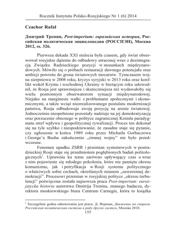 Rocznik Instytutu Polsko-Rosyjskiego Nr 1 (6) 2014 Czachor Rafał Дмитрий Тренин, Post-imperium: евразийская история, Российская политическая энциклопедия (РОССПЭН), Москва 2012, ss. 326. Pierwsza dekada XXI stulecia była czasem, gdy świat obserwował rosyjskie dążenia do odbudowy utraconej wraz z dezintegracją Związku Radzieckiego pozycji w stosunkach międzynarodowych. Mówiło się o próbach restauracji dawnego potencjału oraz ambicji powrotu do grona światowych mocarstw. Tymczasem wojna sierpniowa w 2008 roku, kryzys syryjski w 2013 roku oraz konflikt wokół Krymu i wschodniej Ukrainy w bieżącym roku udowodnił, że Rosja jest sprawniejsza i skuteczniejsza niż wydawałoby się wielu postronnym obserwatorom sytuacji międzynarodowej. Niejako na marginesie walki z problemami społecznymi i ekonomicznymi, a także wciąż niezrealizowanego postulatu modernizacji państwa, Rosja odbudowuje swoją pozycję na arenie światowej. Jednocześnie niespełnione pozostały nadzieje na jej demokratyzację oraz porzucenie obecnego w polityce zagranicznej Kremla paradygmatu stref wpływu i geopolitycznej rywalizacji. Proces ten dokonał się na tyle szybko i niespodziewanie, że zasadne staje się pytanie, czy ogłoszone w końcu 1989 roku przez Michaiła Gorbaczowa i George’a Busha zakończenie „zimnej wojny” nie było przedwczesne. Fenomen upadku ZSRR i przemian systemowych w postradzieckiej Rosji staje się przedmiotem pogłębionych badań politologicznych1. Uprawnia ku temu zarówno upływający czas a wraz z nim pojawienie się młodego pokolenia, które nie pamięta okresu komunizmu, jak i petryfikacja w Rosji systemu politycznego o właściwych sobie cechach, określanych mianem „suwerennej demokracji”. Procesowi przemian w rosyjskiej polityce „okresu turbulencji” poświęcona została najnowsza praca Post-imperium: eurazjatycka historia autorstwa Dmitrija Trenina, znanego badacza, dyrektora moskiewskiego biura Centrum Carnegie, która to książka 1 Szczególnie godna odnotowania jest praca: Д. Фурман, Движение по спирали. Российская политическая система в ряду других систем, Москва 2010. 155 Rocznik Instytutu Polsko-Rosyjskiego Nr 1 (6) 2014 została wydana w języku angielskim oraz rosyjskim (w tym drugim języku przez uznane wydawnictwo Rosyjska Encyklopedia Polityczna). W potoczystej narracji rosyjski badacz zabiera Czytelnika w podróż przez minione dwudziestolecie, dzieląc się cennymi obserwacjami na temat zmian w życiu politycznym Rosji, działań na rzecz odbudowy jej pozycji w środowisku międzynarodowym, zwłaszcza w przestrzeni WNP. Na książkę składa się obszerne wprowadzenie, 5 rozdziałów problemowych i zakończenie. Ma ona charakter raczej popularnonaukowy, jednak ze względu na rzetelność autora, celność jego obserwacji i wywodów, może być ważnym materiałem uzupełniającym badania nad współczesną Rosją i przestrzenią postradziecką. Jak stwierdza sam autor, jest to praca o tym, jak rozwijała się Rosja i przestrzeń postradziecka po rozpadzie ZSRR w 1991 roku. Trenin zaznacza, że upadek radzieckiego imperium przyjął, podobnie jak i wielu innych jego obywateli, z nadziejami, jednak dynamika przemian i ich głębokość szybko spowodowały, że optymizm ustąpił miejsca niepewności. Lata 1990-1991 przyniosły tworzącej rdzeń ZSRR Rosji okres bezprecedensowego upadku i wewnętrznego wstrząsu, przede wszystkim w wymiarze prestiżowego upadku autorytetu na arenie międzynarodowej. Kolejne lata oznaczały niejednokrotnie wewnętrzne sprzeczne poszukiwanie dróg odbudowy statusu w społeczności międzynarodowej oraz kształtowania nowego systemu politycznego. Poprowadzona wartkim językiem narracja odnosi się właśnie do tych dwóch zjawisk. We wprowadzeniu rosyjski politolog nie odnosi się do przesłanek dezintegracji Związku Radzieckiego, koncentrując się na wskazaniu głównych etapów szybkiej utraty pozycji na arenie światowej przez to państwo. Co istotne, autor zaznacza, że Rosja nie szuka dróg odbudowy swojego potencjału – dąży raczej do jego potwierdzenia poprzez rzucanie wyzwania Zachodowi, m.in. roszczenie sobie prawa do politycznego i gospodarczego kontrolowania obszaru byłego ZSRR. Sam proces rozpadu państwa radzieckiego Trenin porównuje do szybkiego zatonięcia „Titanica”: od wyprowadzenia wojsk z Afganistanu do ostatecznego rozwiązania ZSRR minęły zaledwie 34 miesiące. Mimo peryferyjnych konfliktów, które rozgorzały w momencie dezintegracji państwa radzieckiego (m.in. wojna w Górskim 156 Rocznik Instytutu Polsko-Rosyjskiego Nr 1 (6) 2014 Karabachu, Abchazji, wojna czeczeńska, wojna domowa w Tadżykistanie), proces rozpadu dawnego imperium dokonał się stosunkowo sprawnie (s. 31). Nie licząc konfliktu karabaskiego i wojny sierpniowej w 2008 roku, przestrzeń postradziecka ponad dwie dekady nie doznawała większych wstrząsów i perturbacji, a społeczność międzynarodowa nie musiała się obawiać m.in. niekontrolowanego rozprzestrzeniania się dawnego radzieckiego arsenału jądrowego. Dmitrij Trenin przyczyn tego faktu upatruje w tym, że procesy dezintegracyjne były kontrolowane przez dawną metropolię – Rosję. Rosyjskie władze powstrzymały się w latach 90. od wzniecania nastrojów separatystycznych na Krymie czy w północnym Kazachstanie. Jednocześnie płonne okazały się nadzieje, że wszystkie republiki postradzieckie z sukcesem dokonają demokratyzacji i wpiszą się w Fukuyamowski „koniec historii”. Badacz zaznacza, że choć rozpad ZSRR wynikał z wewnętrznych uwarunkowań, to jego główne ogniwo, Rosja, nie została pokonana w wojnie, nie odniosła istotnych strat ludnościowych i gospodarczych. Rosja, jako rdzeń ZSRR, przegrała bipolarną rywalizację światową, jednakże nie została na t