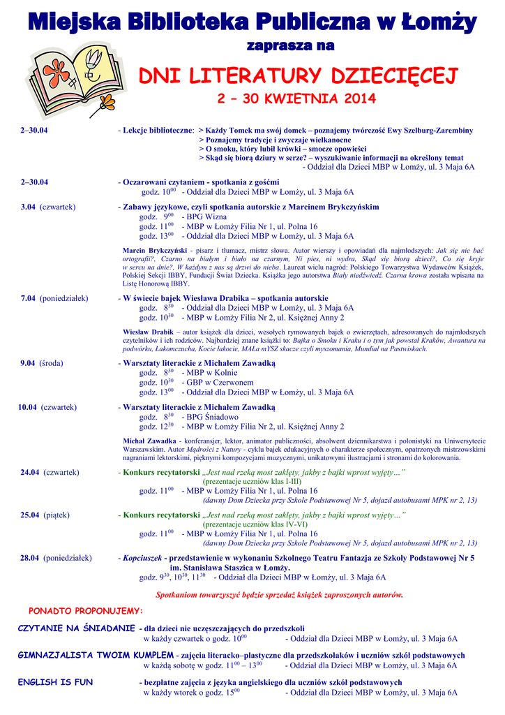 Miejska Biblioteka Publiczna w Łomży zaprasza na DNI LITERATURY DZIECIĘCEJ 2 – 30 KWIETNIA 2014 2–30.04 - Lekcje biblioteczne: > Każdy Tomek ma swój domek – poznajemy twórczość Ewy Szelburg-Zarembiny > Poznajemy tradycje i zwyczaje wielkanocne > O smoku, który lubił krówki – smocze opowieści > Skąd się biorą dziury w serze? – wyszukiwanie informacji na określony temat - Oddział dla Dzieci MBP w Łomży, ul. 3 Maja 6A 2–30.04 - Oczarowani czytaniem - spotkania z gośćmi godz. 1000 - Oddział dla Dzieci MBP w Łomży, ul. 3 Maja 6A 3.04 (czwartek) - Zabawy językowe, czyli spotkania autorskie z Marcinem Brykczyńskim godz. 900 - BPG Wizna godz. 1100 - MBP w Łomży Filia Nr 1, ul. Polna 16 godz. 1300 - Oddział dla Dzieci MBP w Łomży, ul. 3 Maja 6A Marcin Brykczyński - pisarz i tłumacz, mistrz słowa. Autor wierszy i opowiadań dla najmłodszych: Jak się nie bać ortografii?, Czarno na białym i biało na czarnym, Ni pies, ni wydra, Skąd się biorą dzieci?, Co się kryje w sercu na dnie?, W każdym z nas są drzwi do nieba. Laureat wielu nagród: Polskiego Towarzystwa Wydawców Książek, Polskiej Sekcji IBBY, Fundacji Świat Dziecka. Książka jego autorstwa Biały niedźwiedź. Czarna krowa została wpisana na Listę Honorową IBBY. 7.04 (poniedziałek) - W świecie bajek Wiesława Drabika – spotkania autorskie godz. 830 - Oddział dla Dzieci MBP w Łomży, ul. 3 Maja 6A godz. 1030 - MBP w Łomży Filia Nr 2, ul. Księżnej Anny 2 Wiesław Drabik – autor książek dla dzieci, wesołych rymowanych bajek o zwierzętach, adresowanych do najmłodszych czytelników i ich rodziców. Najbardziej znane książki to: Bajka o Smoku i Kraku i o tym jak powstał Kraków, Awantura na podwórku, Łakomczucha, Kocie łakocie, MAŁa mYSZ skacze czyli myszomania, Mundial na Pastwiskach. 9.04 (środa) 10.04 (czwartek) - Warsztaty literackie z Michałem Zawadką godz. 830 - MBP w Kolnie godz. 1030 - GBP w Czerwonem godz. 1300 - Oddział dla Dzieci MBP w Łomży, ul. 3 Maja 6A - Warsztaty literackie z Michałem Zawadką godz. 830 - BPG Śniadowo godz. 1230 - MBP w Łomży Filia Nr 2, ul. Księżnej Anny 2 Michał Zawadka - konferansjer, lektor, animator publiczności, absolwent dziennikarstwa i polonistyki na Uniwersytecie Warszawskim. Autor Mądrości z Natury - cyklu bajek edukacyjnych o charakterze społecznym, opatrzonych mistrzowskimi nagraniami lektorskimi, pięknymi kompozycjami muzycznymi, unikatowymi ilustracjami i stronami do kolorowania. 24.04 (czwartek) - Konkurs recytatorski „Jest nad rzeką most zaklęty, jakby z bajki wprost wyjęty…” (prezentacje uczniów klas I-III) godz. 11 00 - MBP w Łomży Filia Nr 1, ul. Polna 16 (dawny Dom Dziecka przy Szkole Podstawowej Nr 5, dojazd autobusami MPK nr 2, 13) 25.04 (piątek) - Konkurs recytatorski „Jest nad rzeką most zaklęty, jakby z bajki wprost wyjęty…” (prezentacje uczniów klas IV-VI) godz. 11 00 - MBP w Łomży Filia Nr 1, ul. Polna 16 (dawny Dom Dziecka przy Szkole Podstawowej Nr 5, dojazd autobusami MPK nr 2, 13) 28.04 (poniedziałek) - Kopciuszek - przedstawienie w wykonaniu Szkolnego Teatru Fantazja ze Szkoły Podstawowej Nr 5 im. Stanisława Staszica w Łomży. 30 godz. 9 , 1030, 1130 - Oddział dla Dzieci MBP w Łomży, ul. 3 Maja 6A Spotkaniom towarzyszyć będzie sprzedaż książek zaproszonych autorów. PONADTO PROPONUJEMY: CZYTANIE NA ŚNIADANIE - dla dzieci nie uczęszczających do przedszkoli w każdy czwartek o godz. 1000 - Oddział dla Dzieci MBP w Łomży, ul. 3 Maja 6A GIMNAZJALISTA TWOIM KUMPLEM - zajęcia literacko–plastyczne dla przedszkolaków i uczniów szkół podstawowych w każdą sobotę w godz. 1100 – 1300 - Oddział dla Dzieci MBP w Łomży, ul. 3 Maja 6A ENGLISH IS FUN - bezpłatne zajęcia z języka angielskiego dla uczniów szkół podstawowych w każdy wtorek o godz. 1500 - Oddział dla Dzieci MBP w Łomży, ul. 3 Maja 6A