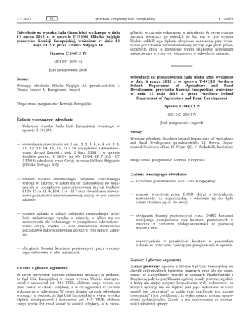 7.7.2012 PL Dziennik Urzędowy Unii Europejskiej Odwołanie od wyroku Sądu (ósma izba) wydanego w dniu 15 marca 2012 r. w sprawie T-391/08 Ellinika Nafpigia przeciwko Komisji Europejskiej, wniesione w dniu 18 maja 2012 r. przez Ellinika Nafpigia AE (Sprawa C-246/12 P) C 200/9 gólności w zakresie wskazanym w odwołaniu. W swym trzecim zarzucie wnoszący go twierdzi, że Sąd ten w tym wyroku błędnie oddalił jego żądanie dotyczące naruszenia przy wyda waniu początkowo zakwestionowanej decyzji jego praw proce duralnych, które to naruszenie winno skutkować uchyleniem zaskarżonego wyroku we wskazanym w odwołaniu zakresie. (2012/C 200/16) Język postępowania: grecki Strony Wnoszący odwołanie: Ellinika Nafpigia AE (przedstawiciele: I. Drosos, lawyer, V. Karagiannis, lawyer) Odwołanie od postanowienia Sądu (ósma izba) wydanego w dniu 6 marca 2012 r. w sprawie T-453/10 Northern Ireland Department of Agriculture and Rural Development przeciwko Komisji Europejskiej, wniesione w dniu 22 maja 2012 r. przez Northern Ireland Department of Agriculture and Rural Development Druga strona postępowania: Komisja Europejska (Sprawa C-248/12 P) (2012/C 200/17) Żądania wnoszącego odwołanie — Uchylenie wyroku Sądu Unii Europejskiej wydanego w sprawie Τ-391/08; — stwierdzenie nieważności art. 1 ust. 2, 2, 3, 5, 6, 8 ust. 2, 9, 11, 12, 13, 14, 15, 16, 18 i 19 początkowo zakwestiono wanej decyzji Komisji z dnia 2 lipca 2008 r. w sprawie środków pomocy C 16/04 (ex NN 29/04, CP 71/02 i CP 133/05) udzielonej przez Grecję na rzecz Hellenic Shipyards [Ellinika Nafpigia A.E]; — tytułem żądania ewentualnego, uchylenie zaskarżonego wyroku w zakresie, w jakim ma on zastosowanie do wska zanych w początkowo zakwestionowanej decyzji środków Ε12b, Ε13a, Ε13b, Ε14, Ε16 i Ε17 oraz stwierdzenie nieważ ności początkowo zakwestionowanej decyzji w tym samym zakresie; — tytułem żądania w dalszej kolejności ewentualnego, uchy lenie zaskarżonego wyroku w zakresie, w jakim ma on zastosowanie do wskazanego w początkowo zakwestiono wanej decyzji środka Ε7 oraz stwierdzenie nieważności początkowo zakwestionowanej decyzji w tym samym zakre sie; — obciążenie Komisji kosztami poniesionymi przez wnoszą cego odwołanie w obu instancjach. Język postępowania: angielski Strony Wnoszący odwołanie: Northern Ireland Department of Agriculture and Rural Development (przedstawiciele: K.J. Brown, Depar tmental Solicitor's office, D. Wyatt QC, V. Wakefield, Barristers): Druga strona postępowania: Komisja Europejska Żądania wnoszącego odwołanie — Uchylenie postanowienia Sądu Unii Europejskiej; — uznanie wniesionej przez DARD skargi o stwierdzenie nieważności za dopuszczalną i odesłanie jej do Sądu celem zbadania jej co do istoty; — obciążenie Komisji poniesionymi przez DARD kosztami niniejszego postępowania oraz kosztami poniesionych w związku z zarzutem niedopuszczalności w pierwszej instancji oraz — rozstrzygnięcie w przedmiocie kosztów w pozostałym zakresie w orzeczeniu kończącym postępowanie w sprawie. Zarzuty i główne argumenty Zarzuty i główne argumenty W swym pierwszym zarzucie odwołania wnoszący je podnosi, że Sąd Unii Europejskiej w swym wyroku błędnie zinterpre tował i zastosował art. 346 TFUE, efektem czego wyrok ten musi zostać w całości uchylony, a w szczególności w zakresie wskazanym w odwołaniu. W swym drugim zarzucie odwołania wnoszący je podnosi, że Sąd Unii Europejskiej w swym wyroku błędnie zinterpretował i zastosował art. 348 TFUE, efektem czego wyrok ten musi zostać w całości uchylony, a w szcze Zarzut pierwszy, zgodnie z którym Sąd Unii Europejskiej nie określił odpowiednich kryteriów prawnych oraz ich nie zasto sował; w szczególności wyroki w sprawach Piraiki-Patraiki i Dreyfus są jedynie przykładami ogólnej zasady prawnej, zgodnie z którą akt unijny dotyczy bezpośrednio tych podmiotów, na których sytuację ma on wpływ, jeśli jego wykonanie w dany sposób jest „oczywiste”, a każda inna możliwość jest „czysto teoretyczna” i jest „ewidentne”, że wykorzystane zostaną upraw nienia dyskrecjonalne. Zasada ta ma zastosowanie do okolicz ności niniejszej sprawy.