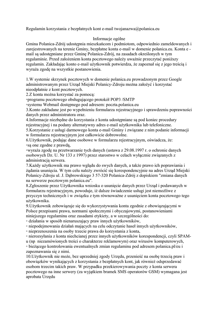 Regulamin korzystania z bezpłatnych kont e-mail [email protected] Informacje ogólne Gmina Polanica-Zdrój udostępnia mieszkańcom i podmiotom, odpowiednio zameldowanych i zarejestrowanych na terenie Gminy, bezpłatne konta e-mail w domenie polanica.eu. Konta e mail są udostępniane przez Gminę Polanica-Zdrój, na zasadach określonych w tym regulaminie. Przed założeniem konta pocztowego należy uważnie przeczytać poniższy regulamin. Zakładając konto e-mail użytkownik potwierdza, że zapoznał się z jego treścią i wyraża zgodę na wszystkie postanowienia. 1.W systemie skrzynek pocztowych w domenie polanica.eu prowadzonym przez Google administrowanym przez Urząd Miejski Polanicy-Zdroju można założyć i korzystać nieodpłatnie z kont pocztowych. 2.Z konta można korzystać za pomocą: ◦programu pocztowego obsługującego protokół POP3 /SMTP ◦systemu Webmail dostępnego pod adresem: poczta.polanica.eu 3.Konto zakładane jest po wypełnieniu formularza rejestracyjnego i sprawdzeniu poprawności danych przez administratora oraz. 4.Informacje niezbędne do korzystania z konta udostępniane są pod koniec procedury rejestracyjnej i na podany alternatywny adres e-mail użytkownika lub telefoniczne. 5.Korzystanie z usługi darmowego konta e-mail Gminy i związane z nim podanie informacji w formularzu rejestracyjnym jest całkowicie dobrowolne. 6.Użytkownik, podając dane osobowe w formularzu rejestracyjnym, oświadcza, że: ◦są one zgodne z prawdą, ◦wyraża zgodę na przetwarzanie tych danych (ustawa z 29.08.1997 r. o ochronie danych osobowych Dz. U. Nr 133 z 1997) przez starostwo w celach wyłącznie związanych z administracją serwera. 7.Każdy użytkownik ma prawo wglądu do swych danych, a także prawo ich poprawiania i żądania usunięcia. W tym celu należy zwrócić się korespondencyjnie na adres Urząd Miejski Polanicy-Zdroju ul. J. Dąbrowskiego 3 57-320 Polanica-Zdrój z dopiskiem "zmiana danych na serwerze pocztowym polanica.eu". 8.Zgłoszenie przez Użytkownika wniosku o usunięcie danych przez Urząd i podawanych w formularzu rejestracyjnym, powoduje, iż dalsze świadczenie usługi jest niemożliwe z przyczyn technicznych i w związku z tym równoważne z usunięciem konta pocztowego tego użytkownika. 9.Użytkownik zobowiązuje się do wykorzystywania konta zgodnie z obowiązującymi w Polsce przepisami prawa, normami społecznymi i obyczajowymi, postanowieniami niniejszego regulaminu oraz zasadami etykiety, a w szczególności do: ◦ działania w sposób nienaruszający praw innych użytkowników, ◦ niepodejmowania działań mających na celu odczytanie haseł innych użytkowników, ◦ nieprzenoszenia na osoby trzecie prawa do korzystania z konta, ◦ nierozsyłania z konta niechcianej przez innych użytkowników korespondencji, czyli SPAMu (np. niezamówionych treści o charakterze reklamowym) oraz wirusów komputerowych, ◦ bieżącego kontrolowania ewentualnych zmian regulaminu pod adresem polanica.pl/eu i zapoznawania się z nimi. 10.Użytkownik nie może, bez uprzedniej zgody Urzędu, przenieść na osobę trzecią praw i obowiązków wynikających z korzystania z bezpłatnych kont, jak również odsprzedawać osobom trzecim takich praw. W przypadku przekierowywania poczty z konta serwera pocztowego na inne serwery (za wyjątkiem bramek SMS operatorów GSM) wymagana jest aprobata Urzędu 11.Gmina Polanica-Zdrój nie ponosi odpowiedzialności za: ◦sposób, w jaki użytkownicy korzystają z kont pocztowych, ani za jakiekolwiek wynikłe z tego skutki, ◦pocztę wysłaną oraz przyjmowaną przez użytkowników, ◦jakiekolwiek szkody użytkownika wynikające z nieprawidłowego udostępniania bądź niemożności udostępniania jego konta, ◦skutki wynikłe z wejścia w posiadanie przez osoby trzecie hasła - użytkownika, niezależnie od przyczyny, która to spowodowała (np. udostępnienie hasła osobie trzeciej przez użytkownika, złamanie hasła przez osobę trzecią), ◦udostępnianie hasła i danych osobom upoważnionym na podstawie właściwych przepisów prawa, ◦informacje oraz materiały pobrane z sieci Internet ani za skutki ich wykorzystania, ◦bezprawne działania osób trzecich polegające na ingerencji w system komputerowy użytkownika w szczególności włamania i wirusy komputerowe. 12.Gmina Polanica-Zdrój zastrzega sobie prawo, a Użytkownik to prawo akceptuje do: ◦okresowego wyłączania systemu bez uprzedniego powiadomienia, ◦natychmiastowego zablokowania każdego konta, bez uprzedzenia, w wypadku naruszenia przez użytkownika regulaminu, ◦skasowania w sytuacjach wyjątkowych, wszystkiego co znajduje się na serwerze, ◦zablokowania na serwerze nadawców wiadomości lub całych domen i adresów IP w razie naruszenia dóbr Użytkowników serwera przez nadawców wiadomości z zewnątrz, w wypadku narażenia systemu na straty lub niestabilność lub w razie naruszenia Regulaminu, ◦całkowitego zaprzestania świadczenia bezpłatnych usług, po uprzednim powiadomieniu użytkowników, na stronach WWW. 13.W przypadku, gdy użytkownik podjął działania, które nie są zakazane przez ten regulamin, ale zostaną przez Gminę uznane za niepożądane, Gmina może zawiadomić użytkownika pocztą elektroniczną o tym fakcie, z żądaniem zaprzestania podejmowania tych działań. Jeżeli użytkownik nie zastosuje się niezwłocznie do tego żądania, traktowane to będzie jak naruszenie regulaminu. 14.Usuwane będą konta, w stosunku, do których ujawnione zostanie podanie w formularzu rejestracyjnym fałszywych danych osobowych. 15.Użytkownik ma prawo do rezygnacji z konta w każdym czasie, w szczególności, gdy nie zaakceptuje zmian wprowadzonych do regulaminu. 16.Wszelkie uwagi, komentarze i pytania związane z skrzynkami pocztowymi prosimy kierować na adres Urząd Miejski w Polanicy-Zdroju, ul. J. Dąbrowskiego 3, 57-320 PolanicaZdrój, e-mail: [email protected] Urząd udzieli odpowiedzi na zgłoszone zapyt