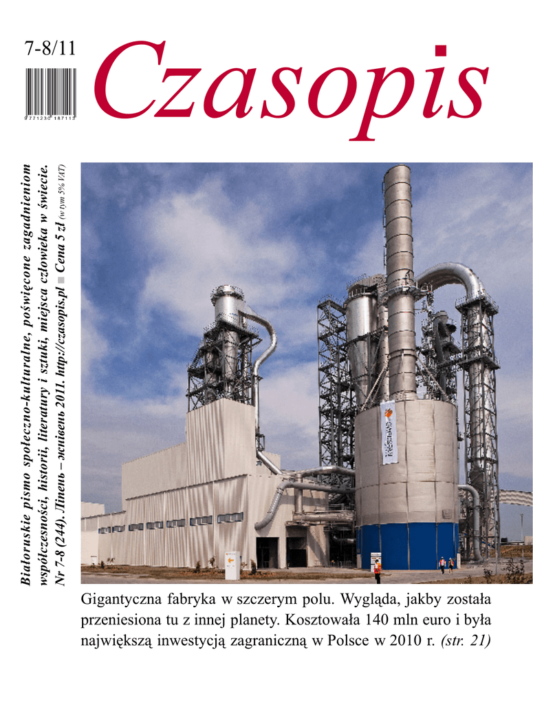 Białoruskie pismo społeczno-kulturalne, poświęcone zagadnieniom współczesności, historii, literatury i sztuki, miejsca człowieka w świecie. Nr 7-8 (244). Ліпень – жнівень 2011. http://czasopis.pl ■ Cena 5 zł (w tym 5% VAT) 7-8/11 Czasopis Gigantyczna fabryka w szczerym polu. Wygląda, jakby została przeniesiona tu z innej planety. Kosztowała 140 mln euro i była największą inwestycją zagraniczną w Polsce w 2010 r. (str. 21) ■Od Redaktora. Moją ulubioną lekturą stały się ostatnio „Kalendarze Białoruskie”. Dziś już niemal zapomniane, dawniej były obecne w wielu białoruskich domach na Białostocczyźnie... str. 4 ■Сукрат Яновіч. Чаго мы хочам? Пачаліся юбілеі, адзін за адным (будуць да канца чэрвеня або сярэдзіны лета). Беларусы кахаюць гадавіны і юбілеі, як усе бедныя лю... str. 5 ■Аляксандар Максімюк. Яшчэ адна пляма ганьбы. З выхадам гэтага нумару ў краіне фармальна закончыцца перапіс насельніцтва, які ў другі раз у новай дэмакратычна... str. 7 Pomysł na jarmark przyszedł nam do głowy jesienią, kiedy siedzieliśmy u Darka Fionika w kuchni. Chcieliśmy wydarzenia z nową, nieludową... (str. 23) ■Tamara Bołdak-Janowska. Przygnębienie. 2. Każdy ustrój posiada własną przeciętność, którą popiera. Przeciętność białoruska jest pro-Łukaszenkowa. Przeciętność ta chce utrzy... str. 8 ■Janusz Korbel. Przejąć się losem krajobrazów. W książce pewnego amerykańskiego historyka i ekonomisty zwróciłem uwagę na zdanie: „Jeśli nie ma planów, ziemia trafia... str. 10 ■Opinie, cytaty. З 1986 года, калі я першы раз паехаў у Беларусь, у Гродна, адчуў сябе тады шчаслівым чалавекам. 25 гадоў, калі толькі была магчымасць, падарожнічаў... str. 12 ■Minął miesiąc. W regionie. Skandaliczne przykłady praktyk rachmistrzów spisowych w odniesieniu do informacji o narodowość oraz język ojczysty mieszkańców Podlasia ujawn... str. 12 ■Kolos w szczerym polu. Bezrobocie to teraz najpoważniejPrzed jedenastu laty Katarzyna Bielawska z Narewki i dziennikarz radiowy Jerzy Leszczyński w filmie Mikołaja Wawrzeniuka „Śniła mi się Hana” B... (str. 27) szy problem w naszym regionie, dlatego walka z nim wciąż jest priorytetem władz, a każda inwestycja stwarz... str. 21 ■Bielska lekcja historii. Pomysł na jarmark przyszedł nam do głowy jesienią, kiedy siedzieliśmy u Darka Fionika w kuchni. Chcieliśmy wydarzenia z nową, nieludo... str. 23 ■Dlaczego korowód? Rozważania na marginesie podlaskopoleskich spotkań „Tam po majowuj rosi”. Ne nastupaj, litwa, bude z wamy bitwa.Budem byty, wojowaty, diwonku n... str. 25 ■Macewy wracają na cmentarz. Przed jedenastu laty Katarzyna Bielawska z Narewki i dziennikarz radiowy Jerzy Leszczyński w filmie Mikołaja Wawrzeniuka „Śnił... str. 27 ■Zadziwiająca żydowska Białoruś. W ciągu dziesięciu dni odwiedziliśmy 29 miast i miasteczek białoruskich, by zdokumentować zachowane w nich zabytki żydowskie... str. 29 ■Była szkoła, będzie hotel. Od 20-30 lat rodzi się u nas coCecylię poznałem w upalne wiosenne popołudnie. Sfotografowałem właśnie, do broszury o puszczańskich rekordzistach, jeden z największych dębó... (str. 35) raz mniej dzieci. To zjawisko szczególnie dotknęło niemal już wyludnione tereny wiejskie. Z tego powodu zlikwid... str. 33 ■Cecylia z Puszczy. Cecylię poznałem w upalne wiosenne popołudnie. Sfotografowałem właśnie, do broszury o puszczańskich rekordzistach, jeden z największych dębów... str. 35 ■Генадзь Лоска: вуліца – мой будаўнічы ўзровень. Першы раз гучна пра яго зрабілася ў Польшчы ў мінулым годзе, калі гэты вулічны музыка паявіўся... str. 36 ■Raz w roku jestem szczęśliwa. Goście honorowi Zjazdu 2010 z Kruszynian wrócili z zachwytem. Nasłuchali się tam, jak się grzebie Tatarów, co Tatarzy jedzą, jak się ubierają, ja... str. 38 ■Календарыюм. Ліпень-жнівень – гадоў таму. 895 – у 1116 г. наступіла нашэсьце на землі дрыгавічоў і крывічоў дружын кіеўскага князя Уладзіміра Манамаха. Захо... str. 43 ■Eugeniusz Czyżewski. Echa Ostoi Utraconej. 27. Kobiety z Białegostoku, co na handel do wsi przyszły, plotkę przyniosły, że ten nalot na bazar to zemsta lotników na kieszonk.... str. 45 ■Przygody Kaziuka Surwiłły. 41. W Leningradzie. Pociąg zatrzymał się przed dworcem kolejowym. Na dworcu tłumy ludzi tak samo jak i my – nędznie ubranych. Nie wyróżnial... str. 47 Першы раз гучна пра яго зрабілася ў Польшчы ў мінулым годзе, калі гэты вулічны музыка паявіўся на кастынгу шоў „Mam talent”. Ране... (str. 36) ■Васіль Петручук. Крышынкі. 46. Ці большасць заўсёды мае рацыю? Мы ўжо раней сказалі, што большасць не заўсёды мае рацыю, але ў гэтак званым дэмакратычны... str. 48 ■Białowieża mego dzieciństwa. Rozmowa z mgr. inż. geodezji i urządzeń rolnych Tadeuszem Łaźnym – rodowitym białowieżaninen, a od 1942 roku mieszkańcem Bielsk... str. 50 ■Дзмітры Шатыловіч. Успаміны з 1965-66 г. Яшчэ з 20 лістапада 1964 г. распачаўся ў Варшаве ў судзе гучны працэс, у якім у кр