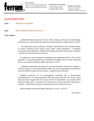 Rury stalowe: ‐zgrzewane ze szwem wzdłużnym Ø 114,3÷ 406,4 ‐spawane ze szwem spiralnym Ø 273,0÷1016,0 ‐spawane ze szwem wzdłużnym Ø 559,0÷ 2020,0 Kształtowniki zamknięte: ‐ ze szwem wykonane na zimno ‐ kwadratowe: 90x90 ‐ 300x300 ‐ prostokątne: 100x80 – 320x200 Powłoki izolacyjne: ‐ zewnętrzne typu 3LPE, 3LPP ‐ wewnętrzne cementowe ‐ wewnętrzne i zewnętrzne epoksydowe Gazeta Giełdy Parkiet Tytuł: Zbiorniki na parkiet Data: 05.02.2008 Nr 3553, kolumna 7 Treść artykułu: „Zakład Konstrukcji Spawanych "Ferrum" (ZKS), należący w 100 proc. do katowickiego producenta rur, może przeprowadzić pierwszą ofertę publiczną i zadebiutować na GPW. ‐ Nie wykluczamy takiej możliwości, dlatego przekształciliśmy ZKS w spółkę akcyjną. To jednak stanowczo zbyt wczesny etap, żebym mógł powiedzieć o szczegółach ewentualnej oferty publicznej. Podejmiemy decyzję, jak powróci koniunktura na giełdzie ‐ twierdzi Janusz Waszczak, prezes Ferrum. W najbliższym czasie katowickie przedsiębiorstwo dokapitalizuje ZKS 6 mln zł, które pozyskało z emisji przeprowadzonej w listopadzie ubiegłego roku (w sumie zebrało 38 mln zł). Teraz kapitał zakładowy spółki córki wynosi 4 mln zł. ‐ Pieniądze zasilą kapitał obrotowy ZKS. Firma go potrzebuje, ponieważ w związku ze wzrostem popytu na konstrukcje stalowe szybko się rozwija. Największym powodzeniem cieszą się zbiorniki na gaz LPG oraz cysterny ‐ wyjaśnia prezes Waszczak. Giełdowy producent rur nie wyszczególnia rezultatów ZKS w sprawozdaniu skonsolidowanym. Po trzech kwartałach 2007 roku grupa miała 10,1 mln zł zysku netto (zysk operacyjny sięgnął 10,8 mln zł) przy 226 mln zł przychodów. Jak poszedł ostatni kwartał zeszłego roku? ‐ Co prawda silny złoty nam nie sprzyja, ale jestem zadowolony z wyników ‐ mówi Waszczak. Eksport stanowi około 40 proc. obrotów Ferrum. Wczoraj papiery katowickiej spółki podrożały o 2,3 proc., do 9,3 zł.” Adam Roguski