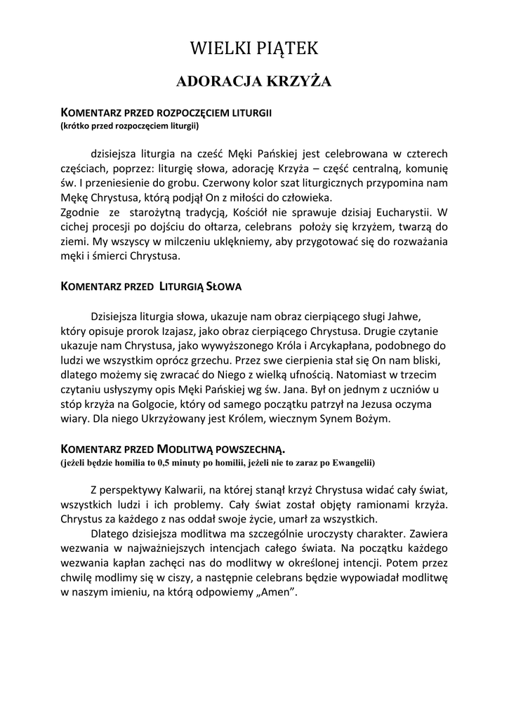 WIELKI PIĄTEK ADORACJA KRZYŻA KOMENTARZ PRZED ROZPOCZĘCIEM LITURGII (krótko przed rozpoczęciem liturgii) dzisiejsza liturgia na cześć Męki Pańskiej jest celebrowana w czterech częściach, poprzez: liturgię słowa, adorację Krzyża – część centralną, komunię św. I przeniesienie do grobu. Czerwony kolor szat liturgicznych przypomina nam Mękę Chrystusa, którą podjął On z miłości do człowieka. Zgodnie ze starożytną tradycją, Kościół nie sprawuje dzisiaj Eucharystii. W cichej procesji po dojściu do ołtarza, celebrans położy się krzyżem, twarzą do ziemi. My wszyscy w milczeniu uklękniemy, aby przygotować się do rozważania męki i śmierci Chrystusa. KOMENTARZ PRZED LITURGIĄ SŁOWA Dzisiejsza liturgia słowa, ukazuje nam obraz cierpiącego sługi Jahwe, który opisuje prorok Izajasz, jako obraz cierpiącego Chrystusa. Drugie czytanie ukazuje nam Chrystusa, jako wywyższonego Króla i Arcykapłana, podobnego do ludzi we wszystkim oprócz grzechu. Przez swe cierpienia stał się On nam bliski, dlatego możemy się zwracać do Niego z wielką ufnością. Natomiast w trzecim czytaniu usłyszymy opis Męki Pańskiej wg św. Jana. Był on jednym z uczniów u stóp krzyża na Golgocie, który od samego początku patrzył na Jezusa oczyma wiary. Dla niego Ukrzyżowany jest Królem, wiecznym Synem Bożym. KOMENTARZ PRZED MODLITWĄ POWSZECHNĄ. (jeżeli będzie homilia to 0,5 minuty po homilii, jeżeli nie to zaraz po Ewangelii) Z perspektywy Kalwarii, na której stanął krzyż Chrystusa widać cały świat, wszystkich ludzi i ich problemy. Cały świat został objęty ramionami krzyża. Chrystus za każdego z nas oddał swoje życie, umarł za wszystkich. Dlatego dzisiejsza modlitwa ma szczególnie uroczysty charakter. Zawiera wezwania w najważniejszych intencjach całego świata. Na początku każdego wezwania kapłan zachęci nas do modlitwy w określonej intencji. Potem przez chwilę modlimy się w ciszy, a następnie celebrans będzie wypowiadał modlitwę w naszym imieniu, na którą odpowiemy „Amen”. KOMENTARZ PRZED ADORACJĄ KRZYŻA (zaraz po modlitwie powszechnej) Punktem szczytowym wielkopiątkowej liturgii jest adoracja krzyża. W uroczystej procesji zostanie wniesiony krzyż. Na tym krzyżu Jezus odkupił całą ludzkość. Unaoczni nam to trzy stopniowe odsłanianie Znaku zbawienia. Dokonując tego, kapłan odśpiewa słowa: „Oto drzewo krzyża, na którym zawisło zbawienie świata”, po których za każdym razem uklękniemy i odpowiemy „Pójdźmy z pokłonem”. Obrzęd ten ma nam uświadomić prawdę, że odkupienie całej ludzkości nie oznacza odkupienia jakiegoś nieokreślonego tłumu, ale każdego z nas indywidualnie. Dlatego każdy z nas uczestniczących w dzisiejszej liturgii będzie miał okazję do uwielbienia Chrystusa za Jego akt miłości. Uczynimy to poprzez ucałowanie krzyża, w czasie adoracji Krzyża będziemy śpiewać pieśni o Męce Pańskiej. Za oddanie czci Krzyżowi w dniu dzisiejszym możemy uzyskać odpust zupełny. KOMENTARZ PRZED KOMUNIĄ ŚWIĘTĄ (zaraz po przyniesieniu Najświętszego Sakramentu z Ciemnicy) Od Krzyża prowadzi nas liturgia do komunii Świętej. Pragnie nam przez to powiedzieć, że między Ofiarą na Krzyżu a Eucharystią istnieje ścisły związek. Uczestniczymy zawsze w eucharystycznej uczcie Baranka dzięki Jego ukrzyżowaniu. Komunia Święta jest pokarmem, jest owocem zerwanym z drzewa Krzyża, z Drzewa nowego i nieśmiertelnego Życia. Za chwilę kapłan ukaże nam już nie drzewo, ale samego Chrystusa, w Jego eucharystycznym i uwielbionym Ciele. Przyjmując Go upodobniamy się do Niego, także w oddaniu i codziennym posłuszeństwie Bogu Ojcu aż do śmierci. KOMENTARZ PRZED PROCESJĄ DO GROBU PAŃSKIEGO (zaraz po ogłoszeniach) Dobiega końca dzisiejsza liturgia. W uroczystej procesji przeniesiemy Najświętszy Sakrament do Grobu Pańskiego. Ze śpiewem trwajmy w duchu uwielbienia przy Zbawicielu, który dla nas umarł i przeszedł z tego świata do chwały Ojca. Niech rozważanie Jego Męki, jaką podjął z miłości do nas, doda nam siły do ciągłego nawracania się, abyśmy już nie żyli dla siebie, ale dla tego, który za nas umarł i zmartwychwstał. Uklęknijmy!