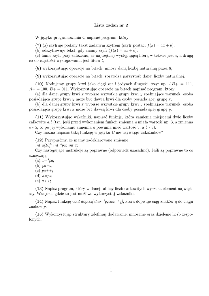Lista zadań nr 2 W języku programowania C napisać program, który (7) (a) szyfruje podany tekst zadanym szyfrem (szyfr postaci f (x) = ax + b), (b) odszyfrowuje tekst, gdy znamy szyfr (f (x) = ax + b), (c) łamie szyfr przy założeniu, że najczęściej występującą literą w tekscie jest e, a drugą co do częstości występowania jest litera t, (8) wykorzystując operacje na bitach, mnoży daną liczbę naturalną przez 8, (9) wykorzystując operacje na bitach, sprawdza parzystość danej liczby naturalnej. (10) Kodujemy grupy krwi jako ciągi zer i jedynek długości trzy: np. AB+ = 111, A− = 100, B+ = 011. Wykorzystując operacje na bitach napisać program, który (a) dla danej grupy krwi x wypisze wszystkie grupy krwi y spełniające warunek: osoba posiadająca grupę krwi y może być dawcą krwi dla osoby posiadającej grupę x, (b) dla danej grupy krwi x wypisze wszystkie grupy krwi y spełniające warunek: osoba posiadająca grupę krwi x może być dawcą krwi dla osoby posiadającej grupę y. (11) Wykorzystując wskaźniki, napisać funkcję, która zamienia miejscami dwie liczby całkowite a,b (tzn. jeśli przed wykonaniem funkcji zmienna a miała wartość np. 3, a zmienna b - 5, to po jej wykonaniu zmienna a powinna mieć wartość 5, a b - 3). Czy można napisać taką funkcję w języku C nie używając wskaźników? (12) Przypuśćmy, że mamy zadeklarowane zmienne int a[10]; int *pa; int x; Czy następujące instrukcje są poprawne (odpowiedź uzasadnić). Jeśli są poprawne to co oznaczają. (a) x=*pa; (b) pa=a; (c) pa++; (d) a=pa; (e) a++; (13) Napisz program, który w danej tablicy liczb całkowitych wyszuka element największy. Wszędzie gdzie to jest możliwe wykorzystaj wskaźniki. (14) Napisz funkcję void dopisz(char *p,char *q), która dopisuje ciąg znaków q do ciągu znaków p. (15) Wykorzystując struktury zdefiniuj dodawanie, mnożenie oraz dzielenie liczb zespolonych. 1