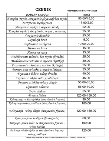 CENNIK RODZAJ USŁUGI Obowiązuje od 01-09-2015r Fryzura ślubna Koloryzacja -włosy krótkie (strzyżenie i fryzura) Koloryzacja-włosy półdługie (strzyżenie i fryzura) CENA 50,00/45,00 17,00/2,00 22,00 25,00 25,00 5,00 10,00-20,00 15,00 13,00 25,00 30,00 25,00 35,00 40,00 45,00 55,00-65,00 55,00-70,00 55,00 120,00-150,00 90,00 100,00 Koloryzacja –włosy długie (strzyżenie i fryzura) 120,00-150,00 Koloryzacja na środkach klienta(farba) 60,00 Baleyage –jeden kolor ze strzyżeniem i fryzurą włosy krótkie Baleyage –jeden kolor ze strzyżeniem i fryzurąwłosy półdługie 100,00 Komplet (mycie, strzyżenie ,fryzura)/bez mycia Strzyżenie męskie/wąs Strzyżenie męskie z wąsem i brodą Komplet męski ( strzyżenie , mycie , suszenie) Strzyżenie damskie Depilacja brwi Zaplatanie warkocza Henna na brwi Henna na rzęsy Modelowanie włosów bez mycia (krótkie) Modelowanie włosów z myciem (krótkie) Prostowanie włosów z myciem (krótkie) Prostowanie włosów z myciem (długie) Fryzura z loków włosy krótkie Fryzura z loków włosy półdługie Fryzura z loków włosy długie Upinanie włosów Próba ślubna 120,00 *Uwaga! ceny wyrażone w złotych polskich są cenami brutto i zawierają podatek VAT Obowiązuje od 01-09-2015r RODZAJ USŁUGI CENA Baleyage- jeden kolor ze strzyżeniem i fryzurą –włosy długie Baleyage –dwa kolory ze strzyżeniem i fryzurą –włosy krótkie Baleyage –dwa kolory włosy półdługie/długie Baleyage na koronie Trwała ondulacja Tuszowanie męskiej siwizny( koloryzacja, obcięcie , suszenie) Zabieg regeneracji ( mycie ,sauna z ampułką keratyny , modelowanie ) Ombre Farba+jasne końce krótkie 120,00-150,00 Ombre Farba+jasne końce długie Rozjaśnianie –dwie farby 120-150 Rozjaśnianie –odrosty włosy krótkie 90,00 Rozjaśnianie włosy długie 150,00 115,00 120,00/150,00 70,00 85,00 50,00 50,00 110,00 100-120 UWAGA!! Salon zastrzega sobie możliwość doliczenia 100% wartości ceny usługi w sytuacji wymagającej poświęcenia ponadnormatywnej ilości czasu w związku z czasochłonnymi wymaganiami klienta. W niedzielę i święta usługa na zamówienie płatna 100% ceny! Ceny wyrażone w złotych polskich są cenami brutto i zawierają podatek VAT