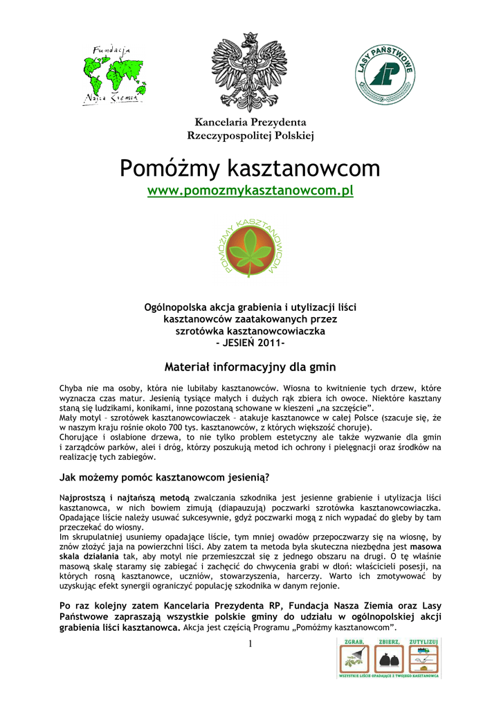 Kancelaria Prezydenta Rzeczypospolitej Polskiej PomóŜmy kasztanowcom www.pomozmykasztanowcom.pl Ogólnopolska akcja grabienia i utylizacji liści kasztanowców zaatakowanych przez szrotówka kasztanowcowiaczka - JESIEŃ 2011- Materiał informacyjny dla gmin Chyba nie ma osoby, która nie lubiłaby kasztanowców. Wiosna to kwitnienie tych drzew, które wyznacza czas matur. Jesienią tysiące małych i duŜych rąk zbiera ich owoce. Niektóre kasztany staną się ludzikami, konikami, inne pozostaną schowane w kieszeni „na szczęście”. Mały motyl – szrotówek kasztanowcowiaczek – atakuje kasztanowce w całej Polsce (szacuje się, Ŝe w naszym kraju rośnie około 700 tys. kasztanowców, z których większość choruje). Chorujące i osłabione drzewa, to nie tylko problem estetyczny ale takŜe wyzwanie dla gmin i zarządców parków, alei i dróg, którzy poszukują metod ich ochrony i pielęgnacji oraz środków na realizację tych zabiegów. Jak moŜemy pomóc kasztanowcom jesienią? Najprostszą i najtańszą metodą zwalczania szkodnika jest jesienne grabienie i utylizacja liści kasztanowca, w nich bowiem zimują (diapauzują) poczwarki szrotówka kasztanowcowiaczka. Opadające liście naleŜy usuwać sukcesywnie, gdyŜ poczwarki mogą z nich wypadać do gleby by tam przeczekać do wiosny. Im skrupulatniej usuniemy opadające liście, tym mniej owadów przepoczwarzy się na wiosnę, by znów złoŜyć jaja na powierzchni liści. Aby zatem ta metoda była skuteczna niezbędna jest masowa skala działania tak, aby motyl nie przemieszczał się z jednego obszaru na drugi. O tę właśnie masową skalę staramy się zabiegać i zachęcić do chwycenia grabi w dłoń: właścicieli posesji, na których rosną kasztanowce, uczniów, stowarzyszenia, harcerzy. Warto ich zmotywować by uzyskując efekt synergii ograniczyć populację szkodnika w danym rejonie. Po raz kolejny zatem Kancelaria Prezydenta RP, Fundacja Nasza Ziemia oraz Lasy Państwowe zapraszają wszystkie polskie gminy do udziału w ogólnopolskiej akcji grabienia liści kasztanowca. Akcja jest częścią Programu „PomóŜmy kasztanowcom”. 1 Inicjuje on i wspiera lokalne działania na rzecz ochrony kasztanowców oraz edukacji ekologicznej. Został zapoczątkowany w 2005 roku przez Fundację Nasza Ziemia i firmę Clear Channel Poland. Od 2006 roku partnerem FNZ oraz CCP są Lasy Państwowe. Jesienią 2006 roku działania na rzecz kasztanowców objęła patronatem Kancelaria Prezydenta Rzeczpospolitej Polskiej. Lokalnym koordynatorem Programu jest przedstawiciel Nadleśnictwa (dane na końcu niniejszej informacji). Jak zorganizować gminną akcję grabienia liści? Urząd Gminy, który chce i jest w stanie organizacyjnie wesprzeć akcję grabienia i utylizacji liści, moŜe: 1. zorganizować akcję samodzielnie; 2. zainicjować akcję w instytucjach i organizacjach działających na terenie gminy, udzielając im wsparcia organizacyjnego, np. referaty bądź wydziały UG d.s. ochrony środowiska i gospodarki odpadami wspólnie z miejscowymi szkołami lub organizacjami ustalają datę i miejsca grabienia. Wyznaczonego dnia UG przygotowuje i rozdaje worki na zagrabione liście. Zbiera je, a następnie oddaje do utylizacji, np. za pośrednictwem firmy wywoŜącej z gminy odpady. Namawiamy do wykorzystania materiałów, które dostępne są w wersji elektronicznej na stronie www.pomozmykasztanowcom.pl: - plakatu na tegoroczną akcję w wersji kolorowej i czarno-białej; - tablic edukacyjnych dotyczących szrotówka kasztanowcowiaczka; - kolorowanki. Niech akcja stanie się przyjemną zabawą i edukacją dla biorących w niej udział. UWAGA! Przez utylizację liści rozumie się: a) kompostowanie w miejscu znacznie oddalonym od kasztanowców, przy czym liście powinny być przysypane warstwą ziemi lub innych kompostowanych odpadów. Kompost pozyskany z liści zawierających poczwarki szrotówka moŜe być udostępniony do wykorzystywania najwcześniej jesienią następnego roku – nie wiosną, ze względu na ryzyko przywrócenia przezimowanych poczwarek szrotówka w pobliŜe kasztanowców, b) zakopanie liści pod co najmniej 30-centymetrową warstwą ziemi. W przypadku płytszej warstwy istnieje niebezpieczeństwo wygrzebania się poczwarek i ich powrotu na kasztanowce wiosną. Przypominamy równieŜ, Ŝe zgodnie z polskim prawem odpady roślinne powinny podlegać kompostowaniu, a nie paleniu. 3. zebrać worki z liśćmi oraz oddać je do utylizacji w ogłoszonym wcześniej terminie i z wyznaczonych miejsc – w sytuacji, gdy UG sam nie jest w stanie zapewnić worków na liście; 4. udzielić akcji stanowiska; wsparcia, polegającego na oficjalnym sformułowaniu przychylnego 5. nagłaśniać akcję i swoje dla niej poparcie we wszelkich lokalnych mediach; 6. rozpowszechniać informacje o akcji wśród organizacji (np. ZHP lub ZHR), klubów, kół, zakładów pracy i wszelkich instytucji mających kontakt z UG lub działających na terenie gminy; 2 7. wydać zgodę na rozwieszenie w UG promujących akcję plakatów oraz popierać ich rozwieszanie w miejscach publicznych. Udział Urzędu Gminy w akcji grabienia liści moŜe zatem polegać zarówno na zorganizowaniu gminnego grabienia, jak i na przychylnym propagowaniu idei Programu „PomóŜmy kasztanowcom” wśród jej mieszkańców, organizacji, instytucji oraz w mediach. Serdecznie dziękujemy wszystkim Gminom za zaangaŜowanie się w akcję grabienia i utylizacji liści kasztanowca. Dzięki Wam kasztanowce będą miały szansę na przeŜycie kolejnej wiosny! Więcej informacji: serwis internetowy Programu: www.pomozmykasztanowcom.pl, Koordynatorka Krajowa: Ewa Smolska-Eytner, [email protected], 501 535 034 Koordynator Lokalny (przedstawiciel Nadleśnictwa):…………………………………………………………………………… 3