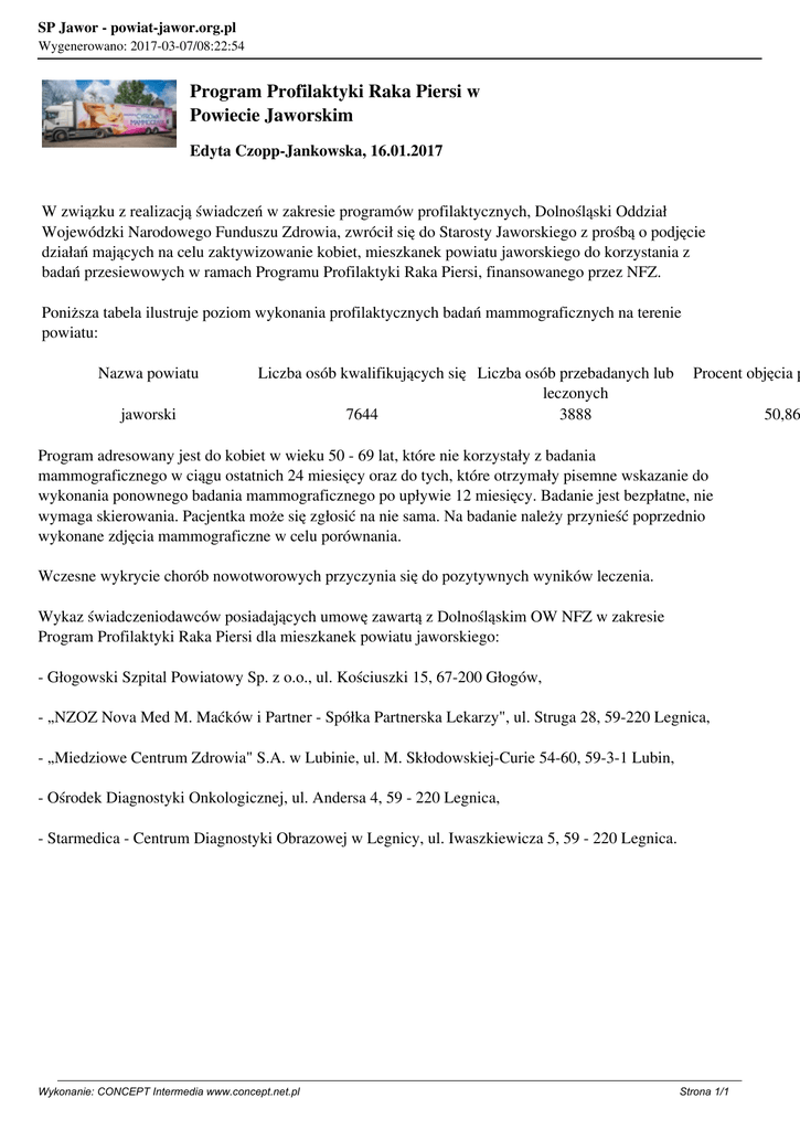 SP Jawor - powiat-jawor.org.pl Wygenerowano: 2017-03-07/08:22:54 Program Profilaktyki Raka Piersi w Powiecie Jaworskim Edyta Czopp-Jankowska, 16.01.2017 W związku z realizacją świadczeń w zakresie programów profilaktycznych, Dolnośląski Oddział Wojewódzki Narodowego Funduszu Zdrowia, zwrócił się do Starosty Jaworskiego z prośbą o podjęcie działań mających na celu zaktywizowanie kobiet, mieszkanek powiatu jaworskiego do korzystania z badań przesiewowych w ramach Programu Profilaktyki Raka Piersi, finansowanego przez NFZ. Poniższa tabela ilustruje poziom wykonania profilaktycznych badań mammograficznych na terenie powiatu: Nazwa powiatu jaworski Liczba osób kwalifikujących się Liczba osób przebadanych lub leczonych 7644 3888 Procent objęcia p 50,86 Program adresowany jest do kobiet w wieku 50 - 69 lat, które nie korzystały z badania mammograficznego w ciągu ostatnich 24 miesięcy oraz do tych, które otrzymały pisemne wskazanie do wykonania ponownego badania mammograficznego po upływie 12 miesięcy. Badanie jest bezpłatne, nie wymaga skierowania. Pacjentka może się zgłosić na nie sama. Na badanie należy przynieść poprzednio wykonane zdjęcia mammograficzne w celu porównania. Wczesne wykrycie chorób nowotworowych przyczynia się do pozytywnych wyników leczenia. Wykaz świadczeniodawców posiadających umowę zawartą z Dolnośląskim OW NFZ w zakresie Program Profilaktyki Raka Piersi dla mieszkanek powiatu jaworskiego: - Głogowski Szpital Powiatowy Sp. z o.o., ul. Kościuszki 15, 67-200 Głogów, - „NZOZ Nova Med M. Maćków i Partner - Spółka Partnerska Lekarzy", ul. Struga 28, 59-220 Legnica, - „Miedziowe Centrum Zdrowia" S.A. w Lubinie, ul. M. Skłodowskiej-Curie 54-60, 59-3-1 Lubin, - Ośrodek Diagnostyki Onkologicznej, ul. Andersa 4, 59 - 220 Legnica, - Starmedica - Centrum Diagnostyki Obrazowej w Legnicy, ul. Iwaszkiewicza 5, 59 - 220 Legnica. Wykonanie: CONCEPT Intermedia www.concept.net.pl Strona 1/1