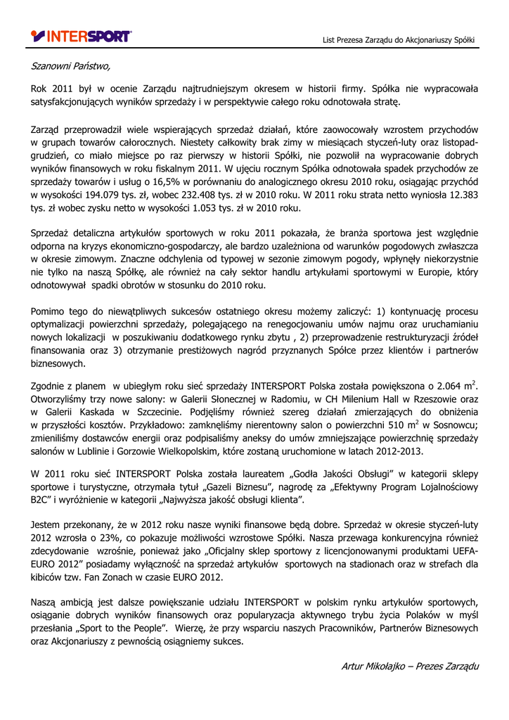 List Prezesa Zarządu do Akcjonariuszy Spółki Szanowni Państwo, Rok 2011 był w ocenie Zarządu najtrudniejszym okresem w historii firmy. Spółka nie wypracowała satysfakcjonujących wyników sprzedaży i w perspektywie całego roku odnotowała stratę. Zarząd przeprowadził wiele wspierających sprzedaż działań, które zaowocowały wzrostem przychodów w grupach towarów całorocznych. Niestety całkowity brak zimy w miesiącach styczeń-luty oraz listopadgrudzień, co miało miejsce po raz pierwszy w historii Spółki, nie pozwolił na wypracowanie dobrych wyników finansowych w roku fiskalnym 2011. W ujęciu rocznym Spółka odnotowała spadek przychodów ze sprzedaży towarów i usług o 16,5% w porównaniu do analogicznego okresu 2010 roku, osiągając przychód w wysokości 194.079 tys. zł, wobec 232.408 tys. zł w 2010 roku. W 2011 roku strata netto wyniosła 12.383 tys. zł wobec zysku netto w wysokości 1.053 tys. zł w 2010 roku. Sprzedaż detaliczna artykułów sportowych w roku 2011 pokazała, że branża sportowa jest względnie odporna na kryzys ekonomiczno-gospodarczy, ale bardzo uzależniona od warunków pogodowych zwłaszcza w okresie zimowym. Znaczne odchylenia od typowej w sezonie zimowym pogody, wpłynęły niekorzystnie nie tylko na naszą Spółkę, ale również na cały sektor handlu artykułami sportowymi w Europie, który odnotowywał spadki obrotów w stosunku do 2010 roku. Pomimo tego do niewątpliwych sukcesów ostatniego okresu możemy zaliczyć: 1) kontynuację procesu optymalizacji powierzchni sprzedaży, polegającego na renegocjowaniu umów najmu oraz uruchamianiu nowych lokalizacji w poszukiwaniu dodatkowego rynku zbytu , 2) przeprowadzenie restrukturyzacji źródeł finansowania oraz 3) otrzymanie prestiżowych nagród przyznanych Spółce przez klientów i partnerów biznesowych. Zgodnie z planem w ubiegłym roku sieć sprzedaży INTERSPORT Polska została powiększona o 2.064 m2. Otworzyliśmy trzy nowe salony: w Galerii Słonecznej w Radomiu, w CH Milenium Hall w Rzeszowie oraz w Galerii Kaskada w Szczecinie. Podjęliśmy również szereg działań zmierzających do obniżenia w przyszłości kosztów. Przykładowo: zamknęliśmy nierentowny salon o powierzchni 510 m2 w Sosnowcu; zmieniliśmy dostawców energii oraz podpisaliśmy aneksy do umów zmniejszające powierzchnię sprzedaży salonów w Lublinie i Gorzowie Wielkopolskim, które zostaną uruchomione w latach 2012-2013. W 2011 roku sieć INTERSPORT Polska została laureatem „Godła Jakości Obsługi” w kategorii sklepy sportowe i turystyczne, otrzymała tytuł „Gazeli Biznesu”, nagrodę za „Efektywny Program Lojalnościowy B2C” i wyróżnienie w kategorii „Najwyższa jakość obsługi klienta”. Jestem przekonany, że w 2012 roku nasze wyniki finansowe będą dobre. Sprzedaż w okresie styczeń-luty 2012 wzrosła o 23%, co pokazuje możliwości wzrostowe Spółki. Nasza przewaga konkurencyjna również zdecydowanie wzrośnie, ponieważ jako „Oficjalny sklep sportowy z licencjonowanymi produktami UEFAEURO 2012” posiadamy wyłączność na sprzedaż artykułów sportowych na stadionach oraz w strefach dla kibiców tzw. Fan Zonach w czasie EURO 2012. Naszą ambicją jest dalsze powiększanie udziału INTERSPORT w polskim rynku artykułów sportowych, osiąganie dobrych wyników finansowych oraz popularyzacja aktywnego trybu życia Polaków w myśl przesłania „Sport to the People”. Wierzę, że przy wsparciu naszych Pracowników, Partnerów Biznesowych oraz Akcjonariuszy z pewnością osiągniemy sukces. Artur Mikołajko – Prezes Zarządu OŚWIADCZENIE ZARZĄDU w sprawie rzetelności sporządzenia sprawozdania finansowego za rok 2011 r. Niniejszym wspólnie oświadczamy, że wedle naszej najlepszej wiedzy sprawozdanie finansowe za rok 2011 oraz dane porównywalne sporządzone zostały zgodnie z obowiązującymi zasadami rachunkowości. Odzwierciedlają one w sposób prawdziwy, rzetelny sytuację majątkową, finansową Spółki z opisem wszystkich czynników ryzyka oraz zawierają prawdziwy obraz rozwoju i osiągnięć firmy za podany okres rozliczeniowy. Kraków, dnia 20 marca 2012 r. _________________________________ Artur Mikołajko – Prezes Zarządu _______________________________________ Sławomir Gil - Wiceprezes Zarządu INTERSPORT S.A. SA-R 2011 skorygowany KOMISJA NADZORU FINANSOWEGO Raport roczny SA-R 2011 (zgodnie z § 82 ust. 1 pkt 3 Rozporządzenia Ministra Finansów z dnia 19 lutego 2009 r. - Dz. U. Nr 33, poz. 259) (dla emitentów papierów wartośc iowyc h prowadząc yc h działalność wytwórc zą, budowlaną, handlową lub usługową) Za rok obrotowy 2011 oraz za poprzedni rok obrotowy obejmując y okres 2010 od 2011-01-01 do 2011-12-31 od 2010-01-01 do 2010-12-31 obejmując y okres data przekazania: 2012-03-20 Intersport Polska Spółka Akcyjna (pełna nazwa emitenta) INTERSPORT S.A. Handel (han) (skróc ona nazwa emitenta) 32-060 (sektor wg klasyfikac ji GPW w Warszawie) Liszki (kod poc ztowy) (miejsc owość ) Cholerzyn 382 (ulic a) 012 44 48 100 (numer) 012 44 48 000 (telefon) [email protected] (fax) www.intersport.pl (e-mail) 6760016553 (www) 003900187 (NIP) (REGON) Auxilium Audyt z siedzibą w Krakowie (podmiot uprawniony do badania) Raport roc zny zawiera: Opinię i raport podmiotu uprawnionego do badania sprawozdań finansowyc h z badania roc znego sprawozdania finansowego Oświadc zenie zarządu w sprawie rzetelnośc i sporządzenia sprawozdania finansowego Oświadc zenie zarządu w sprawie podmiotu uprawnionego do badania sprawozdań finansowyc h Pismo Prezesa Zarządu Roc zne sprawozdanie finansowe Wprowadzenie Zestawienie zmian w kapitale własnym Bilans Rac hunek przepływów pieniężnyc h Rac hunek zysków i strat Dodatkowe informac je i objaśnienia Sprawozdanie zarządu (sprawozdanie z działalnośc i emitenta) Oświadc zenie o stosowaniu ładu korporac yjnego WYBRANE DANE FINANSOWE I. Przyc hody netto ze sprzedaży produkt