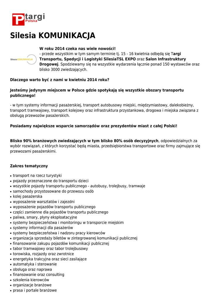 Silesia KOMUNIKACJA W roku 2014 czeka nas wiele nowości! - przede wszystkim w tym samym terminie tj. 15 - 16 kwietnia odbędą się Targi Transportu, Spedycji i Logistyki SilesiaTSL EXPO oraz Salon Infrastruktury Drogowej. Spodziewamy się na wszystkie wydarzenia łącznie ponad 150 wystawców oraz blisko 3000 zwiedzających. Dlaczego warto być z nami w kwietniu 2014 roku? Jesteśmy jedynym miejscem w Polsce gdzie spotykają się wszystkie obszary transportu publicznego! - w tym systemy informacji pasażerskiej, transport autobusowy miejski, międzymiastowy, dalekobieżny, transport tramwajowy, transport kolejowy oraz infrastruktura przystankowa, drogowa i miejska związana z obsługą przewozów pasażerskich. Posiadamy największe wsparcie samorządów oraz prezydentów miast z całej Polski! Blisko 90% branżowych zwiedzających w tym blisko 80% osób decyzyjnych, odpowiedzialnych za wybór rozwiązań, z których korzystać będą miasta, przedsiębiorstwa transportowe oraz firmy zajmujące się przewozami pasażerskimi. Zakres tematyczny ● ● ● ● ● ● ● ● ● ● ● ● ● ● ● ● ● ● ● ● ● ● ● transport na rzecz turystyki pojazdy przeznaczone do transportu dzieci wszystkie pojazdy transportu publicznego - autobusy, trolejbusy, tramwaje samochody przystosowane do przewozu osób kolej pasażerska wyposażenie warsztatów i zajezdni wyposażenie pojazdów transportu publicznego części zamienne dla pojazdów transportu publicznego paliwa, smary, płyny eksploatacyjne systemy bezpieczeństwa i monitoringu w transporcie miejskim systemy informacji dla pasażerów systemy bezpieczeństwa i nadzoru pracy kierowców organizacja sprzedaży biletów w zintegrowanej komunikacji publicznej finansowanie zakupu pojazdów komunikacji publicznej tabor tramwajowy oraz tabor trolejbusowy torowiska, rozjazdy oraz zwrotnice energetyka trakcyjna oraz sieci zasilające automatyka i sterowanie obsługa oraz naprawa finansowanie oraz consulting szkolenia kierowców organizacje branżowe prasa i portale branżowe Wspólny zakres targów SilesiaKOMUNIKACJA i SilesiaTSL EXPO: ● ● ● ● ● transport i logistyka transport drogowy transport kolejowy transport publiczny transport kombinowany Miejsce targów Sosnowiec Braci Mieroszewskich 124 Organizator Expo Silesia Sosnowiec Braci Mieroszewskich 124 032 78 87 500 www.exposilesia.pl [email protected]