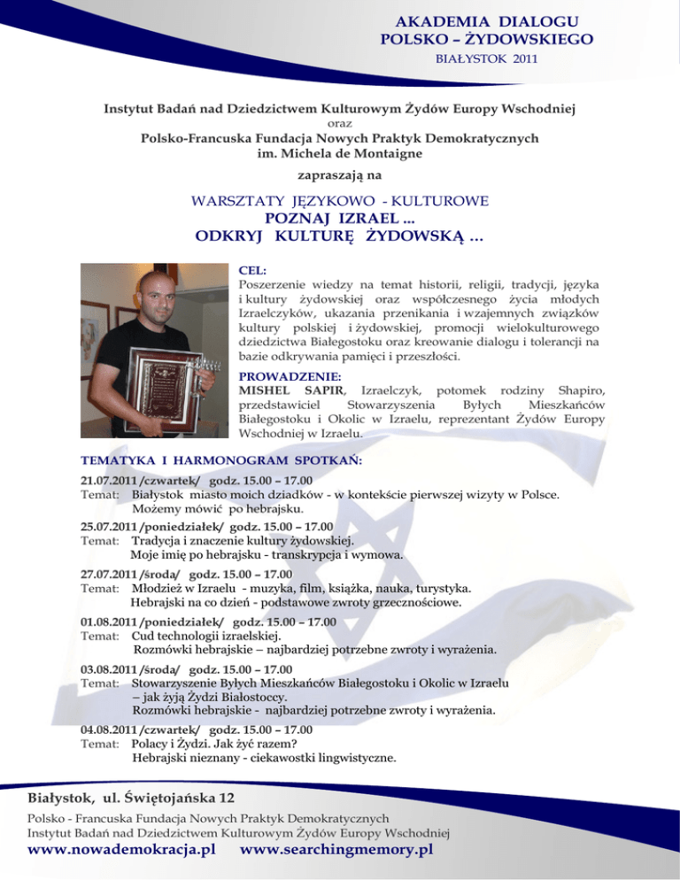 AKADEMIA DIALOGU POLSKO – śYDOWSKIEGO BIAŁYSTOK 2011 Instytut Badań nad Dziedzictwem Kulturowym śydów Europy Wschodniej oraz Polsko-Francuska Fundacja Nowych Praktyk Demokratycznych im. Michela de Montaigne zapraszają na WARSZTATY JĘZYKOWO - KULTUROWE POZNAJ IZRAEL ... ODKRYJ KULTURĘ śYDOWSKĄ … CEL: Poszerzenie wiedzy na temat historii, religii, tradycji, języka i kultury Ŝydowskiej oraz współczesnego Ŝycia młodych Izraelczyków, ukazania przenikania i wzajemnych związków kultury polskiej i Ŝydowskiej, promocji wielokulturowego dziedzictwa Białegostoku oraz kreowanie dialogu i tolerancji na bazie odkrywania pamięci i przeszłości. PROWADZENIE: MISHEL SAPIR, Izraelczyk, potomek rodziny Shapiro, przedstawiciel Stowarzyszenia Byłych Mieszkańców Białegostoku i Okolic w Izraelu, reprezentant śydów Europy Wschodniej w Izraelu. TEMATYKA I HARMONOGRAM SPOTKAŃ: 21.07.2011 /czwartek/ godz. 15.00 – 17.00 Temat: Białystok miasto moich dziadków - w kontekście pierwszej wizyty w Polsce. MoŜemy mówić po hebrajsku. 25.07.2011 /poniedziałek/ godz. 15.00 – 17.00 Temat: Tradycja i znaczenie kultury żydowskiej. Moje imię po hebrajsku - transkrypcja i wymowa. 27.07.2011 /środa/ godz. 15.00 – 17.00 Temat: Młodzież w Izraelu - muzyka, film, książka, nauka, turystyka. Hebrajski na co dzień - podstawowe zwroty grzecznościowe. 01.08.2011 /poniedziałek/ godz. 15.00 – 17.00 Temat: Cud technologii izraelskiej. Rozmówki hebrajskie – najbardziej potrzebne zwroty i wyrażenia. 03.08.2011 /środa/ godz. 15.00 – 17.00 Temat: Stowarzyszenie Byłych Mieszkańców Białegostoku i Okolic w Izraelu – jak żyją Żydzi Białostoccy. Rozmówki hebrajskie - najbardziej potrzebne zwroty i wyrażenia. 04.08.2011 /czwartek/ godz. 15.00 – 17.00 Temat: Polacy i Żydzi. Jak żyć razem? Hebrajski nieznany - ciekawostki lingwistyczne. Białystok, ul. Świętojańska 12 Polsko - Francuska Fundacja Nowych Praktyk Demokratycznych Instytut Badań nad Dziedzictwem Kulturowym śydów Europy Wschodniej www.nowademokracja.pl www.searchingmemory.pl