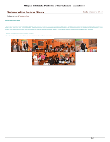 Miejska Biblioteka Publiczna w Nowej Rudzie - aktualności Środa, 18 czerwca 2014 r. Magiczna walizka Czesława Miłosza Dodane przez: Wypożyczalnia Magiczna walizka Czesława Miłosza. Prosto z Chicago przybył do noworudzkiej biblioteki Adam Lizakowski, polsko-amerykański poeta, fotograf, tłumacz poezji amerykańskiej m.in. Walta Whitmana, W. C. Williamsa, Allena Ginsberga, Langstona Hughesa, Carla Sandburga, promotor kultury polskiej za granicą. Rozpoczął tym samym, poetycką podróż po kraju. Barwnie opowiadał o swoim ponad 33 letnim pobycie w USA. Czytał wiersze, rozdawał książki jako nagrody w zorganizowanym przez siebie konkursie. Kiedy otworzył tajemniczą walizkę okazało się, że jest wypełniona książkami Czesława Miłosza tłumaczonymi na wiele języków. Nie byłoby w tym nic ciekawego, gdyby nie to, że walizkę i książki z autografami podarował mu sam Czesław Miłosz, z którym się przyjaźnił. Młodzież z noworudzkiego liceum zaproszona do biblioteki na spotkanie z Adamem Lizakowskim z zainteresowaniem wysłuchała wielu ciekawostek historycznych i geograficznych o naszym regionie. 1/1