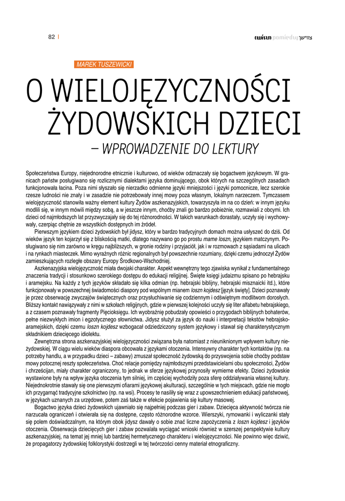 82 Marek Tuszewicki O wielojęzyczności żydowskich dzieci – wprowadzenie do lektury Społeczeństwa Europy, niejednorodne etnicznie i kulturowo, od wieków odznaczały się bogactwem językowym. W granicach państw posługiwano się rozlicznymi dialektami języka dominującego, obok których na szczególnych zasadach funkcjonowała łacina. Poza nimi słyszało się nierzadko odmienne języki mniejszości i języki pomocnicze, lecz szerokie rzesze ludności nie znały i w zasadzie nie potrzebowały innej mowy poza własnym, lokalnym narzeczem. Tymczasem wielojęzyczność stanowiła ważny element kultury Żydów aszkenazyjskich, towarzyszyła im na co dzień: w innym języku modlili się, w innym mówili między sobą, a w jeszcze innym, choćby znali go bardzo pobieżnie, rozmawiali z obcymi. Ich dzieci od najmłodszych lat przyzwyczajały się do tej różnorodności. W takich warunkach dorastały, uczyły się i wychowywały, czerpiąc chętnie ze wszystkich dostępnych im źródeł. Pierwszym językiem dzieci żydowskich był jidysz, który w bardzo tradycyjnych domach można usłyszeć do dziś. Od wieków język ten kojarzył się z bliskością matki, dlatego nazywano go po prostu mame loszn, językiem matczynym. Posługiwano się nim zarówno w kręgu najbliższych, w gronie rodziny i przyjaciół, jak i w rozmowach z sąsiadami na ulicach i na rynkach miasteczek. Mimo wyraźnych różnic regionalnych był powszechnie rozumiany, dzięki czemu jednoczył Żydów zamieszkujących rozległe obszary Europy Środkowo-Wschodniej. Aszkenazyjska wielojęzyczność miała dwojaki charakter. Aspekt wewnętrzny tego zjawiska wynikał z fundamentalnego znaczenia tradycji i stosunkowo szerokiego dostępu do edukacji religijnej. Święte księgi judaizmu spisano po hebrajsku i aramejsku. Na każdy z tych języków składało się kilka odmian (np. hebrajski biblijny, hebrajski misznaicki itd.), które funkcjonowały w powszechnej świadomości diaspory pod wspólnym mianem loszn kojdesz [język święty]. Dzieci poznawały je przez obserwację zwyczajów świątecznych oraz przysłuchiwanie się codziennym i odświętnym modlitwom dorosłych. Bliższy kontakt nawiązywały z nimi w szkołach religijnych, gdzie w pierwszej kolejności uczyły się liter alfabetu hebrajskiego, a z czasem poznawały fragmenty Pięcioksięgu. Ich wyobraźnię pobudzały opowieści o przygodach biblijnych bohaterów, pełne niezwykłych imion i egzotycznego słownictwa. Jidysz służył za język do nauki i interpretacji tekstów hebrajskoaramejskich, dzięki czemu loszn kojdesz wzbogacał odziedziczony system językowy i stawał się charakterystycznym składnikiem dziecięcego idiolektu. Zewnętrzna strona aszkenazyjskiej wielojęzyczności związana była natomiast z nieuniknionym wpływem kultury nieżydowskiej. W ciągu wielu wieków diaspora obcowała z językami otoczenia. Intensywny charakter tych kontaktów (np. na potrzeby handlu, a w przypadku dzieci – zabawy) zmuszał społeczność żydowską do przyswojenia sobie choćby podstaw mowy potocznej reszty społeczeństwa. Choć relacje pomiędzy najmłodszymi przedstawicielami obu społeczności, Żydów i chrześcijan, miały charakter ograniczony, to jednak w sferze językowej przynosiły wymierne efekty. Dzieci żydowskie wystawione były na wpływ języka otoczenia tym silniej, im częściej wychodziły poza sferę oddziaływania własnej kultury. Niejednokrotnie stawały się one pierwszymi ofiarami językowej akulturacji, szczególnie w tych miejscach, gdzie nie mogło ich przygarnąć tradycyjne szkolnictwo (np. na wsi). Procesy te nasiliły się wraz z upowszechnieniem edukacji państwowej, w językach uznanych za urzędowe, potem zaś także w efekcie pojawienia się kultury masowej. Bogactwo języka dzieci żydowskich ujawniało się najpełniej podczas gier i zabaw. Dziecięca aktywność twórcza nie narzucała ograniczeń i otwierała się na dostępne, często różnorodne wzorce. Wierszyki, rymowanki i wyliczanki stały się polem doświadczalnym, na którym obok jidysz dawały o sobie znać liczne zapożyczenia z loszn kojdesz i języków otoczenia. Obserwacja dziecięcych gier i zabaw pozwalała wyciągać wnioski również w szerszej perspektywie kultury aszkenazyjskiej, na temat jej mniej lub bardziej hermetycznego charakteru i wielojęzyczności. Nie powinno więc dziwić, że propagatorzy żydowskiej folklorystyki dostrzegli w tej twórczości cenny materiał etnograficzny.