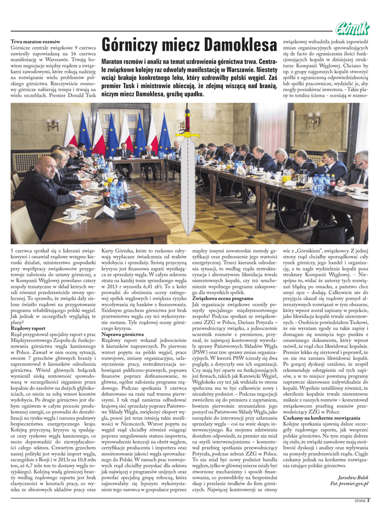 Trwa maraton rozmów Górnicze centrale związkowe 9 czerwca zawiesiły zapowiadaną na 16 czerwca manifestację w Warszawie. Trwają bowiem negocjacje między rządem a związkami zawodowymi, które rokują nadzieję na rozwiązanie wielu problemów polskiego górnictwa. Rzeczywiście rozmowy górnicze nabierają tempa i trwają na wielu szczeblach. Premier Donald Tusk 5 czerwca spotkał się z liderami związkowymi i omawiał rządowe wstępne kierunki działań, ministerstwo gospodarki przy współpracy związkowców przygotowuje założenia do ustawy górniczej, a w Kompanii Węglowej powołano cztery zespoły tematyczne w skład których weszli również przedstawiciele strony społecznej. To sprawiło, że związki dały zielone światło rządowi na przygotowanie programu rehabilitującego polski węgiel. Jak jednak w szczegółach wyglądają te plany? Rządowy raport Rząd przygotował specjalny raport z prac Międzyresortowego Zespołu ds. funkcjonowania górnictwa węgla kamiennego w Polsce. Zawarł w nim ocenę sytuacji, swoiste 7 grzechów głównych branży i zaprezentował 6 kierunków odrodzenia górnictwa. Wśród głównych bolączek wymienił niską rentowność spowodowaną w szczególności sięganiem przez kopalnie do zasobów na dużych głębokościach, co niesie za sobą wzrost kosztów wydobycia. Po drugie górnictwo jest słabym ogniwem w całym procesie produkowanej energii, co prowadzi do destabilizacji na rynku węgla i narusza podstawy bezpieczeństwa energetycznego kraju. Kolejną przyczyną kryzysu są spadające ceny rynkowe węgla kamiennego, co może doprowadzić do niewypłacalności całego sektora. Czwartym grzechem naszej polityki jest wysoki import węgla, szczególnie z Rosji ( w 2013r na 10,8 mln ton, aż 6,7 mln ton to dostawy węgla rosyjskiego). Kolejną wadą górniczej branży według rządowego raportu jest brak elastyczności w kosztach pracy, co wynika ze zbiorowych układów pracy oraz Górniczy miecz Damoklesa Maraton rozmów i analiz na temat uzdrowienia górnictwa trwa. Centrale związkowe kolejny raz odwołały manifestację w Warszawie. Niestety wciąż brakuje konkretnego leku, który uzdrowiłby polski węgiel. Zaś premier Tusk i ministrowie obiecują, że zdejmą wiszącą nad branżą, niczym miecz Damoklesa, groźbę upadku. Karty Górnika, które to rzekomo odrywają wypłacane świadczenia od realiów wydobycia i sprzedaży. Szóstą przyczyną kryzysu jest finansowa zapaść wynikająca ze sprzedaży węgla. W całym sektorze strata na każdej tonie sprzedanego węgla w 2013 r wynosiła 6,41 zł/t. To z kolei prowadzi do obniżenia oceny ratingowej spółek węglowych i zwiększa ryzyko wycofywania się banków z finansowania. Siódmym grzechem górnictwa jest brak przetwórstwa węgla czy też wykorzystanie metanu. Tyle rządowej oceny górniczego kryzysu. Naprawa górnictwa Rządowy raport wskazał jednocześnie 6 kierunków naprawczych. Po pierwsze wzrost popytu na polski węgiel, prace rozwojowe, zmiany organizacyjne, uelastycznienie pracy, restrukturyzacja zobowiązań publiczno-prawnych, poprawa finansów poprzez dofinansowanie, to główne, ogólne założenia programu rządowego. Podczas spotkania 5 czerwca debatowano na razie nad trzema pierwszymi. I tak rząd zamierza odbudować krajową sieć sprzedaży poprzez Państwowe Składy Węgla, zwiększyć eksport węgla, ponoć już teraz istnieją takie możliwości w Niemczech. Wzrost popytu na węgiel rząd chciałby również osiągnąć poprzez uregulowanie statusu importera, wprowadzenie koncesji na obrót węglem, certyfikacje producenta i importera oraz monitorowanie jakości węgla sprowadzanego do Polski. W ramach prac rozwojowych rząd chciałby pozyskać dla sektora jak najwięcej z programów unijnych oraz powołać specjalną grupę roboczą, która zajmowałaby się lepszym wykorzystaniem tego surowca w gospodarce poprzez między innymi nowatorskie metody gazyfikacji oraz podnoszenie jego wartości energetycznej. Trzeci kierunek odrodzenia sytuacji, to według rządu restrukturyzacja i alternatywnie likwidacja trwale nierentownych kopalń, czy też uruchomienie wspólnego programu zakupowego dla wszystkich spółek. Związkowa ocena programu Jak organizacje związkowe oceniły pomysły specjalnego międzyresortowego zespołu? Podczas spotkań ze związkowcami ZZG w Polsce, Dariusz Potyrała – przewodniczący związku, a jednocześnie uczestnik rozmów z premierem, przyznał, że najwięcej kontrowersji wywołały sprawy Państwowych Składów Węgla (PSW) oraz tzw. sprawy zmian organizacyjnych. W kwestii PSW ścierały się dwa poglądy, a dotyczyły one ich organizacji. Czy mają być oparte na funkcjonujących już firmach, takich jak Katowicki Węgiel, Węglokoks czy też jak widziała to strona społeczna ma to być całkowicie nowy i niezależny podmiot. – Podczas negocjacji zwróciłem się do premiera z zapytaniem, bowiem pierwotnie zrozumiałem jego pomysł na Państwowe Składy Węgla, jako narzędzie do interwencji przy załamaniu sprzedaży węgla - coś na wzór skupu interwencyjnego. Ku mojemu zdziwieniu dostałem odpowiedź, że premier nie miał na myśli interwencjonizmu – komentował przebieg spotkania przewodniczący Potyrała, podczas zebrań ZZG w Polsce. To nie miał być nowy podmiot handlu węglem, tylko w głównej mierze miały być stworzone mechanizmy i sposób finansowania, co pozwoliłoby na bezpośredni skup i przelanie środków do firm górniczych. Najwięcej kontrowersji ze strony związkowej wzbudziła jednak zapowiedź zmian organizacyjnych sprowadzających się de facto do ograniczenia ilości funkcjonujących kopalń w dzisiejszej strukturze Kompanii Węglowej. Chciano by np. z grupy najgorszych kopalń stworzyć spółki z ograniczoną odpowiedzialnością lub spółki pracownicze, wydzielić je, aby mogły poszukiwać inwestora. - Takie plany to totalna ściema - oceniają w rozmo- wie z „Górnikiem”, zwi