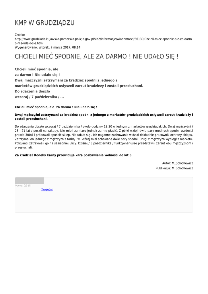 KMP W GRUDZIĄDZU Źródło: http://www.grudziadz.kujawsko-pomorska.policja.gov.pl/kb2/informacje/wiadomosci/36130,Chcieli-miec-spodnie-ale-za-darm o-Nie-udalo-sie.html Wygenerowano: Wtorek, 7 marca 2017, 08:14 CHCIELI MIEĆ SPODNIE, ALE ZA DARMO ! NIE UDAŁO SIĘ ! Chcieli mieć spodnie, ale za darmo ! Nie udało się ! Dwaj mężczyźni zatrzymani za kradzież spodni z jednego z marketów grudziądzkich usłyszeli zarzut kradzieży i zostali przesłuchani. Do zdarzenia doszło wczoraj / 7 października / ... Chcieli mieć spodnie, ale za darmo ! Nie udało się ! Dwaj mężczyźni zatrzymani za kradzież spodni z jednego z marketów grudziądzkich usłyszeli zarzut kradzieży i zostali przesłuchani. Do zdarzenia doszło wczoraj / 7 października / około godziny 18:30 w jednym z marketów grudziądzkich. Dwaj mężczyźni / 23 i 21 lat / poszli na zakupy. Nie mieli zamiaru jednak za nie płacić. Z półki wzięli dwie pary modnych spodni wartości prawie 300zł i próbowali opuścić sklep. Nie udało się . Ich naganne zachowanie widział dokładnie pracownik ochrony sklepu. Zatrzymał on jednego z mężczyzn z torbą , w której miał schowane dwie pary spodni. Drugi z mężczyzn wybiegł z marketu. Policjanci zatrzymali go na sąsiedniej ulicy. Dzisiaj / 8 października / funkcjonariusze przedstawili zarzut obu mężczyznom i przesłuchali. Za kradzież Kodeks Karny przewiduje karę pozbawienia wolności do lat 5. Autor: M_Solochewicz Publikacja: M_Solochewicz Ocena: 0/5 (0) Tweetnij