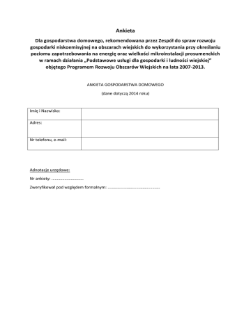 Ankieta Dla gospodarstwa domowego, rekomendowana przez Zespół do spraw rozwoju gospodarki niskoemisyjnej na obszarach wiejskich do wykorzystania przy określaniu poziomu zapotrzebowania na energię oraz wielkości mikroinstalacji prosumenckich w ramach działania „Podstawowe usługi dla gospodarki i ludności wiejskiej” objętego Programem Rozwoju Obszarów Wiejskich na lata 2007-2013. ANKIETA GOSPODARSTWA DOMOWEGO (dane dotyczą 2014 roku) Imię i Nazwisko: Adres: Nr telefonu, e-mail: Adnotacje urzędowe: Nr ankiety: ………………………… Zweryfikował pod względem formalnym: …………………………………………. I. Charakterystyka obiektów budowlanych wchodzących w skład gospodarstwa domowego Wyszczególnienie Obiekt A Obiekt B Rok budowy Posiadany tytuł prawny do obiektu(1) Technologia budowy(2) Powierzchnia ogrzewana w [m2] Powierzchnia południowej ekspozycji dachu pod instalację wykorzystującą energię słońca w [m2] Rodzaj pokrycia dachowego(3) Liczba osób Wykorzystanie gazu z butli Rodzaj ogrzewania Piec - drewno Piec - węgiel Kocioł węglowy Kocioł gazowy Kocioł olejowy Kocioł pelet Instalacja solarna c.w.u. Bojler elektryczny c.w.u. Inny, wskazać jaki ……………………………… (1) Tytuł prawny do władania nieruchomością jest niezbędny do uzyskania przyłącza mikroinstalacji do sieci (najczęściej spotykanymi tytułami do władania nieruchomością są: prawo własności, prawo użytkowania wieczystego, użytkowanie, dzierżawa, najem lub samoistne posiadanie); (2) Technologia budowy – cegła, pustak; (3) Rodzaj pokrycia dachowego – eternit, blacha, itp. II. Wykaz energochłonnych urządzeń elektrycznych w gospodarstwie domowym [kW] Rodzaj urządzenia Moc w [kW] Rodzaj urządzenia Moc w [kW] Lodówka Żelazko Zamrażalka Odkurzacz Pralka Silniki Zmywarka Hydrofor Kuchenka elektryczna Czajnik elektryczny Kuchenka mikrofalowa Grzejnik elektryczny Piekarnik elektryczny Suma żarówek Prodiż Okap kuchenny Podgrzewacz wody (np. bojler) Łączna moc wszystkich urządzeń: ……………………………..kW III. Zużycie energii elektrycznej w gospodarstwie domowym na podstawie rachunków za energię – 2014 r. Zużycie w okresach rozliczeniowych(1) w 2014 r. Wyszczególnienie Zużycie rzeczywiste [kWh] Zużycie szacowane [kWh] Styczeń Luty Marzec Kwiecień Maj Czerwiec Lipiec Sierpień Wrzesień Październik Listopad Grudzień Razem w roku Moc umowna (przyłączeniowa)(2) ………………………….kW. (1) (2) Zużycie podać z podziałem na poszczególne okresy rozliczeniowe (miesięczne, dwumiesięczne lub kwartalne) Moc umowna wynika z podpisanej umowy z operatorem systemu dystrybucyjnego oraz jest wyrażana w „kW”. Często występuje w fakturach za energię pod pozycją „moc umowna” lub w pozycji „ilość” przy opłacie sieciowej stałej lub opłacie przejściowej. Oświadczenie: Zgodnie z art. 23 ust. 1 pkt. 1 ustawy z dnia 29 sierpnia 1997 r. o ochronie danych osobowych (Dz. U. z 2014 r. poz. 1182, z późn. zm.) wyrażam zgodę na przetwarzanie danych osobowych zawartych w ankiecie w celu uzyskania dofinansowania na budowę mikroinstalacji prosumenckich. …………………………………… (data) …………………………………………………. (podpis) Zgodnie z art. 24 ust. 1 ustawy z dnia 29 sierpnia 1997 r. o ochronie danych osobowych (Dz. U. z 2014 r. z późn. zm.) informuje się, że: 1. Administratorem Państwa danych osobowych jest Gmina Trzebownisko. 2. Państwa dane osobowe przetwarzane będą w celu uzyskania dofinansowania na budowę mikroinstalacji prosumenckich. 3. Posiadają Państwo prawo dostępu do treści swoich danych oraz ich poprawiania. 4. Podanie danych osobowych jest dobrowolne i determinuje możliwość uzyskania dofinansowania na budowę mikroinstalacji prosumenckich.