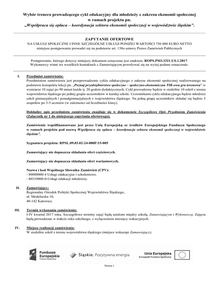 Wybór trenera prowadzącego cykl edukacyjny dla młodzieży z zakresu ekonomii społecznej w ramach projektu pn. „Współpraca się opłaca – koordynacja sektora ekonomii społecznej w województwie śląskim”. ZAPYTANIE OFERTOWE NA USŁUGI SPOŁECZNE I INNE SZCZEGÓLNE USŁUGI PONIŻEJ WARTOŚCI 750 000 EURO NETTO niniejsze postępowanie prowadzi się na podstawie art. 138o ustawy Prawo Zamówień Publicznych Postępowanie, którego dotyczy niniejszy dokument oznaczone jest znakiem: ROPS.PSO.3321.US.1.2017. Wykonawcy winni we wszelkich kontaktach z Zamawiającym powoływać się na wyżej podane oznaczenie. I. Przedmiot zamówienia: Przedmiotem zamówienia jest przeprowadzenie cyklu edukacyjnego z zakresu ekonomii społecznej realizowanego na podstawie konspektu lekcji pn. „Poznaj przedsiębiorstwo społeczne – społeczno-ekonomiczna TIK-owa gra terenowa” w wymiarze 10 zajęć po 90 minut każde tj. 20 godzin dydaktycznych. Cykl prowadzony będzie w siedzibie 10 szkół z terenu województwa śląskiego po jednej grupie uczestników w każdej szkole. Uczestnikami cyklu edukacyjnego będzie młodzież szkół gimnazjalnych i ponadgimnazjalnych z województwa śląskiego. Na jedną grupę uczestników składać się będzie 5 zespołów po 3-5 uczniów (w zależności od liczebności klasy). Dokładny opis przedmiotu zamówienia znajduje się w dokumencie Szczegółowy Opis Przedmiotu Zamówienia (Załącznik nr 1 do niniejszego zapytania ofertowego). Zamówienie współfinansowane jest przez Unię Europejską ze środków Europejskiego Funduszu Społecznego w ramach projektu pod nazwą Współpraca się opłaca – koordynacja sektora ekonomii społecznej w województwie śląskim”. Sygnatura projektu: RPSL.09.03.02-24-000F/15-005 Zamawiający nie dopuszcza składania ofert częściowych. Zamawiający nie dopuszcza składania ofert wariantowych. Nazwa i kod Wspólnego Słownika Zamówień (CPV): - 80000000-4 Usługi edukacyjne i szkoleniowe. - 80310000-0-Usługi edukacji młodzieży. II. Zamawiający: Regionalny Ośrodek Polityki Społecznej Województwa Śląskiego, ul. Modelarska 10, 40-142 Katowice. III. Termin wykonania zamówienia: I-IV kwartał 2017 roku. Szczegółowe terminy zajęć będą ustalone między szkołą, Zamawiającym i Wykonawcą. Zajęcia będą prowadzone w trakcie roku szkolnego, z wyłączeniem miesięcy wakacyjnych. IV. Miejsce realizacji zamówienia: W siedzibie szkół z terenu województwa śląskiego (miejsce wskazuje Zamawiający). Strona 1 V. Warunki udziału w postępowaniu oraz opis sposobu dokonywania oceny spełniania tych warunków: 1. Warunki udziału w postępowaniu oraz opis sposobu dokonywania oceny spełniania tych warunków: a) Uprawnienia do wykonywania określonej działalności lub czynności Opis sposobu dokonywania oceny spełniania tego warunku Nie dotyczy b) Wiedza i doświadczenie Opis sposobu dokonywania oceny spełniania tego warunku Nie dotyczy c) Potencjał techniczny Opis sposobu dokonywania oceny spełniania tego warunku Nie dotyczy d) Osoby zdolne do wykonania zamówienia Opis sposobu dokonywania oceny spełniania tego warunku - Ocena spełnienia warunku będzie dokonana wg formuły spełnia-nie spełnia na podstawie załączonego do oferty dokumentu pn.: Wykaz osób, które będą uczestniczyć w wykonaniu zamówienia, stanowiącego załącznik nr 4 do niniejszego dokumentu. Wymaga się zapewnienia trenera, który musi spełnić niżej wskazane kryteria: - wykształcenie wyższe z zakresu pedagogiki / socjologii / ekonomii / psychologii /politologii / historii lub na innym kierunku uzupełnionym studiami podyplomowymi z zakresu pedagogiki / socjologii / ekonomii / psychologii / politologii / historii (w wykazie należy podać stopień/tytuł naukowy, nazwę uczelni, nazwę ukończonego kierunku studiów); - przeprowadzone minimum 50 godzin szkoleń z zakresu ekonomii społecznej oraz realizacja co najmniej 2 usług polegających na przeprowadzeniu zajęć dla młodzieży o dowolnej tematyce (w wykazie należy podać: nazwę szkolenia/zajęć, zleceniodawcę usługi, liczbę godzin szkolenia/zajęć oraz datę wykonania). UWAGA! W toku postępowania zostanie wybrana 1 oferta, która uzyska największą liczbę punktów. W przypadku wskazania więcej niż jednego trenera, każdy z nich musi spełniać ww. kryteria. Zamawiający zastrzega, że poszczególne zajęcia może prowadzić maksymalnie 1 trener. VI. VII. e) Sytuacja ekonomiczna i finansowa Opis sposobu dokonywania oceny spełniania tego warunku Nie dotyczy f) Dodatkowe warunki Opis sposobu dokonywania oceny spełniania tego warunku Nie dotyczy Wykluczenie wykonawcy W celu uniknięcia konfliktu interesów Zamawiający żąda od Wykonawcy oświadczenia o braku powiązań kapitałowych lub osobowych - załącznik nr 5 do niniejszego zapytania ofertowego. Opis sposobu obliczenia ceny oraz opis kryteriów wyboru oferty: Opis sposobu obliczenia ceny: 1) Wykonawca określa cenę brutto w złotych polskich. 2) Cena musi zawierać wszystkie koszty związane z wykonaniem zamówienia (w tym ewentualne składki na ubezpieczenie społeczne i Fundusz Pracy) i musi być podana cyfrowo i słownie. Jeżeli Wykonawca ma zamiar Strona 2 3) 4) 5) 6) zaproponować jakieś rabaty lub upusty cen, powinien je od razu ująć w obliczeniach ceny, tak aby wyliczona cena za realizację zamówienia była ceną całościową. Wykonawca powinien zapoznać się z całością niniejszego dokumentu, którego integralną częścią są załączniki. Zaokrąglenia cen w złotych należy dokonać do dwóch miejsc po przecinku według ogólnie przyjętych zasad matematycznych. Za cenę oferty uważać się będzie łączną cenę brutto (łącznie z należnym podatkiem VAT). Zamówienie będzie finansowane w co najmniej 70% ze środków publicznych w rozumieniu art. 5 ust. 1 ustawy z dnia 29 sierpnia 2009 roku o finansach publicznych. Opis kryteriów wyboru oferty: 1) Zamawiający wybiera najkorz