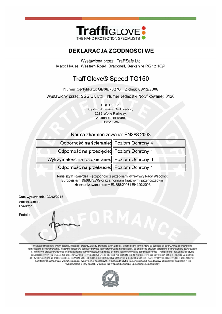 DEKLARACJA ZGODNOŚCI WE Wystawiona przez: TraffiSafe Ltd Maxx House, Western Road, Bracknell, Berkshire RG12 1QP TraffiGlove® Speed TG150 Numer Certyfikatu: GB08/76270 Wystawiony przez: SGS UK Ltd Z dnia: 08/12/2008 Numer Jednostki Notyfikowanej: 0120 SGS UK Ltd, System & Sevice Certification, 202B Worle Parkway, Weston-super-Mare, BS22 6WA Norma zharmonizowana: EN388:2003 Odporność na ścieranie: Poziom Ochrony 4 Odporność na przecięcie: Poziom Ochrony 1 Wytrzymałość na rozdzieranie: Poziom Ochrony 3 Odporność na przekłucie: Poziom Ochrony 1 Niniejszym stwierdza się zgodność z przepisami dyrektywy Rady Wspólnot Europejskich 89/686/EWG oraz z normami krajowymi przenoszącymi zharmonizowane normy EN388:2003 i EN420:2003 Data wystawienia: 02/02/2015 Adrian James Dyrektor Podpis: Wszystkie materiały, w tym zdjęcia, ilustracje, projekty, układy graficzne stron, zdjęcia, teksty pisane i inne, które są częścią tej strony, wraz ze wszystkimi kompilacjami oprogramowania, leżącymi u podstaw kodu źródłowego i oprogramowania na tej stronie, są chronione prawem autorskim, ochroną znaku towarowego i / lub innymi prawami własności intelektualnej na całym świecie, oraz należą do firmy i są kontrolowane zgodnie z licencją TraffiSafe Ltd. Jakiekolwiek użycie zawartości, w tym kopiowanie lub przechowywanie jej w części lub w całości, inne niż osobiste lub do niekomercyjnego użytku jest zabronione, bez uprzedniej zgody upoważnionego przedstawiciela TraffiSafe Ltd . Nie można reprodukować, publikować, przesyłać, publicznie wykorzystywać, rozprowadzać, przedstawiać, modyfikować, adaptować, wiązać, zmieniać, tworzyć dzieł pochodnych, w celach do użytku komercyjnego lub do udziału w jakiejkolwiek sprzedaż y, lub wykorzystania w inny sposób, w całości lub w części bez naszej uprzedniej pisemnej zgody.