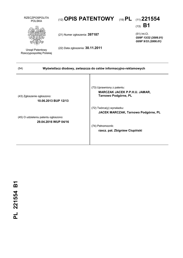 RZECZPOSPOLITA POLSKA (12) OPIS PATENTOWY (19) (21) Numer zgłoszenia: 397187 Urząd Patentowy Rzeczypospolitej Polskiej (54) PL 221554 (13) B1 (11) (51) Int.Cl. G09F 13/22 (2006.01) G09F 9/33 (2006.01) (22) Data zgłoszenia: 30.11.2011 Wyświetlacz diodowy, zwłaszcza do celów informacyjno-reklamowych (73) Uprawniony z patentu: (43) Zgłoszenie ogłoszono: MARCZAK JACEK P.P.H.U. JAMAR, Tarnowo Podgórne, PL 10.06.2013 BUP 12/13 (72) Twórca(y) wynalazku: JACEK MARCZAK, Tarnowo Podgórne, PL (45) O udzieleniu patentu ogłoszono: 29.04.2016 WUP 04/16 (74) Pełnomocnik: PL 221554 B1 rzecz. pat. Zbigniew Ciupiński 2 PL 221 554 B1 Opis wynalazku Przedmiotem wynalazku jest wyświetlacz diodowy, zwłaszcza do celów informacyjno-reklamowych, przeznaczony do uwidocznienia dużej liczby informacji tekstowych i graficznych na stałej powierzchni, przy zachowaniu możliwości ciągłej zmiany prezentowanego tekstu i grafiki. Znany jest z polskiego opisu patentowego 207884 wyświetlacz diodowy posiadający obwodową ramę, wewnątrz której znajduje się prowadnica z dwoma rowkami prowadzącymi. W rowkach prowadnicy jest osadzona osłonowa płyta przednia przepuszczająca światło i osłonowa płyta tylna. Krawędzie obu płyt na całym obwodzie osadzone są w rowkach prowadnicy. Na osłonowej płycie tylnej zamocowana jest mniejsza od niej płyta matrycy diodowej z diodami zainstalowanymi na stronie przedniej i obwodami drukowanymi na stronie odwrotnej, przy czym krawędzie matrycy diodowej mieszczą się wewnątrz obwodu wyznaczonego przez wewnętrzne żebro prowadnicy. Wymiana osłonowej płyty przedniej, narażonej na niszczenie przez wandali, lub elementów znajdujących się wewnątrz obudowy i serwisowanie wymaga kłopotliwego demontażu całego w yświetlacza. Wyświetlacz diodowy według wynalazku, posiadający obudowę zawierającą profile w kształcie ceowników usytuowane jako górny ceownik i boczne ceowniki, tylną ścianę oraz przednią płytę przepuszczającą światło, charakteryzuje się tym, że tylna ściana połączona jest nierozłącznie z górnym ceownikiem i bocznymi ceownikami. Obudowa osadzona jest na nośnym ceowniku tak, że tylna ściana styka się z nośnym ceownikiem po jego zewnętrznej stronie i jest połączona z nim śrubami i nitami. Również przednia płyta styka się z nośnym ceownikiem po jego zewnętrznej stronie, z którym jest połączona za pomocą śrub. W ceowniku nośnym są fasolkowe otwory, w których osadzone są śruby mocujące przednią płytę do nośnego ceownika. Wewnątrz obudowy znajdują się płytki obwodów drukowanych z osadzonymi w nich diodami. Płytki obwodów drukowanych stoją na nośnym ceowniku i z tyłu są połączone z obwodami drukowanymi sterownika. Płytki obwodów drukowanych zawierają elementy mocujące je wewnątrz górnego ceownika oraz elementy ustalające położenie płytek w obudowie. Elementy mocujące i ustalające powodują równoległe usytuowanie płytek obwodów drukowanych do przedniej płyty oraz w określonej odległości od tylnej ściany. Wyświetlacz według wynalazku charakteryzuje podwyższona odporność na warunki pogodowe, w tym deszcz i śnieg, ponieważ dolne krawędzie tylnej ściany i przedniej płyty znajdują się poniżej dna wnętrza obudowy wyznaczonego przez nośny ceownik. Nierozłączne połączenie tylnej ściany z górnym ceownikiem i bocznymi ceownikami, korzystnie za pomocą nitów, zwiększa sztywność obudowy. Wymiana zniszczonej przedniej płyty lub dostęp do elementów znajdujących się wewnątrz obudowy jest bardzo łatwy i sprowadza się do odkręcenia śrub mocujących przednią płytę do nośnego ceownika oraz wysunięcia w dół przedniej płyty. Nie ma potrzeby zdejmowania wyświetlacza ze ściany. Konstrukcja wyświetlacza według wynalazku umożliwia zastosowanie śrub stabilizujących, zapobiegających dodatkowo przesuwaniu się zamocowanych płytek obwodów wewnątrz obudowy. Wyświetlacz zawiera standardowe obwody drukowane wykonane w ogólnodostępnej technologii montażu mieszanego, które są znacznie tańsze od stosowanych w wyświetlaczach matryc diodowych. Mocowanie obwodów drukowanych, sprowadzające się do wsunięcia płaskich elementów mocujących do ceownika, zapewnia ich szybki montaż i demontaż oraz eliminuje konieczność wykonywania otworów w tylnej ścianie dla ich zamocowania. Wykonanie w znanych rozwiązaniach wielu otworów w tylnej ścianie powoduje zmniejszenie szczelności obudowy. Mocowanie takie oraz podparcie obwodów drukowanych przez elementy ustalające powoduje dokładne ustawienie poszczególnych płytek obwodów drukowanych względem siebie i nie ma potrzeby ich centrowania w celu uzyskania równoległości poszczególnych linii. Konstrukcja wyświetlacza według wynalazku umożliwia zastosowanie śrub stabilizujących zapobiegających dodatkowo przesuwaniu się zamocowanych płytek obwodów wewnątrz obudowy. Wyświetlacz może mieć w widoku z przodu kształt kwadratu, prostokąta, trójkąta, krzyża przy czym dopuszcza się wtedy odwrotne montowanie nośnego ceownika dla poprawy walorów estetycznych. Przedmiot wynalazku jest uwidoczniony w przykładzie wykonania na rysunku, na którym fig. 1 przedstawia wyświetlacz w widoku z przodu, fig. 2 przedstawia wyświetlacz w przekroju podłużnym, fig. 3 wyświetlacz w przekroju poprzecznym, fig. 4 szczegół „a”. Wyświetlacz posiada obudowę 1, która zawiera profile w kształcie ceowników ograniczające obudowę od góry i z boków. Do górnego ceownika 2 i bocznych ceowników 3, oraz osadzonych w nich dystansowych ceowników 4, zamocowana jest metalowa tylna ściana 5 za pomocą nitów 6. PL 221 554 B1 3 Przednia płyta 7, wykonana z bezbarwnego przeźroczystego tworzywa, osadzona jest przesuwnie w szczelinach między ceownikami 2 oraz 3 i dystansowymi ceownikami 4. Obudowa ta osadzona jest na nośnym ceowniku 8 kształtującym dno obudowy. Nośny ceownik umieszcz