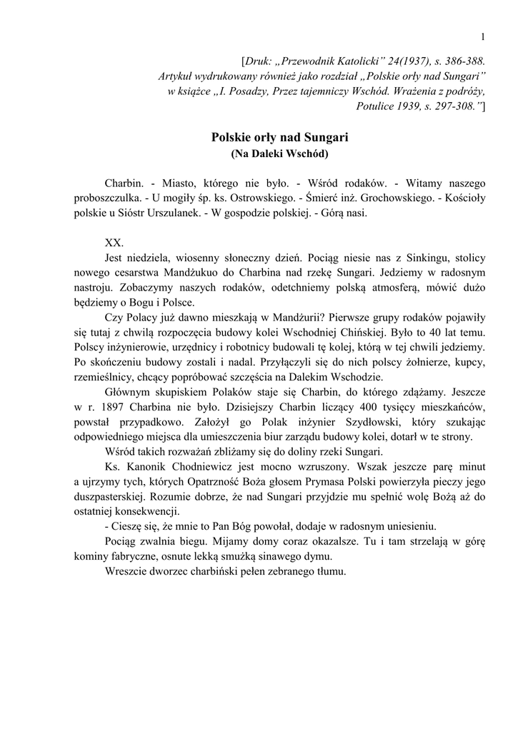 1 [Druk: „Przewodnik Katolicki” 24(1937), s. 386-388. Artykuł wydrukowany również jako rozdział „Polskie orły nad Sungari” w książce „I. Posadzy, Przez tajemniczy Wschód. Wrażenia z podróży, Potulice 1939, s. 297-308.”] Polskie orły nad Sungari (Na Daleki Wschód) Charbin. - Miasto, którego nie było. - Wśród rodaków. - Witamy naszego proboszczulka. - U mogiły śp. ks. Ostrowskiego. - Śmierć inż. Grochowskiego. - Kościoły polskie u Sióstr Urszulanek. - W gospodzie polskiej. - Górą nasi. XX. Jest niedziela, wiosenny słoneczny dzień. Pociąg niesie nas z Sinkingu, stolicy nowego cesarstwa Mandżukuo do Charbina nad rzekę Sungari. Jedziemy w radosnym nastroju. Zobaczymy naszych rodaków, odetchniemy polską atmosferą, mówić dużo będziemy o Bogu i Polsce. Czy Polacy już dawno mieszkają w Mandżurii? Pierwsze grupy rodaków pojawiły się tutaj z chwilą rozpoczęcia budowy kolei Wschodniej Chińskiej. Było to 40 lat temu. Polscy inżynierowie, urzędnicy i robotnicy budowali tę kolej, którą w tej chwili jedziemy. Po skończeniu budowy zostali i nadal. Przyłączyli się do nich polscy żołnierze, kupcy, rzemieślnicy, chcący popróbować szczęścia na Dalekim Wschodzie. Głównym skupiskiem Polaków staje się Charbin, do którego zdążamy. Jeszcze w r. 1897 Charbina nie było. Dzisiejszy Charbin liczący 400 tysięcy mieszkańców, powstał przypadkowo. Założył go Polak inżynier Szydłowski, który szukając odpowiedniego miejsca dla umieszczenia biur zarządu budowy kolei, dotarł w te strony. Wśród takich rozważań zbliżamy się do doliny rzeki Sungari. Ks. Kanonik Chodniewicz jest mocno wzruszony. Wszak jeszcze parę minut a ujrzymy tych, których Opatrzność Boża głosem Prymasa Polski powierzyła pieczy jego duszpasterskiej. Rozumie dobrze, że nad Sungari przyjdzie mu spełnić wolę Bożą aż do ostatniej konsekwencji. - Cieszę się, że mnie to Pan Bóg powołał, dodaje w radosnym uniesieniu. Pociąg zwalnia biegu. Mijamy domy coraz okazalsze. Tu i tam strzelają w górę kominy fabryczne, osnute lekką smużką sinawego dymu. Wreszcie dworzec charbiński pełen zebranego tłumu. 2 Stawili się wszyscy. Ks. Eysmontt, prawa ręka śp. ks. prałata Ostrowskiego przedstawia p. konsula Karałkowskiego, p. wicekonsula Zalewskiego, ks. Leszczaczowicza, proboszcza parafii polskiej na Przystani, O. Mażonowicza, marianina oraz obecnych rodaków. Tym razem nie mamy żadnych kłopotów ani z bagażem, czy też z innymi formalnościami. Kochani rodacy załatwiają wszystko na swój rachunek. Samochód p. konsula Karałkowskiego niesie nas do kościoła św. Stanisława. Ponad chłodnicą dumnie trzepocze Orzeł Biały na amarantowym tle. Jedziemy w blaskach wiośnianego słońca. Szeroka asfaltowana awenida tak się wystroiła, że nie powstydzono by się jej w Warszawie. - To już zasługa nowego cesarza, odzywa się p. konsul. Na wieść, że cesarz pragnie odwiedzić Charbin, magistrat miasta nie szczędził pieniędzy, żeby tylko jak najlepiej przyozdobić miasto. Budowano ulice, naprawiano domy, ploty, latarnie, stojące często od parady. Słowem wizyta cesarska była dobrodziejstwem. Samochód staje przed kościołem na Grand Prospect 27, Wchodzimy do świątyni. Korzymy się przed Bogiem w dziękczynnej modlitwie. Jest za co dziękować po szczęśliwie odbytej dalekiej podróży. Bogu polecamy dalsze losy tej wysepki polskiej na Dalekim Wschodzie. Dobrotliwie spogląda na nas z obrazu Matka Boska Częstochowska, Królowa Wychodźstwa Polskiego. I nad Sungarii sprawuje opiekę matczyną ta Niebieska Pani. - Witamy naszego proboszczulka, odzywają się różne głosy przy wyjściu z kościoła. Same polskie twarze. Wielkie niebieskie oczy, włosy jasne, płowe. Tu i tam majaczą skośne oczy chińskie, patrzące z zaciekawieniem na nowego proboszcza. Z lewej strony od wejścia znajduje się grób ks. prałata Władysława Ostrowskiego, zasłużonego kapłana patrioty, budowniczego kościoła, organizatora charbińskiej parafii. Klękamy przy grobie i modlimy się za jego szlachetną duszę. Zmęczony pracą chciał jeszcze przed śmiercią odwiedzić Polskę. Pojechał a nawet spędził pewien czas w Potulicach. Młodym Chrystusowym, przyszłym misjonarzom na wychodztwie udzielił jakby w testamencie swego ducha i zapału. Wrócił znowu do Charbina, lecz już tylko po to, by za kilka miesięcy umrzeć na posterunku. Grób jego skromny, żołnierski, otoczony jest czcią. Niejeden idąc ulicą, zbacza, by przyklęknąć i pomodlić się przy grobie ukochanego duszpasterza. Przywiozłem z Polski trochę ziemi na księdza. Władysławowa mogiłę. Niech będzie znakiem wiadomym łączności wychodztwa z Polską Macierzą. Idziemy na plebanię. Ks. Eysmontt wita nowego proboszcza chlebem i solą. Krótko odpowiada ks. Chodniewicz na to powitanie. 3 - Przychodzę do was w imię Pańskie. Pragnę tu pracować ofiarnie dla dobra Kościoła, Narodu i waszych nieśmiertelnych dusz. [s. 386] Przyjmują wszystkich z staropolską gościnnością. Serce do serca się zbliża. Oczy się palą. Nagadać się z nami nie mogą nasi kochani rodacy. - A nie mogliśmy się doczekać - a juści... powtarzają z okrutnej radości. Nowy proboszcz zdobył sobie od razu serca wszystkich. Lgną do niego, jak do ojca. Zbliżają się, by ze czcią ucałować jego kapłańską dłoń. Zjawia się nawet przedstawiciel kolonii rosyjskiej nie czasem tej czerwonej, lecz antybolszewickiej, białej. Starszy już pan, dobrze ułożony, wita ks. kanonika w imieniu wszystkich Rosjan, wierzących. Jest on zarazem redaktorem gazety rosyjskiej. Więc przy tej sposobności kilka pytań i wywiad gotowy. Najwięcej zaciekawia go fakt, że ks. Chodniewicz razem z ks. arcyb. Cieplakiem siedział we więzieniu moskiewskim, skazany przez bolszewików. Dzwony dzwonią tak dziwnie żałośnie. To pogrzeb śp. inżyniera Kazimierza Grochowskiego, jednego z najzasluż