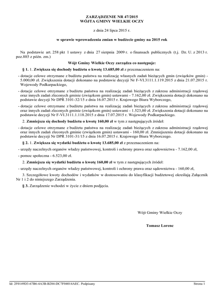 ZARZĄDZENIE NR 47/2015 WÓJTA GMINY WIELKIE OCZY z dnia 24 lipca 2015 r. w sprawie wprowadzenia zmian w budżecie gminy na 2015 rok Na podstawie art. 258 pkt 1 ustawy z dnia 27 sierpnia 2009 r. o finansach publicznych (t.j. Dz. U. z 2013 r. poz.885 z późn. zm.) Wójt Gminy Wielkie Oczy zarządza co następuje: § 1. 1. Zwiększa się dochody budżetu o kwotę 13.685,00 zł z przeznaczeniem na: - dotacje celowe otrzymane z budżetu państwa na realizację własnych zadań bieżących gmin (związków gmin) 5.000,00 zł. Zwiększenia dotacji dokonano na podstawie decyzji Nr F-VI.3111.1.119.2015 z dnia 21.07.2015 r. Wojewody Podkarpackiego, - dotacje celowe otrzymane z budżetu państwa na realizację zadań bieżących z zakresu administracji rządowej oraz innych zadań zleconych gminie (związkom gmin) ustawami - 7.162,00 zł. Zwiększenia dotacji dokonano na podstawie decyzji Nr DPR 3101-32/15 z dnia 16.07.2015 r. Krajowego Biura Wyborczego, - dotacje celowe otrzymane z budżetu państwa na realizację zadań bieżących z zakresu administracji rządowej oraz innych zadań zleconych gminie (związkom gmin) ustawami - 1.523,00 zł. Zwiększenia dotacji dokonano na podstawie decyzji Nr F-VI.3111.1.118.2015 z dnia 17.07.2015 r. Wojewody Podkarpackiego. 2. Zmniejsza się dochody budżetu o kwotę 160,00 zł w tym z następujących źródeł: - dotacje celowe otrzymane z budżetu państwa na realizację zadań bieżących z zakresu administracji rządowej oraz innych zadań zleconych gminie (związkom gmin) ustawami - 160,00 zł. Zmniejszenia dotacji dokonano na podstawie decyzji Nr DPR 3101-31/15 z dnia 16.07.2015 r. Krajowego Biura Wyborczego. § 2. 1. Zwiększa się wydatki budżetu o kwotę 13.685,00 zł z przeznaczeniem na: - urzędy naczelnych organów władzy państwowej, kontroli i ochrony prawa oraz sądownictwa - 7.162,00 zł, - pomoc społeczna - 6.523,00 zł. 2. Zmniejsza się wydatki budżetu o kwotę 160,00 zł w tym z następujących źródeł: - urzędy naczelnych organów władzy państwowej, kontroli i ochrony prawa oraz sądownictwa - 160,00 zł, 3. Szczegółowe kwoty dochodów i wydatków w dostosowaniu do klasyfikacji budżetowej określają Załącznik Nr 1 i 2 do niniejszego Zarządzenia. § 3. Zarządzenie wchodzi w życie z dniem podjęcia. Wójt Gminy Wielkie Oczy Tomasz Lorenc Id: 2F0149D3-67B6-4A3B-B284-DC7F04014AEC. Podpisany Strona 1 Załącznik Nr 1 do Zarządzenia Nr 47/2015 Wójta Gminy Wielkie Oczy z dnia 24 lipca 2015 r. Zestawienie dochodów w dostosowaniu do klasyfikacji budżetowej Zwiększenie dochodów Dział Rozdział § 751 75110 2010 852 85214 2030 85219 2010 Nazwa /działu, rozdziały, paragrafu/ Urzędy naczelnych organów władzy państwowej, kontroli i ochrony prawa oraz sądownictwa Referenda ogólnokrajowe i konstytucyjne Dotacje celowe otrzymane z budżetu państwa na realizację zadań bieżących z zakresu administracji rządowej oraz innych zadań zleconych gminie (związkom gmin) ustawami Pomoc społeczna Zasiłki i pomoc w naturze oraz składki na ubezpieczenia emerytalne i rentowe Dotacje celowe otrzymane z budżetu państwa na realizację własnych zadań bieżących gmin (związków gmin) Ośrodki pomocy społecznej Dotacje celowe otrzymane z budżetu państwa na realizację zadań bieżących z zakresu administracji rządowej oraz innych zadań zleconych gminie (związkom gmin) ustawami Razem: Kwota w zł 7.162,00 7.162,00 7.162,00 6.523,00 5.000,00 5.000,00 1.523,00 1.523,00 13.685,00 Zmniejszenie dochodów Dział Rozdział § 751 75107 2010 Nazwa /działu, rozdziały, paragrafu/ Urzędy naczelnych organów władzy państwowej, kontroli i ochrony prawa oraz sądownictwa Wybory Prezydenta Rzeczypospolitej Polskiej Dotacje celowe otrzymane z budżetu państwa na realizację zadań bieżących z zakresu administracji rządowej oraz innych zadań zleconych gminie (związkom gmin) ustawami Razem: Kwota w zł 160,00 160,00 160,00 160,00 Wójt Gminy Wielkie Oczy Tomasz Lorenc Id: 2F0149D3-67B6-4A3B-B284-DC7F04014AEC. Podpisany Strona 1 Załącznik Nr 2 do Zarządzenia Nr 47/2015 Wójta Gminy Wielkie Oczy z dnia 24 lipca 2015 r. Zestawienie wydatków w dostosowaniu do klasyfikacji budżetowej Zwiększenie wydatków Dział Rozdział § 751 75110 3030 4110 4120 4170 4210 4300 4410 852 85214 3110 85219 3110 4210 Nazwa /działu, rozdziały, paragrafu/ Urzędy naczelnych organów władzy państwowej, kontroli i ochrony prawa oraz sądownictwa Referenda ogólnokrajowe i konstytucyjne Różne wydatki na rzecz osób fizycznych Składki na ubezpieczenia społeczne Składki na Fundusz Pracy Wynagrodzenia bezosobowe Zakup materiałów i wyposażenia Zakup usług pozostałych Podróże służbowe krajowe Pomoc społaczna Zasiłki i pomoc w naturze oraz składki na ubezpieczenia emerytalne i rentowe Świadczenia społeczne Ośrodki pomocy społecznej Świadczenia społeczne Zakup materiałów i wyposażenia Razem: Kwota w zł 7.162,00 7.162,00 420,42 688,46 98,12 4.005,00 1.350,00 100,00 500,00 6.523,00 5.000,00 5.000,00 1.523,00 1.500,00 23,00 13.685,00 Zmniejszenie wydatków Dział Rozdział § Nazwa /działu, rozdziały, paragrafu/ 3030 Urzędy naczelnych organów władzy państwowej, kontroli i ochrony prawa oraz sądownictwa Wybory Prezydenta Rzeczypospolitej Polskiej Różne wydatki na rzecz osób fizycznych 751 75107 Razem: Kwota w zł 160,00 160,00 160,00 160,00 Wójt Gminy Wielkie Oczy Tomasz Lorenc Id: 2F0149D3-67B6-4A3B-B284-DC7F04014AEC. Podpisany Strona 1