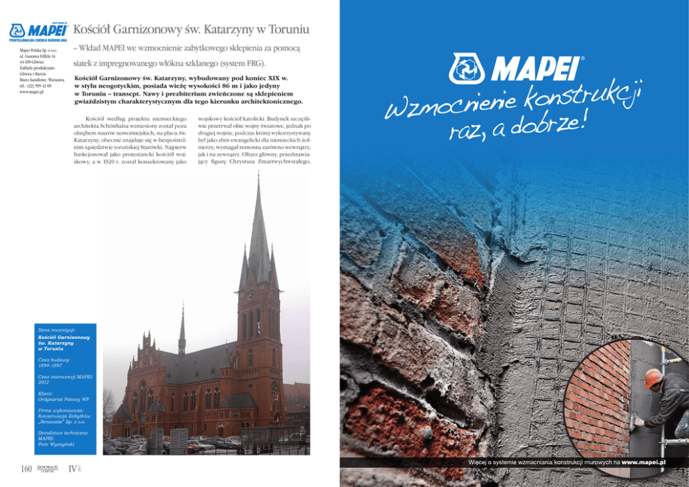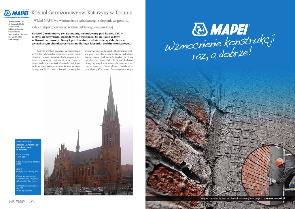Kościół Garnizonowy św. Katarzyny w Toruniu – Wkład MAPEI we wzmocnienie zabytkowego sklepienia za pomocą Mapei Polska Sp. z o.o. ul. Gustawa Eiffela 14 44-109 Gliwice Zakłady produkcyjne: Gliwice i Barcin Biuro handlowe: Warszawa tel.: (22) 595 42 00 www.mapei.pl siatek z impregnowanego włókna szklanego (system FRG). Kościół Garnizonowy św. Katarzyny, wybudowany pod koniec XIX w. w stylu neogotyckim, posiada wieżę wysokości 86 m i jako jedyny w Toruniu – transept. Nawy i prezbiterium zwieńczone są sklepieniem gwiaździstym charakterystycznym dla tego kierunku architektonicznego. Kościół według projektu niemieckiego architekta Schönhalsa wzniesiony został poza obrębem murów nowomiejskich, na placu św. Katarzyny, obecnie znajduje się w bezpośrednim sąsiedztwie toruńskiej Starówki. Najpierw funkcjonował jako protestancki kościół wojskowy, a w 1920 r. został konsekrowany jako wojskowy kościół katolicki. Budynek szczęśliwie przetrwał obie wojny światowe, jednak po drugiej wojnie, podczas której wykorzystywany był jako zbór ewangelicki dla niemieckich żołnierzy, wymagał remontu zarówno wewnątrz, jak i na zewnątrz. Ołtarz główny, przedstawiający figurę Chrystusa Zmartwychwstałego, C M Y CM MY CY CMY K Dane inwestycji: Kościół Garnizonowy św. Katarzyny w Toruniu Czas budowy: 1894–1897 Czas interwencji MAPEI: 2012 Klient: Ordynariat Polowy WP Firma wykonawcza: Konserwacja Zabytków „Renovatio” Sp. z o.o. RENOWACJE I ZABYTKI IV IV 2013 160 2013 Doradztwo techniczne MAPEI: Piotr Wyszyński RENOWACJE I ZABYTKI 161 oraz pozostałe rzeźby, którymi ozdobiono kościół, wykonane zostały przez rzeźbiarza Ignacego Zelka. W oknach prezbiterium znajdują się witraże z wizerunkami świętych, wykonane w 1897 r. w Toruniu. W kościele posłuchać można dźwięku 35-głosowych organów. W ostatnich latach przeprowadzono prace remontowo-konserwatorskie, w wyniku których odnowiona została południowa elewacja, wieża, cztery tarcze zegarowe oraz dach świątyni. MAPEI: system FRG i bezcementowe zaprawy renowacyjne Obiekt wymagał wykonania wzmocnień konstrukcji murowych stropu (sklepienia łukowe). Firma wykonawcza, przy współpracy specjalistów MAPEI, zaproponowała technologię, polegającą na wklejeniu siatek z impregnowanego włókna szklanego, przeznaczonych do obiektów zabytkowych. Do scalenia rys w konstrukcji zastosowano MAPE-ANTIQUE I. Jest to mieszanka spoiwa hydraulicznego z mikrowypełniaczami, specjalnymi dodatkami pucolanowymi. Wymieszany z wodą (ok. 35%), tworzy płynny, stabilny i jednorodny zaczyn, który wypełnia szczeliny konstrukcji, wymagające konsolidacji (stopniowo utwardza się w reakcji pucolanowej bez reagowania z cegłami, kamieniem i zaprawą murarską, nawet w obecności rozpuszczalnych soli w konstrukcjach poddawanych iniekcji). W przeciwieństwie do cementu, podczas hydratacji MAPE-ANTIQUE I nie powstają substancje alkaliczne (zawierające sód czy potas), które mogłyby wywołać niebezpieczne zjawiska ekspansji w kontakcie z reaktywnym kruszywem (reakcja alkalia-kruszywo). Oprócz materiału naprawczego, w pracach prowadzonych w obiektach zabytkowych, ważna jest również sama technika zalewania rys. Zaleca się wykonanie ręczne, bez użycia urządzeń mechanicznych, etapami, tak by wcześniejsza warstwa zdążyła związać i aby nie wywoływała nadmiernych naprężeń muru. Następnie na powierzchni sklepień rozprowadzono 3-4-milimetrową warstwę PLANITOP HDM RESTAURO – dwuskładnikowej zaprawy o wysokiej plastyczności i jasnej barwie, na bazie naturalnego wapna hydraulicznego (NHL) i ekologicznej pucolany, stosowanej do wzmacniania i wyrównywania powierzchni konstrukcji murowych. W warstwę świeżej zaprawy wklejono siatkę MAPEGRID G 220, dociskając ją lekko płaską pacą, aby idealnie wtopiła się w warstwę zaprawy. Dzięki specjalnemu ułożeniu włókien naprężenia we wzmacnianej MAPEGRID G 220 konstrukcji murowej są równomiernie rozkładane, co powoduje wzrost odporności konstrukcji na kruche pęknięcia. Dodatkowo, gdy konstrukcja poddana jest przemieszczeniu, wzmacnia się poprzez rozkład sił na całej powierzchni elementów zarówno w spoinach, jak i w konstrukcji murowej. Ostatnim etapem było nałożenie drugiej zamykającej i całkowicie przykrywającej siatkę warstwy zaprawy PLANITOP HDM RESTAURO o jednakowej grubości 2-3 mm. Agata Borys Fotografie: Archiwum Renovatio Bazylika Świętego Bernarda (L’Aquila, Włochy) – Wkład MAPEI we wzmocnienie konstrukcji zabytkowej kopuły za pomocą taśm i mat z włókien węglowych (system FRP) Mapei Polska Sp. z o.o. ul. Gustawa Eiffela 14 44-109 Gliwice Zakłady produkcyjne: Gliwice i Barcin Biuro handlowe: Warszawa tel.: (22) 595 42 00 www.mapei.pl Bazylika San Bernardino jest zlokalizowana w sercu starej części miasta L’Aquila. Jej zwieńczeniem są kręte, zabytkowe schody, na szczycie których rozpościera się wspaniały widok od Piazza Bariscianello do bazyliki. Potężne trzęsienie ziemi, które nawiedziło L’Aquillę 6 kwietnia 2009 roku, uszkodziło frontową część bazyliki oraz częściowo zniszczyło zabytkową dzwonnicę. Struktura kopuły, ściany bazyliki oraz przyległego klasztoru również zostały poważnie naruszone. MAPEI: system FRP i bezcementowe zaprawy renowacyjne Specjalny zespół doradców technicznych MAPEI został oddelegowany do L’Aquilli, by uczestniczyć w odbudowie zabytkowego miasta. Dokonali oni m.in. szczegółowej analizy zniszczeń ścian podtrzymujących kopułę oraz samej kopuły bazyliki, a w styczniu 2010 roku rozpoczęły się wieloetapowe prace renowacyjne: – wypełnienie dużych pęknięć wewnątrz przy użyciu dwuskładnikowej zaprawy PLANITOP HDM RESTAURO nakładanej metodą natrysku; – wypełnienie dużych pęknięć na zewnątrz (PLANITOP HDM RESTAURO, MAPE-ANTIQUE STRUTTURALE NHL oraz MAPE-ANTIQUE I) oraz rekonstrukcja zewnętrznych powi