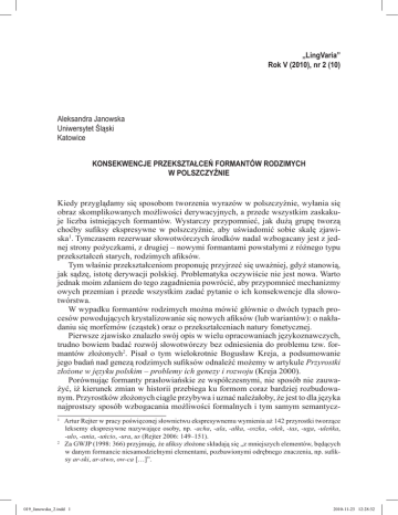 „LingVaria” Rok V (2010), nr 2 (10) Aleksandra Janowska Uniwersytet Śląski Katowice Konsekwencje przekształceń formantów rodzimych w polszczyźnie Kiedy przyglądamy się sposobom tworzenia wyrazów w polszczyźnie, wyłania się obraz skomplikowanych możliwości derywacyjnych, a przede wszystkim zaskakuje liczba istniejących formantów. Wystarczy przypomnieć, jak dużą grupę tworzą choćby sufiksy ekspresywne w polszczyźnie, aby uświadomić sobie skalę zjawiska1. Tymczasem rezerwuar słowotwórczych środków nadal wzbogacany jest z jednej strony pożyczkami, z drugiej – nowymi formantami powstałymi z różnego typu przekształceń starych, rodzimych afiksów. Tym właśnie przekształceniom proponuję przyjrzeć się uważniej, gdyż stanowią, jak sądzę, istotę derywacji polskiej. Problematyka oczywiście nie jest nowa. Warto jednak moim zdaniem do tego zagadnienia powrócić, aby przypomnieć mechanizmy owych przemian i przede wszystkim zadać pytanie o ich konsekwencje dla słowotwórstwa. W wypadku formantów rodzimych można mówić głównie o dwóch typach procesów powodujących krystalizowanie się nowych afiksów (lub wariantów): o nakładaniu się morfemów (cząstek) oraz o przekształceniach natury fonetycznej. Pierwsze zjawisko znalazło swój opis w wielu opracowaniach językoznawczych, trudno bowiem badać rozwój słowotwórczy bez odniesienia do problemu tzw. formantów złożonych2. Pisał o tym wielokrotnie Bogusław Kreja, a podsumowanie jego badań nad genezą rodzimych sufiksów odnaleźć możemy w artykule Przyrostki złożone w języku polskim – problemy ich genezy i rozwoju (Kreja 2000). Porównując formanty prasłowiańskie ze współczesnymi, nie sposób nie zauważyć, iż kierunek zmian w historii przebiega ku formom coraz bardziej rozbudowanym. Przyrostków złożonych ciągle przybywa i uznać należałoby, że jest to dla języka najprostszy sposób wzbogacania możliwości formalnych i tym samym semantycz Artur Rejter w pracy poświęconej słownictwu ekspresywnemu wymienia aż 142 przyrostki tworzące leksemy ekspresywne nazywające osoby, np. -acha, -ala, -ałka, -oszka, -ołek, -tas, ‑uga, -uleńka, -ulo, -unia, -uńcio, -ura, us (Rejter 2006: 149–151). 2 Za GWJP (1998: 366) przyjmuję, że afiksy złożone składają się „z mniejszych elementów, będących w danym formancie niesamodzielnymi elementami, pozbawionymi odrębnego znaczenia, np. sufiksy ar-ski, ar-stwo, ow-ca […]”. 1 019_Janowska_2.indd 1 2010-11-23 12:28:32 114 Aleksandra Janowska nych słowotwórstwa. Rzecz tyczy oczywiście jedynie sufiksów. Na tę specyficzną cechę przyrostków zwrócił już uwagę w XIX w. Mikołaj Kruszewski, podkreślając że w odróżnieniu od prefiksu sufiksowi właściwa jest „zmienność nagłosu będąca pochodzenia morfologicznego” (Kruszewski 1967: 102), a tym samym może być on rozbudowywany lewostronnie. Ze względu na swoją pozycję względem tematu przedrostek podobnych możliwości jest w zasadzie pozbawiony. Przejmowanie elementów nagłosu bowiem napotyka w języku na poważne bariery3. A zatem prefiksy nie tworzą złożonych form, które można byłoby określić mianem „przyrostka złożonego’, por. połączenia morfemowe typu po-wy-nosić, na-z-bierać nie powodują powstania nowego formantu. Wspomnianą zdolność „rozbudowy” przejmują również sufiksy obcego pochodzenia; choć różnią się nieco preferencjami względem rodzimych, także podlegają rozszerzeniom, absorpcjom (por. -aik: algebraik; -atyk: astmatyk; ‑izacja: potencjalizacja)4. Nie dziwi więc w polszczyźnie duża różnica ilościowa między sufiksami a prefiksami. Warto byłoby w tym miejscu przypomnieć w skrócie, o jakie elementy następuje rozszerzenie pierwotnego prostego sufiksu. Najczęściej w języku spotykamy się z nałożeniem się na siebie dwóch formantów różnych pod względem funkcyjnym, na przykład na formant -owiec złożył się przymiotnikowy morfem -ow- i rzeczownikowy -ec; podobnie przyrostek -anka powstał z absorpcji -an- i -ka. W takim wypadku najczęstszą przyczyną wyodrębnienia się formantu złożonego jest reinterpretacja, która prowadzi do zmiany motywacji. Możemy powiedzieć za Krystyną Kleszczową, że dochodzi do przeskoków motywacyjnych. I tak na przykład staropolskie derywaty typu oprawczanka pierwotnie tworzone od przymiotnika na -ny, przyjmując wtórnie motywację rzeczownikową, dały asumpt do wykrystalizowania się przyrostka -anka (Kleszczowa 1998: 16–18). Czasami mamy do czynienia z nieco bardziej skomplikowanymi procesami rozbudowywania formantów w drodze analogii, por. -szczyzna (-sk- + -izna) w leksemie cerkiewszczyzna wywodzi się z derywatów typu polszczyzna, angielszczyzna, mających za podstawę przymiotnik na -ski (Kreja 2000: 68). Szczególnie interesujące są jednak absorpcje dwóch formantów tożsamych funkcyjnie lub zbliżonych semantycznie. To nieco rzadsze zjawisko, ale warte uwagi, tym bardziej że nakładanie się formantów współfunkcyjnych znane było już prasłowiańszczyźnie. Świadczą o tym dzieje formantu -ьca, utworzonego – zdaniem Sławskiego – z kontaminacji formantu paradygmatycznego typu *vojevoda z sufiksem -ьcь (Sławski 1974: 102). Za przykład charakterystyczny dla polszczyzny mogą posłużyć derywaty typu bluźnierca, morderca. We współczesnym języku wchodzą w związek motywacyjny z czasownikami: bluźnić, mordować, a zatem tworzone są formantem złożonym -erca. Materiał historyczny pozwala uznać, że w XIV–XV w. rzeczowniki tego typu wiązały się słowotwórczo z podstawami rzeczownikowymi: Sytuacja odwrotna, gdy część formantu zostaje przejęta przez podstawę, zdarza się rzadko i nie ma konsekwencji słowotwórczych; są to pojedyncze akty, por. obaczyć – utworzony został za pomocą ob- (ob+aczyć); podział: o+baczyć przyjęty został wtórnie. 4 Przykłady podaję za Waszakowa 1991