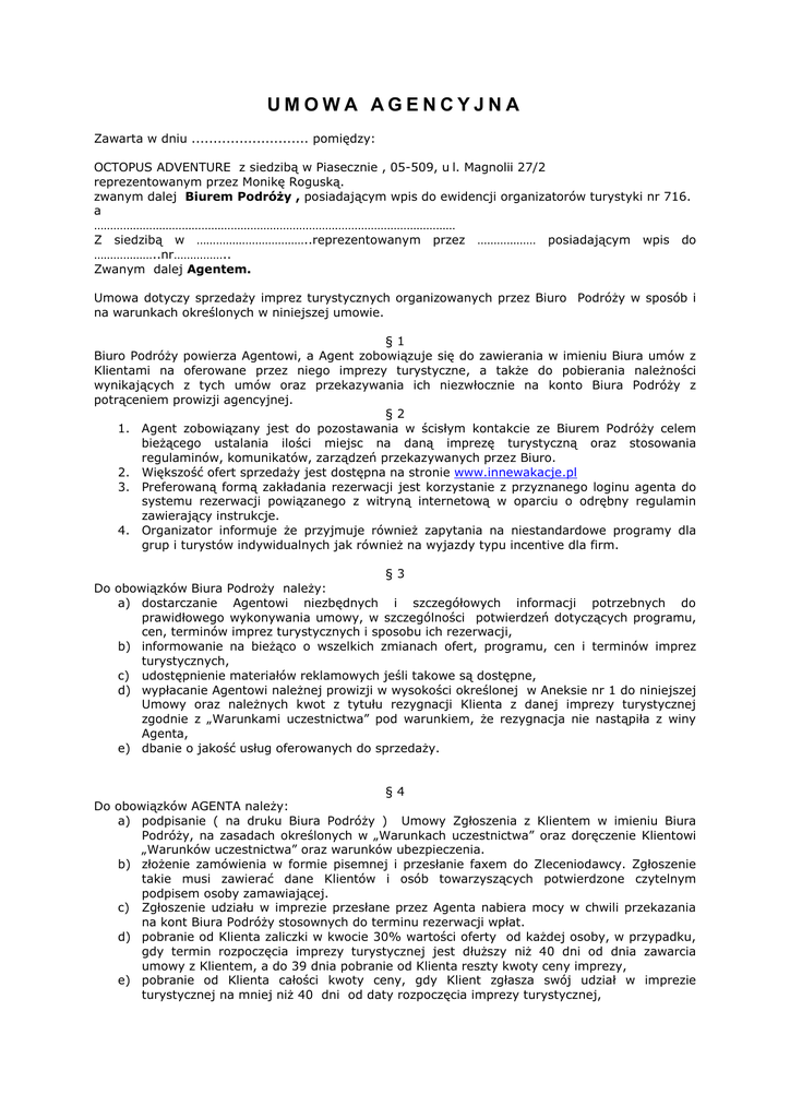 UMOWA AGENCYJNA Zawarta w dniu ........................... pomiędzy: OCTOPUS ADVENTURE z siedzibą w Piasecznie , 05-509, u l. Magnolii 27/2 reprezentowanym przez Monikę Roguską. zwanym dalej Biurem PodróŜy , posiadającym wpis do ewidencji organizatorów turystyki nr 716. a ………………………………………………………………………………………………… Z siedzibą w ……………………………..reprezentowanym przez ……………… posiadającym wpis do ………………..nr…………….. Zwanym dalej Agentem. Umowa dotyczy sprzedaŜy imprez turystycznych organizowanych przez Biuro PodróŜy w sposób i na warunkach określonych w niniejszej umowie. §1 Biuro PodróŜy powierza Agentowi, a Agent zobowiązuje się do zawierania w imieniu Biura umów z Klientami na oferowane przez niego imprezy turystyczne, a takŜe do pobierania naleŜności wynikających z tych umów oraz przekazywania ich niezwłocznie na konto Biura PodróŜy z potrąceniem prowizji agencyjnej. §2 1. Agent zobowiązany jest do pozostawania w ścisłym kontakcie ze Biurem PodróŜy celem bieŜącego ustalania ilości miejsc na daną imprezę turystyczną oraz stosowania regulaminów, komunikatów, zarządzeń przekazywanych przez Biuro. 2. Większość ofert sprzedaŜy jest dostępna na stronie www.innewakacje.pl 3. Preferowaną formą zakładania rezerwacji jest korzystanie z przyznanego loginu agenta do systemu rezerwacji powiązanego z witryną internetową w oparciu o odrębny regulamin zawierający instrukcje. 4. Organizator informuje Ŝe przyjmuje równieŜ zapytania na niestandardowe programy dla grup i turystów indywidualnych jak równieŜ na wyjazdy typu incentive dla firm. §3 Do obowiązków Biura PodroŜy naleŜy: a) dostarczanie Agentowi niezbędnych i szczegółowych informacji potrzebnych do prawidłowego wykonywania umowy, w szczególności potwierdzeń dotyczących programu, cen, terminów imprez turystycznych i sposobu ich rezerwacji, b) informowanie na bieŜąco o wszelkich zmianach ofert, programu, cen i terminów imprez turystycznych, c) udostępnienie materiałów reklamowych jeśli takowe są dostępne, d) wypłacanie Agentowi naleŜnej prowizji w wysokości określonej w Aneksie nr 1 do niniejszej Umowy oraz naleŜnych kwot z tytułu rezygnacji Klienta z danej imprezy turystycznej zgodnie z „Warunkami uczestnictwa” pod warunkiem, Ŝe rezygnacja nie nastąpiła z winy Agenta, e) dbanie o jakość usług oferowanych do sprzedaŜy. §4 Do obowiązków AGENTA naleŜy: a) podpisanie ( na druku Biura PodróŜy ) Umowy Zgłoszenia z Klientem w imieniu Biura PodróŜy, na zasadach określonych w „Warunkach uczestnictwa” oraz doręczenie Klientowi „Warunków uczestnictwa” oraz warunków ubezpieczenia. b) złoŜenie zamówienia w formie pisemnej i przesłanie faxem do Zleceniodawcy. Zgłoszenie takie musi zawierać dane Klientów i osób towarzyszących potwierdzone czytelnym podpisem osoby zamawiającej. c) Zgłoszenie udziału w imprezie przesłane przez Agenta nabiera mocy w chwili przekazania na kont Biura PodróŜy stosownych do terminu rezerwacji wpłat. d) pobranie od Klienta zaliczki w kwocie 30% wartości oferty od kaŜdej osoby, w przypadku, gdy termin rozpoczęcia imprezy turystycznej jest dłuŜszy niŜ 40 dni od dnia zawarcia umowy z Klientem, a do 39 dnia pobranie od Klienta reszty kwoty ceny imprezy, e) pobranie od Klienta całości kwoty ceny, gdy Klient zgłasza swój udział w imprezie turystycznej na mniej niŜ 40 dni od daty rozpoczęcia imprezy turystycznej, f) w przypadku kiedy impreza opiera się o lotnicze połączenie rejsowe, klient po zaakceptowaniu rezerwacji przelotu zobowiązany jest do wpłaty 100% równowartości ceny biletu w terminie odpowiadającym zakomunikowanej dacie wykupu biletu bez względu na termin rozpoczęcia imprezy. g) przekazanie kwot, o których mowa w lit. d-e na konto Zleceniodawcy w ciągu 3 dni od otrzymania wpłaty od Klienta przelewem na konto Biura PodróŜy h) prowadzenie dokumentacji i ewidencji zgłoszeń, i) przyjęcie wpłaty zgodnie z cennikami Biura PodróŜy. §5 Biuro PodróŜy zastrzega sobie prawo do zmian publikowanych cen, jak równieŜ warunków uczestnictwa (np. programu imprezy, podróŜy) informując Agenta o wszelkich zmianach ze stosownym wyprzedzeniem. §6 Biuro PodróŜy odpowiada za jakość organizowanych imprez gwarantując jakość stanu faktycznego z informacjami zamieszczonymi w ofercie bądź teŜ w innych materiałach reklamowych. §7 Agent ponosi odpowiedzialność za skutki umów z Klientami, które zostały zawarte niezgodnie z warunkami niniejszej umowy oraz warunkami uczestnictwa w imprezach organizowanych przez Biuro PodróŜy. §8 Za popełnione błędy i spowodowanie straty Agent odpowiada materialnie w stosunku do Biura PodroŜy i Klientów. §9 Agent jest zobowiązany do dokonania wpłaty na konto: ING Bank konto nr: 51105010541000002264271186 potrącając naleŜną prowizję. Wpłata musi być dokonana do 3 dni od dokonania sprzedaŜy. § 10 Agent przyjmuje do wiadomości, Ŝe brak pełnej wpłaty przed rozpoczęciem imprezy turystycznej spowoduje niedopuszczenie Klienta do udziału w tej imprezie z konsekwencjami wynikającymi z Warunków Uczestnictwa, a wszelkie reklamacje z tego tytułu będą kierowane do Agenta. § 11 Agent na naleŜną prowizję wystawia Zleceniodawcy fakturę VAT. Zleceniodawca oświadcza, Ŝe jest płatnikiem podatku VAT i posiada NIP 526-160-42-77 równocześnie upowaŜnia firmę ……………. do wystawienia faktur VAT bez podpisu osoby upowaŜnionej do ich odbioru. § 12 KaŜda ze stron zobowiązana jest zachować lojalność wobec drugiej strony. § 13 Umowa moŜe zostać rozwiązana przez kaŜdą ze stron z zachowaniem jednomiesięcznego okresu wypowiedzenia po uregulowaniu wzajemnych zobowiązań jeśli nie koliduje to z interesem klientów , którzy zawarli juŜ Umowy za pośrednictwem Agenta. Wypowiedzenie wymaga 