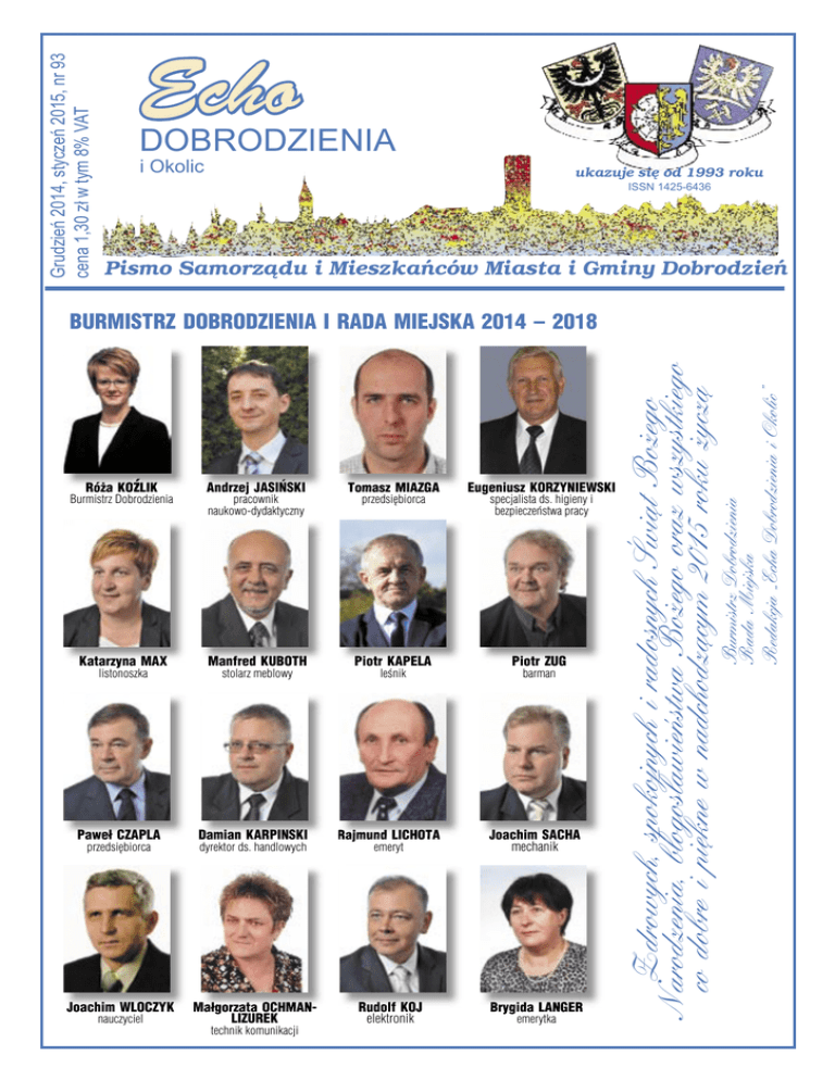 Grudzień 2014, styczeń 2015, nr 93 cena 1,30 zł w tym 8% VAT Echo DOBRODZIENIA i Okolic ukazuje siê od 1993 roku ISSN 1425-6436 Pismo Samorz¹du i Mieszkañców Miasta i Gminy Dobrodzieñ Andrzej JASIŃSKI Tomasz MIAZGA Eugeniusz KORZYNIEWSKI Katarzyna MAX Manfred KUBOTH Piotr KAPELA Piotr ZUG listonoszka pracownik naukowo-dydaktyczny stolarz meblowy przedsiêbiorca leœnik specjalista ds. higieny i bezpieczeñstwa pracy barman Pawe³ CZAPLA Damian KARPINSKI Rajmund LICHOTA Joachim SACHA mechanik Joachim WLOCZYK Ma³gorzata OCHMANLIZUREK Rudolf KOJ elektronik Brygida LANGER przedsiêbiorca nauczyciel dyrektor ds. handlowych technik komunikacji emeryt emerytka Burmistrz Dobrodzienia Rada Miejska Redakcja „Echa Dobrodzienia i Okolic” Ró¿a KOŸLIK Burmistrz Dobrodzienia Zdrowych, spokojnych i radosnych Œwi¹t Bo¿ego Narodzenia, b³ogos³awieñstwa Bo¿ego oraz wszystkiego co dobre i piêkne w nadchodz¹cym 2015 roku życzą BURMISTRZ DOBRODZIENIA I RADA MIEJSKA 2014 – 2018 Zmiana formularza de minimis Od 1 stycznia 2014r. do 31 grudnia 2020r. obowiązują nowe przepisy zawarte w Rozporządzeniu Komisji (UE) nr 1407/2013 z dnia 18 grudnia 2013 r. w sprawie stosowania art. 107 i 108 Traktatu o funkcjonowaniu Unii Europejskiej do pomocy de minimis (Dz. Urz. UE L 352 z 24.12.2013). Rozporządzenie to reguluje zasady przyznawania dofinansowania kosztów kształcenia młodocianych pracowników dla pracodawców, którzy zawarli z młodocianymi pracownikami umowę o pracę w celu przygotowania zawodowego. W celu dostosowania zakresu informacji, które wnioskodawcy powinni przekazać podmiotowi udzielającemu pomocy de minimis, od 15 listopada br. wprowadzono nowe wzory formularza informacji przedstawianych przy ubieganiu się o pomoc de minimis udzielaną na warunkach określonych w Rozporządzeniu Komisji (UE) o którym mowa wyżej. Oprócz nowego wzoru formularza, pracodawcy bez zmian dołączają do wniosku dokumenty potwierdzające uprawnienia jako instruktora praktycznej nauki zawodu, stosunek pracy z młodocianym pracownikiem, ukończenie przygotowania zawodowego przez młodocianego pracownika z wynikiem pozytywnym oraz dokumenty związane z pomocą publiczną. Więcej informacji na stronie www.dobrodzien.pl zakładka gospodarka/przedsiębiorstwa/pracownicy młodociani. H.K. Rozliczenie cegiełek Stowarzyszenie Rozwoju Wsi Kocury i Malichów ,,Brzozowa Dolina” dziękuje mieszkańcom Gminy Dobrodzień za zakup cegiełek przeznaczonych na wyposażenie nowo wybudowanej salki Centrum Aktywności Wiejskiej w Kocurach. Ze sprzedaży cegiełek uzyskaliśmy 1370 zł, z czego zakupiliśmy rolety do okien, wózek kelnerski, suszarkę do naczyń i drewniane deski do krojenia. Wszystkie pieniądze zostały odpowiednio rozdysponowane. 2 Echo DOBRODZIENIA i Okolic Wyłączamy telefony Co roku obchodzimy Święta Bożego Narodzenia i co roku nachodzą nas podobne refleksje. Jest coś tak silnego w wieczorze wigilijnym jak w miłości matki do dziecka. Nic tego nie zmieni, bo miłość matczyna jest niewytłumaczalna, a wieczór wigilijny jest tak magiczny, że nie warto dociekać dlaczego. Przecież nawet osoby nie wierzące w tym dniu zachowują się inaczej, łza nie raz zakręci im się w oku i w gardle coś ściska. Fajnie mieć wtedy przy sobie wszystkie swoje bliskie osoby. To chyba jedyny wieczór, gdy nam się nie spieszy, gdy chcemy pobyć z sobą dłużej pomimo różnicy zdań w życiu codziennym. Fajnie byłoby żeby wszystkie linie telefoniczne, facebooki, gadu-gadu i inne ustrojstwa XXI wieku zastrajkowały chociaż na te magiczne 2-3 godziny w roku. Fajnie byłoby rozmawiać z sobą nie odrywając się co chwilę na dźwięki połączeń. Super byłoby również wspólnie pośpiewać kolędy, pogadać z dziećmi, dla których zapracowani rodzice, ciocie czy dziadkowie nie zawsze mają czas. Przeżyjmy te święta jak najbardziej magicznie; rodzinnie i ciepło. Bądźmy razem przy choince i cieszmy się tymi chwilami, bo mamy ich w życiu zbyt mało. Życzę wszystkim miłości świątecznej, która będzie trwała 365 dni z możliwością przedłużenia na następny rok. Ewa Piasecka Szanowni Mieszkańcy miasta i gminy Dobrodzień Dziękuję Wam za udział w wyborach samorządowych, które odbyły się w dniu 16. listopada 2014 roku. Dziękuję tym wszystkim, którzy obdarzyli mnie kredytem zaufania i zdecydowali się poprzeć moją kandydaturę na burmistrza Dobrodzienia. To wyróżnienie to dla mnie wyraz społecznego zaufania, dlatego też z pełną odpowiedzialnością będą służyć Ziemi Dobrodzieńskiej. Pełniąc obowiązki burmistrza pozostaję do dyspozycji wszystkich mieszkańców, zawsze otwarta na współpracę i wszelkie sugestie dotyczące rozwoju naszej gminy. Róża Koźlik Podziękowanie Serdecznie dziękuję mieszkańcom Gminy Dobrodzień, którzy obdarzyli mnie swoim zaufaniem i oddali na mnie swój głos w wyborach samorządowych do Rady Powiatu Oleskiego w dniu 16 listopada 2014 roku. Postaram się z pokorą i godnie pracować i reprezentować interesy Gminy Dobrodzień i jej mieszkańców. Lidia Kontny Radna Rady Powiatu Oleskiego W ramach przeciwdziałania negatywnym skutkom zimy pracownicy so cjalni Miejsko-Gminnego Ośrodka Pomocy Społecznej w Dobrodzieniu monitorują sytuację osób starszych, samotnych, niepełnosprawnych, rodzin patologicznych na terenie naszej gminy w celu zabezpieczenia podstawowych potrzeb socjalno-bytowych w tych środowiskach. Działania pracowników pomocy społecznej obejmują między innymi odwiedziny ww. osób i rodzin, sprawdzenie sytuacji życiowej, ewentualnie udzie- Apel lenie tym osobom niezbędnej pomocy, zapewienie dodatkowych usług opiekuńczych, zwłaszcza osobom starszym i niepełnosprawnym. Wszystkie osoby, którym znana jest trudna sytuacja, przede wszystkim osób starszych i niepełnosprawnych nie posiadających rodziny, prosi się o kontakt telefoniczny 34-35-75-100 wew. 42, bądź osobisty w MGOPS – Dz