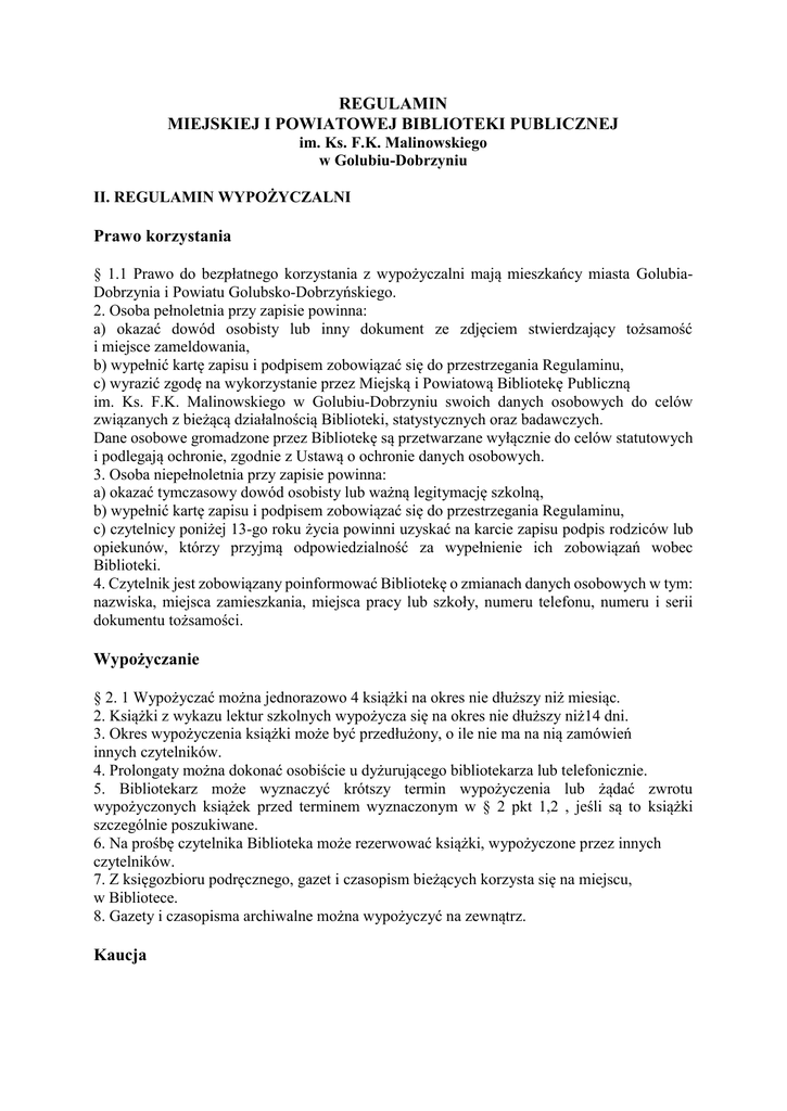 REGULAMIN MIEJSKIEJ I POWIATOWEJ BIBLIOTEKI PUBLICZNEJ im. Ks. F.K. Malinowskiego w Golubiu-Dobrzyniu II. REGULAMIN WYPOŻYCZALNI Prawo korzystania § 1.1 Prawo do bezpłatnego korzystania z wypożyczalni mają mieszkańcy miasta GolubiaDobrzynia i Powiatu Golubsko-Dobrzyńskiego. 2. Osoba pełnoletnia przy zapisie powinna: a) okazać dowód osobisty lub inny dokument ze zdjęciem stwierdzający tożsamość i miejsce zameldowania, b) wypełnić kartę zapisu i podpisem zobowiązać się do przestrzegania Regulaminu, c) wyrazić zgodę na wykorzystanie przez Miejską i Powiatową Bibliotekę Publiczną im. Ks. F.K. Malinowskiego w Golubiu-Dobrzyniu swoich danych osobowych do celów związanych z bieżącą działalnością Biblioteki, statystycznych oraz badawczych. Dane osobowe gromadzone przez Bibliotekę są przetwarzane wyłącznie do celów statutowych i podlegają ochronie, zgodnie z Ustawą o ochronie danych osobowych. 3. Osoba niepełnoletnia przy zapisie powinna: a) okazać tymczasowy dowód osobisty lub ważną legitymację szkolną, b) wypełnić kartę zapisu i podpisem zobowiązać się do przestrzegania Regulaminu, c) czytelnicy poniżej 13-go roku życia powinni uzyskać na karcie zapisu podpis rodziców lub opiekunów, którzy przyjmą odpowiedzialność za wypełnienie ich zobowiązań wobec Biblioteki. 4. Czytelnik jest zobowiązany poinformować Bibliotekę o zmianach danych osobowych w tym: nazwiska, miejsca zamieszkania, miejsca pracy lub szkoły, numeru telefonu, numeru i serii dokumentu tożsamości. Wypożyczanie § 2. 1 Wypożyczać można jednorazowo 4 książki na okres nie dłuższy niż miesiąc. 2. Książki z wykazu lektur szkolnych wypożycza się na okres nie dłuższy niż14 dni. 3. Okres wypożyczenia książki może być przedłużony, o ile nie ma na nią zamówień innych czytelników. 4. Prolongaty można dokonać osobiście u dyżurującego bibliotekarza lub telefonicznie. 5. Bibliotekarz może wyznaczyć krótszy termin wypożyczenia lub żądać zwrotu wypożyczonych książek przed terminem wyznaczonym w § 2 pkt 1,2 , jeśli są to książki szczególnie poszukiwane. 6. Na prośbę czytelnika Biblioteka może rezerwować książki, wypożyczone przez innych czytelników. 7. Z księgozbioru podręcznego, gazet i czasopism bieżących korzysta się na miejscu, w Bibliotece. 8. Gazety i czasopisma archiwalne można wypożyczyć na zewnątrz. Kaucja § 3.1 Od czytelników, którzy nie są stałymi mieszkańcami miasta Golubia-Dobrzynia i Powiatu Golubsko-Dobrzyńskiego pobiera się przy zapisie kaucję zwrotną w wysokości określonej przez bibliotekarza. 2. Po upływie roku od rezygnacji z usług wypożyczalni nie odebraną kaucję Biblioteka przeznacza na zakup książek. 3. Od osób korzystających z wartościowych książek pobiera się kaucję w wysokości określonej przez bibliotekarza. Przetrzymywanie książek § 4.1 Za przetrzymanie książek ponad określony termin Biblioteka może pobrać opłatę w wysokości 0,50 zł od jednej książki za każdy tydzień po terminie zwrotu. 2. Czytelnik, do którego Biblioteka wysłała upomnienie w sprawie zwrotu książek ponosi opłatę w wysokości: 2 złotych za pierwsze upomnienie, 4 złotych za drugie upomnienie, 6 złotych za każde następne upomnienie. 3. Wpłaty wynikające z niniejszego Regulaminu w stosunku do czytelników, którzy nie ukończyli 13 roku życia, wnoszone są przez ich rodziców lub opiekunów prawnych. 4. Jeżeli czytelnik, mimo wysłanych upomnień, odmawia zwrotu książek lub uiszczenia należnych opłat, Biblioteka dochodzi swych roszczeń zgodnie z przepisami prawa. Poszanowanie i zabezpieczenie książek § 5.1 Czytelnik ma obowiązek szanować wypożyczone książki, chronić je przed zagubieniem, zniszczeniem i uszkodzeniem. Czytelnik powinien zwrócić uwagę na stan książek przed wypożyczeniem a zauważone uszkodzenia zgłosić bibliotekarzowi, w przeciwnym razie przyjmuje się, że książka nie była uszkodzona przed wypożyczeniem 2. Czytelnik jest zobowiązany odkupić zagubioną, zniszczoną lub uszkodzoną książkę. Jeżeli czytelnik nie może uzyskać tytułu zagubionej książki – uzgadnia z bibliotekarzem dalszy tok postępowania. Za zagubiony, zniszczony lub uszkodzony tom dzieła wielotomowego pobiera się należność za całe dzieło, pozostałe tomy nadal stanowią własność Biblioteki. 3. Czytelnik może, za zgodą bibliotekarza, dostarczyć za zagubioną, zniszczoną lub uszkodzoną pozycję inną książkę, przydatną dla Biblioteki. 4. W przypadku czytelników niepełnoletnich, za zagubienie, zniszczenie lub uszkodzenie książki odpowiadają rodzice lub prawni opiekunowie. Informacje i porady § 6 Czytelnik ma prawo korzystania z usług informacyjnych i poradnictwa bibliotecznego, świadczonych przez pracowników Biblioteki. Życzenia i uwagi czytelników § 7 Wszelkie życzenia i uwagi czytelnicy mogą zgłaszać bezpośrednio u bibliotekarza lub dyrektora Biblioteki. Przepisy końcowe § 8.1 Czytelnik nie stosujący się do przepisów Regulaminu Wypożyczalni może być tymczasowo, a w szczególnych wypadkach na stałe, pozbawiony prawa korzystania z Wypożyczalni. Od takiej decyzji czytelnikowi przysługuje prawo odwołania się do dyrektora Biblioteki. 2. W sprawach nie objętych Regulaminem prawo decyzji przysługuje dyrektorowi Biblioteki Golub-Dobrzyń, dnia 20 czerwca 2014 r.