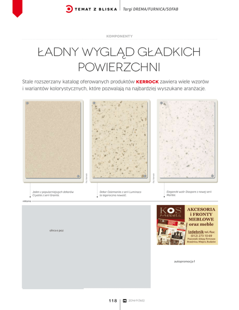 t e m at z b l i s k a Targi DREMA/FURNICA/SOFAB komponenty Ładny wygląd gładkich powierzchni Jeden z popularniejszych dekorów Cryolite z serii Granite. Fot. Kerrock Fot. Kerrock Stale rozszerzany katalog oferowanych produktów Kerrock zawiera wiele wzorów i wariantów kolorystycznych, które pozwalają na najbardziej wyszukane aranżacje. Dekor Colemanite z serii Luminaco to tegoroczna nowość. Elegancki wzór Diaspore z nowej serii Marble. reklama ohra e poz autopromocja f 118 2014/9 (165) Targi DREMA/FURNICA/SOFAB Fot. Kerrock reklama t e m at z b l i s k a Seria Uni wzbogaci się o nowe kolory, jak Summer green. S łoweński producent materiału Kerrock już niebawem wzbogaci swoją ofertę o nowe kolory i dekory, a także zupełnie nowe serie. W sumie będzie to 27 wzorów. Wśród nich znajdą się m.in. kolory lumino (półprzezroczyste), uni (jednobarwne) oraz warianty z nowych serii Marble i Luminaco. Z wszystkimi nowościami będzie można zapoznać się na poznańskich targach Furnica. Ponadto na stoisku targowym będą zaprezentowane nowe umywalki prostokątne, które znajdują się w ofercie od tego roku. Są to cztery modele: Brina, Cheri, Lora, Keli – oferowane w bogatej gamie kolorystycznej, we wszystkich wariantach jednobarwnych z serii UNI (34 kolory). Kerrock to nowoczesny materiał mineralno-akrylowy, który powstaje z połączenia wodorotlenku glinu i polimeru żywicy akrylowej. Wodorotlenek glinu (ATH, trójwodzian aluminium) otrzymywany jest z boksytu (skała osadowa). Natomiast żywica akrylowa (PMMA) to syntetyczny polimer metakrylanu metylu. Kerrock posiada wiele zalet, które sprawiają, iż jest on coraz chętniej wybieranym materiałem przy wszelkich projektach wnętrz. Po pierwsze, jest odporny na środki chemiczne, a jego powierzchnia jest zabezpieczona przed uszkodzeniami mechanicznymi, długo zachowując ładny wygląd gładkich powierzchni. Plamy po różnego rodzaju produktach żywnościowych i chemicznych nie mogą go uszkodzić. Co ważne, materiał spełnia wymogi stawiane przez Unię Europejską w zakresie bezpieczeństwa i higieny. Dystrybutor Kerrock w Polsce – firma Kerox z Warszawy oraz producent posiadają certyfikaty i atesty między innymi Państwowego Zakładu Higieny i Instytutu Techniki Budowlanej oraz wielu renomowanych europejskich instytutów badawczych. Zaletą przedmiotów wykonanych z tego materiału jest trwałość. Kerrock jest masywny i jednorodny, co daje mu doskonałą twardość i elastyczność. Dodatkowo nieporowata struktura gwarantuje odporność na wodę i wilgoć. Materiał jest również przyjazny środowisku. Można go poddać recyklingowi i ponownie zastosować z zachowaniem wszystkich właściwości. Kerrock można obrabiać tak samo jak drewno. Zastosować można prawie wszystkie technologie obróbki drewna: piłowanie, wiercenie, frezowanie, szlifowanie, skrawanie, polerowanie, heblowanie, klejenie i kształtowanie termiczne. Wykonanie krawędzi i listew wykończeniowych może być bardzo różne, od okrągłych, równych i zaokrąglonych aż do stylizowanych kształtów. • — gac 119 2014/9 (165)