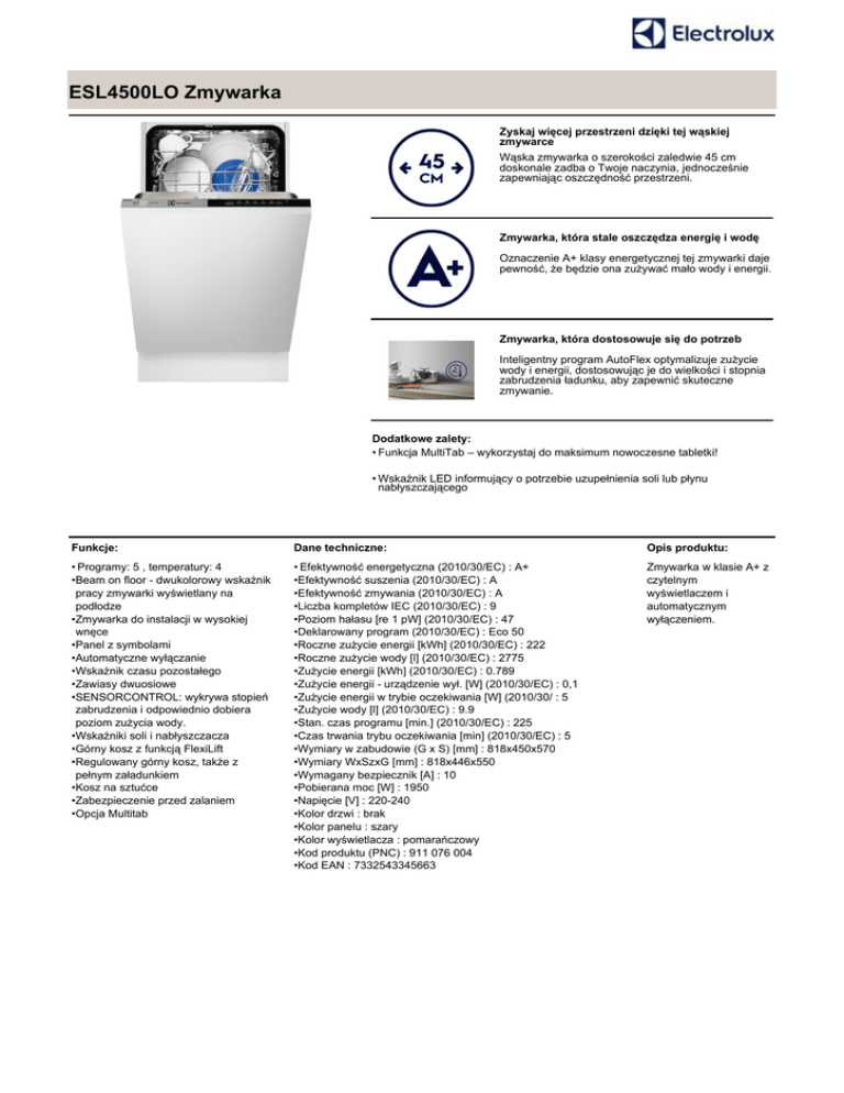 ESL4500LO Zmywarka Zyskaj więcej przestrzeni dzięki tej wąskiej zmywarce Wąska zmywarka o szerokości zaledwie 45 cm doskonale zadba o Twoje naczynia, jednocześnie zapewniając oszczędność przestrzeni. Zmywarka, która stale oszczędza energię i wodę Oznaczenie A+ klasy energetycznej tej zmywarki daje pewność, że będzie ona zużywać mało wody i energii. Zmywarka, która dostosowuje się do potrzeb Inteligentny program AutoFlex optymalizuje zużycie wody i energii, dostosowując je do wielkości i stopnia zabrudzenia ładunku, aby zapewnić skuteczne zmywanie. Dodatkowe zalety: • Funkcja MultiTab – wykorzystaj do maksimum nowoczesne tabletki! • Wskaźnik LED informujący o potrzebie uzupełnienia soli lub płynu nabłyszczającego Funkcje: Dane techniczne: Opis produktu: • Programy: 5 , temperatury: 4 •Beam on floor - dwukolorowy wskaźnik pracy zmywarki wyświetlany na podłodze •Zmywarka do instalacji w wysokiej wnęce •Panel z symbolami •Automatyczne wyłączanie •Wskaźnik czasu pozostałego •Zawiasy dwuosiowe •SENSORCONTROL: wykrywa stopień zabrudzenia i odpowiednio dobiera poziom zużycia wody. •Wskaźniki soli i nabłyszczacza •Górny kosz z funkcją FlexiLift •Regulowany górny kosz, także z pełnym załadunkiem •Kosz na sztućce •Zabezpieczenie przed zalaniem •Opcja Multitab • Efektywność energetyczna (2010/30/EC) : A+ •Efektywność suszenia (2010/30/EC) : A •Efektywność zmywania (2010/30/EC) : A •Liczba kompletów IEC (2010/30/EC) : 9 •Poziom hałasu [re 1 pW] (2010/30/EC) : 47 •Deklarowany program (2010/30/EC) : Eco 50 •Roczne zużycie energii [kWh] (2010/30/EC) : 222 •Roczne zużycie wody [l] (2010/30/EC) : 2775 •Zużycie energii [kWh] (2010/30/EC) : 0.789 •Zużycie energii - urządzenie wył. [W] (2010/30/EC) : 0,1 •Zużycie energii w trybie oczekiwania [W] (2010/30/ : 5 •Zużycie wody [l] (2010/30/EC) : 9.9 •Stan. czas programu [min.] (2010/30/EC) : 225 •Czas trwania trybu oczekiwania [min] (2010/30/EC) : 5 •Wymiary w zabudowie (G x S) [mm] : 818x450x570 •Wymiary WxSzxG [mm] : 818x446x550 •Wymagany bezpiecznik [A] : 10 •Pobierana moc [W] : 1950 •Napięcie [V] : 220-240 •Kolor drzwi : brak •Kolor panelu : szary •Kolor wyświetlacza : pomarańczowy •Kod produktu (PNC) : 911 076 004 •Kod EAN : 7332543345663 Zmywarka w klasie A+ z czytelnym wyświetlaczem i automatycznym wyłączeniem. ESL4500LO Zmywarka