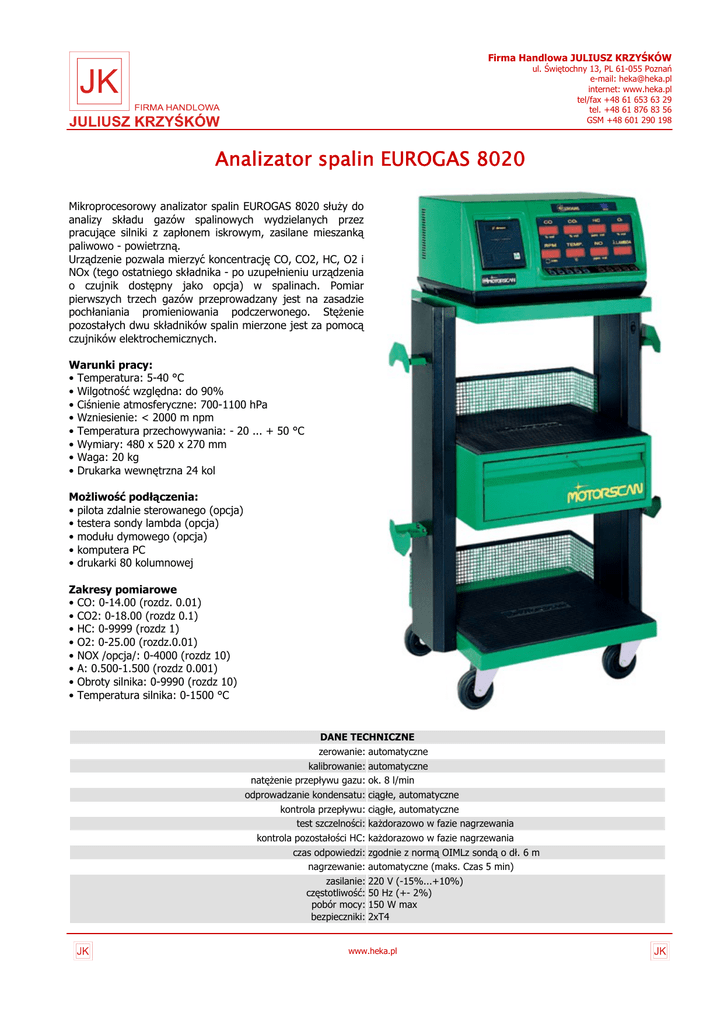 Firma Handlowa JULIUSZ KRZYŚKÓW ul. Świętochny 13, PL 61-055 Poznań e-mail: [email protected] internet: www.heka.pl tel/fax +48 61 653 63 29 tel. +48 61 876 83 56 GSM +48 601 290 198 Analizator spalin EUROGAS 8020 Mikroprocesorowy analizator spalin EUROGAS 8020 służy do analizy składu gazów spalinowych wydzielanych przez pracujące silniki z zapłonem iskrowym, zasilane mieszanką paliwowo - powietrzną. Urządzenie pozwala mierzyć koncentrację CO, CO2, HC, O2 i NOx (tego ostatniego składnika - po uzupełnieniu urządzenia o czujnik dostępny jako opcja) w spalinach. Pomiar pierwszych trzech gazów przeprowadzany jest na zasadzie pochłaniania promieniowania podczerwonego. Stężenie pozostałych dwu składników spalin mierzone jest za pomocą czujników elektrochemicznych. Warunki pracy: • Temperatura: 5-40 °C • Wilgotność względna: do 90% • Ciśnienie atmosferyczne: 700-1100 hPa • Wzniesienie: < 2000 m npm • Temperatura przechowywania: - 20 ... + 50 °C • Wymiary: 480 x 520 x 270 mm • Waga: 20 kg • Drukarka wewnętrzna 24 kol Możliwość podłączenia: • pilota zdalnie sterowanego (opcja) • testera sondy lambda (opcja) • modułu dymowego (opcja) • komputera PC • drukarki 80 kolumnowej Zakresy pomiarowe • CO: 0-14.00 (rozdz. 0.01) • CO2: 0-18.00 (rozdz 0.1) • HC: 0-9999 (rozdz 1) • O2: 0-25.00 (rozdz.0.01) • NOX /opcja/: 0-4000 (rozdz 10) • A: 0.500-1.500 (rozdz 0.001) • Obroty silnika: 0-9990 (rozdz 10) • Temperatura silnika: 0-1500 °C DANE TECHNICZNE zerowanie: automatyczne kalibrowanie: automatyczne natężenie przepływu gazu: ok. 8 l/min odprowadzanie kondensatu: ciągłe, automatyczne kontrola przepływu: ciągłe, automatyczne test szczelności: każdorazowo w fazie nagrzewania kontrola pozostałości HC: każdorazowo w fazie nagrzewania czas odpowiedzi: zgodnie z normą OIMLz sondą o dł. 6 m nagrzewanie: automatyczne (maks. Czas 5 min) zasilanie: 220 V (-15%...+10%) częstotliwość: 50 Hz (+- 2%) pobór mocy: 150 W max bezpieczniki: 2xT4 www.heka.pl