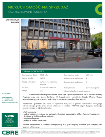 NIERUCHOMOŚĆ NA SPRZEDAŻ ŁÓDŹ, PLAC KOMUNY PARYSKIEJ 5A WSPÓŁUDZIAŁ W BUDYNKU OPIS NIERUCHOMOŚCI KONTAKT: Paweł Meszyński T: +48 22 544 8098 M: +48 608 667 207 [email protected] Powierzchnia działki: 2828 m kw Powierzchnia lokali: 554 m kw Numer działki: 243/1 Kondygnacje nadziemne: 9 Rodzaj własności: użytkowanie wieczyste/ własność Kondygnacje podziemne: 1 Nr. KW: LD1M/00028640/4 Funkcja lokali: biurowo-usługowa MPZP: brak Obecnie lokale nie są użytkowane Przestronne lokale usługowo-biurowe znajdujące się w ścisłym centrum Łodzi, na Placu Komuny Paryskiej, przy Alei Leona Schillera. W bezpośrednim sąsiedztwie Urzędu Miasta, Urzędu Marszałkowskiego oraz bardzo blisko ulicy Piotrkowskiej, centralnej ulicy w Łodzi. Przedmiotem sprzedaży jest udział w wysokości 100/756 w prawie użytkowania wieczystego zabudowanego gruntu oraz prawo własności w udziale 100/756 części budynku biurowego posadowionego na tej nieruchomości. Lokale posiadają: - osobne wejścia: do jednego (na parterze) wchodzi się bezpośrednio z Placu Komuny Paryskiej, do drugiego - z klatki schodowej budynku; - instalacje alarmową; - parking w bliskim sąsiedztwie. Budynek zaopatrzony w instalacje energetyczną, c.o. (sieć miejska), wod-kan (sieć miejska) oraz łączność telefoniczną. DISCLAIMER © Copyright 2014 CBRE. Information herein has been obtained from sources believed to be reliable. While we do not doubt its accuracy, we have not verified it and make no guarantee, warranty or representation about it. It is your responsibility to independently confirm its accuracy and completeness. Any projections, opinions, assumptions or estimates used are for example only and do not represent the current or future performance of the market. This information is designed exclusively for use by CBRE clients, and cannot be reproduced without prior written permission of CBRE. NIERUCHOMOŚĆ NA SPRZEDAŻ ŁÓDŹ, PLAC KOMUNY PARYSKIEJ 5A WSPÓŁUDZIAŁ W BUDYNKU LOKALIZACJA Nieruchomość położona w samym centrum Łodzi, pomiędzy ulicami Piotrkowską i Sienkiewicza. W sąsiedztwie znajdują się Urząd Miasta, Urząd Marszałkowski, Urząd Wojewódzki, park, restauracje, kawiarnie, banki, instytucje finansowe oraz ubezpieczeniowe, fitness club. Nieruchomość jest bardzo dobrze skomunikowana (6 linii autobusowych oraz 6 linii tramwajowych). PRZEZNACZENIE KONTAKT: Paweł Meszyński T: +48 22 544 8098 M: +48 608 667 207 [email protected] Przedmiotowa nieruchomość nie jest objeta miejscowym planem zagospodarowania przestrzennego. Zgodnie ze Studium uwarunkowań i kierunków zagospodarowania przestrzennego Miasta Łodzi budynek położony jest na terenie oznaczonym symbolem UC1 – tereny obszaru funkcjonalnego ulicy Piotrkowskiej. STAN PRAWNY Dla działki nr 243/1 i posadowionego na niej budynku prowadzona jest Księga Wieczysta nr LD1M/00028640/4. Właścicielem nieruchomości jest Gmina Łódź, a współużytkownikiem wieczystym i współwłaścicielem budynku posadowionego na tym gruncie w wysokości 100/756 części jest Bank Millennium S.A. (następca prawny BIG Banku S.A.). DISCLAIMER © Copyright 2014 CBRE. Information herein has been obtained from sources believed to be reliable. While we do not doubt its accuracy, we have not verified it and make no guarantee, warranty or representation about it. It is your responsibility to independently confirm its accuracy and completeness. Any projections, opinions, assumptions or estimates used are for example only and do not represent the current or future performance of the market. This information is designed exclusively for use by CBRE clients, and cannot be reproduced without prior written permission of CBRE. NIERUCHOMOŚĆ NA SPRZEDAŻ ŁÓDŹ, PLAC KOMUNY PARYSKIEJ 5A WSPÓŁUDZIAŁ W BUDYNKU PRZYKŁADOWE ZDJĘCIA KONTAKT: Paweł Meszyński T: +48 22 544 8098 M: +48 608 667 207 [email protected] DISCLAIMER © Copyright 2014 CBRE. Information herein has been obtained from sources believed to be reliable. While we do not doubt its accuracy, we have not verified it and make no guarantee, warranty or representation about it. It is your responsibility to independently confirm its accuracy and completeness. Any projections, opinions, assumptions or estimates used are for example only and do not represent the current or future performance of the market. This information is designed exclusively for use by CBRE clients, and cannot be reproduced without prior written permission of CBRE.