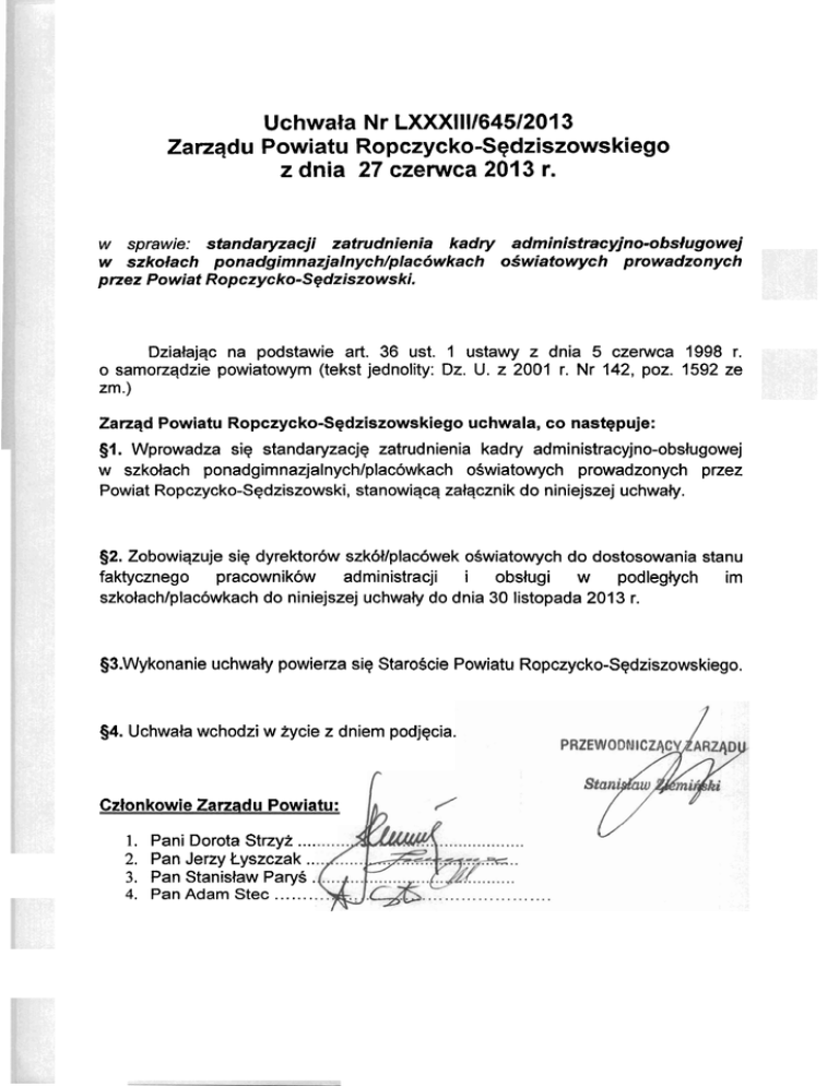 Uchwata Nr LXXX111/645/2013 Zarzqdu Powiatu Ropczycko-S~dziszowskiego z dnia 27 czerwca 2013 r. w sprawie: standaryzacji zatrudnienia kadry administracyjno-obsfugowej w szkofach ponadgimnazjalnych/plac6wkach oswiatowych prowadzonych p n e z Powiat Ropczycko-Sqdziszowski. Dzialajqc na podstawie art. 36 ust. 1 ustawy z dnia 5 czewca 1998 r. o samorzqdzie powiatowym (tekst jednolity: Dz. U. z 2001 r. Nr 142, poz. 1592 ze zm .) Zarzqd Powiatu Ropczycko-Sqdziszowskiego uchwala, co nastepuje: 91. Wprowadza siq standaryzacje zatrudnienia kadry administracyjno-obslugowej w szkolach ponadgimnazjalnychlplacbwkach oSwiatowych prowadzonych przez Powiat Ropczycko-Sqdziszowski, stanowiqcq zalqcznik do niniejszej uchwaly. 92. Zobowiqzuje siq dyrektorow szkbVplac6wek oswiatowych do dostosowania stanu podleglych im faktycznego pracownikow administracji i obslugi w szkolach/plac6wkach do niniejszej uchwaly do dnia 30 listopada 2013 r. 93.Wykonanie uchwaly powierza siq Staroscie Powiatu Ropczycko-Sedziszowskiego. 94. Uchwala wchodzi w zycie z dniem podjqcia. Czlonkowie Zarzsdu Powiatu: 1. Pani Dorota Strzyz .... 2. Pan Jerzy tyszczak .. 3. Pan Stanislaw Parys . 4. Pan Adam Stec ... ... . Zalqunik do Uchwaly Nr U<XX111/645/2013Zarzqdu Powiatu Ropczycko-Sedziszowskiego z dnia 27 czerwca 2013 r. STANDARYZACJA ZATRUDNIENIA KADRY ADMINISTRACYJNO-OBSLUGOWEJ W SZKOLACHIPLACOWKACH PONADGIMNAZJALNYCH PROWADZONYCH PRZEZ POWlAT ROPCZYCKO-SFDZISZOWSKI Zatrudnienie pracownikow administracji i obslugi przewidziane jest na stanowiskach wymienionych w Rozporzqdzeniu Rady Ministrow z dnia 18 marca 2009 r. w sprawie wynagradzania pracownikow samorzqdowych (Dz. U. z 2009 r.Nr 50 poz. 398 ze zm.) ograniczone do niiej wskazanych stanowisk oraz na obligatoryjnych stanowiskach wynikajqcych z odrqbnych przepisow. Standaryzacja stanowi procedurq ujednolicania stanowisk kadry administracyjno-obslugowej oraz powiqzania ilosci etatow w zaleinosci od ilosci uczniowlwychowankow i oddzialow w szkole. W przypadku koniecznosci zatrudnienia pracownika na stanowisku nie wymienionym w standaryzacji, zwiqkszenia etatow ponad standard lub zatrudnienia nowych pracownikow niezbqdne jest uzyskanie zgody Zarzqdu Powiatu Ropczycko-Sqdziszowskiego. Liczbq etatow pracownikow administracji i obslugi ustala siq zgodnie z ponizszymi kryteriami: Dopuszcza siq zatrudnienie na nastqpujqcych stanowiskach administracyjnych: -glowna ksiqgowa; -referent, starszy referent, samodzielny referent, specjalista ds. ksiqgowych, -referent, starszy referent, samodzielny referent, specjalista ds. kadrowych, -sekretarka, sekretarz; -referent, starszy referent, samodzielny referent, specjalista ds. administracyjnych, -kierownik gospodarczy. Dopuszcza siq zatrudnienie na nastqpujqcych stanowiskach obslugi: -sprzqtaczka, -robotnik gospodarczy, -konsewator, - kierowca - etat (wymiar etatu) kierowcy uzaleznia siq od indywidualnej decyzji dyrektora szkoly, opartej na mozliwosciach budzetowych uzasadnionych potrzebq posiadania Srodka transportu, - pomoc nauczyciela. PRACOWNICY ADMINISTRACJI - iloSci etatow przypadajqce uczniow/wychowankow/uczniow odbywajqcych praktycznq naukq zawodu: na liczbq Do 300 uczniow/wychowankow- Iqcznie 1,5 etatu: - 0,5 etatu - sekretarka, sekretarz, referent, starszy referent, samodzielny referent ds. administracyjnych; -0,5etatu - gIbwna ksiqgowa, referent, starszy referent, samodzielny referent, specjalista ds. ksiqgowych, -0,5 etatu ds. kadrowych. - referent, starszy referent, samodzielny referent, specjalista Od 301 -600 uczni6w/wychowank6w- Iqcznie 3,O etaty - 1 etat - sekretarka, sekretarz, referent, starszy referent, samodzielny referent ds. administracyjnych; - 1 etat - glowna ksiqgowa, referent, starszy referent, samodzielny referent, specjalista ds. ksiqgowych, - 1 etat - referent, starszy referent, samodzielny referent, specjalista ds. kadrowych. Od 601 - 900 uczniow/wychowankow- lqcznie 5,5 etatu 1,5 etatu - sekretarka, sekretarz, referent, starszy referent, samodzielny referent ds. administracyjnych; - 1,5 etatu - gC6wna ksiqgowa, referent, starszy referent, samodzielny referent, specjalista ds. ksiqgowych, 1,5 etatu - - referent, starszy referent, samodzielny referent, specjalista ds. kadrowych - 1 etat - kierownik gospodarczy. Od 901 - 1200 uczniow/wychowank6w - Iqcznie 7 etatow .- 2 etaty - sekretarka, sekretarz, referent, starszy referent, samodzielny referent ds. administracyjnych; - 2 etaty - glowna ksiqgowa, referent, starszy referent, samodzielny referent, specjalista ds. ksiqgowych, - 2 etaty - - referent, starszy referent, samodzielny referent, specjalista ds. kadrowych, - 1 etat - kierownik gospodarczy. Powyzej 1200 uczni6w/wychowankbw - zwiqksza siq zatrudnienie o 0,25 etatu na kaidym stanowisku (oprocz kierownika gospodarczego) w momencie zwiqkszenia liczby uczniow/wychowankow o 150. PRACOWNICY OBSlUGl w szkole/placowce - iloSci etatow przypadajqce na iloSC oddzialbw Sprzqtaczka - 1 etat na kazde 700-1000 metrow kwadratowych powierzchni uiytkowej, Konsewator - 0,5 etatu na kazde 12 oddzial6w; zwieksza sie zatrudnienie o 0,25 etatu w momencie zwiekszenia liczby oddzialow o 6; Robotnik gospodarczy -0,5 etatu na kazde 12 oddzialow; zwieksza sie zatrudnienie o 0,25 etatu w momencie zwiekszenia liczby oddzialow o 6; Kierowca - w zaleinosci od potrzeb i specyfiki szkoly/placowki, Dozorcalportier - w zaleznosci od potrzeb i specyfiki szkoly/placowki, Pomoc nauczyciela - w zaleinosci od potrzeb i specyfiki szkoly/plac6wkil Dodatkowo, w zaleinosci od specyfiki szkolylplacowki dopuszcza sie stworzenie obligatoryjnego stanowiska pracy nie wymienionego w standaryzacji, wynikajqcego z odrqbnych przepisow. Obsluga zywieniowa szkolylplac6wki przewidywana i ustalana jest przez dyrektora danej szkolylplacowki w uzgodnieniu z Zarzqdem Powiatu.