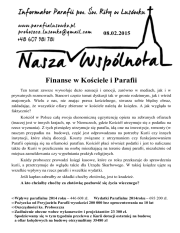 08.02.2015 Finanse w Kościele i Parafii Ten temat zawsze wywołuje dużo sensacji i emocji, zarówno w mediach, jak i w prywatnych rozmowach. Stanowi często temat dyskusji tak w gronie rodzinnym, jak i wśród znajomych. Wielu z nas, nie znając prawa kościelnego, stwarza sobie błędny obraz, zakładając, że wszystkie ofiary zbierane w kościele należą do księdza. A jak wygląda to faktycznie? Kościół w Polsce całą swoja ekonomiczną egzystencję opiera na zebranych ofiarach (inaczej jest w innych krajach, np. w Niemczech, gdzie Kościół utrzymuje się z podatku na rzecz wyznania). Z tych pieniędzy utrzymuje się parafia, idą one na inwestycje, remonty (w naszym przypadku na budowę), część jest odprowadzana na potrzeby Kurii czy innych instytucji, które służą diecezji. Koszty związane z utrzymaniem czy funkcjonowaniem Parafii opierają się na ofiarności parafian. Kościół płaci również podatki i jest to naliczane także do Kurii w przeliczeniu na osobę mieszkającą na terenie danej parafii, niezależnie od miejsca zameldowania czy wypełniania praktyk religijnych. Każdy proboszcz prowadzi księgi kasowe, które co roku przekazuje do sprawdzenia kurii, a przetrzymuje do wglądu także dla Urzędu Skarbowego. W takiej księdze ujęte są wszelkie wpływy na rzecz parafii i wszelkie wydatki. Jeśli kapłan zabrałby ze składki choćby złotówkę, jest to kradzież. A kto chciałby choćby za złotówkę pozbawić się życia wiecznego? • Wpływy parafialne 2014 roku – 446 608 zł. Wydatki Parafialne 2014roku – 693 200 zł. • Pożyczka od Przyjaciela Parafii wysokości 200 000 bez oprocentowania na 10 lat • Oszczędności ks. Proboszcza • Zadłużenie obecne wobec wykonawców i projektantów 23 300 zł. Spodziewamy się w tym tygodniu przelewu z Kurii dotacji ostatniej na budowę a ofiar kolędowych na budowę otrzymaliśmy 35480 zł Dekret o uposażeniu proboszcza i wikariusza w Archidiecezji Poznańskiej „Zasady ogólne Kodeks Prawa Kanonicznego postanawia, że duchowni, z racji wypełniania kościelnej posługi, mają prawo do wynagrodzenia przeznaczonego na ich utrzymanie (KPK 281). Jednocześnie dokumenty kościelne wskazują, że sytuacja materialna kapłanów nie powinna odbiegać od średniego poziomu życia wiernych. „Byłoby prawdziwym dramatem, gdyby sytuacja bytowa księży, wolność od wielu codziennych udręk, z którymi muszą borykać się często świeccy, stworzyły pomiędzy duchowieństwem i wiernymi jakąś obcość. Jesteście z ludu i dla ludu. Pamiętajcie, że występujecie w imieniu Kościoła, który dziś w szczególny sposób wyraża swą opcję preferencyjną na rzecz ubogich” (Jan Paweł II, Tarnów, 10 czerwca 1987 r.). W ostatnich czasach sytuacja księży w Polsce zmieniła się. Po długich staraniach przywrócono im prawo do ubezpieczenia społecznego. Księża wrócili też do pracy w szkołach, za którą otrzymują wynagrodzenie. Nie istnieje natomiast beneficjum proboszczowskie w dawnym tego słowa znaczeniu. Do Arcybiskupa Poznańskiego należy – po wysłuchaniu zdania Rady Kapłańskiej – wydanie odpowiednich przepisów dotyczących przeznaczenia składanych ofiar oraz wynagrodzenia kapłanów wypełniających te zadania (por. KPK, kan. 531 i 551). Mając powyższe na uwadze – niniejszym dekretem – określam zasady uposażenia księży proboszczów i księży wikariuszy w Archidiecezji Poznańskiej.” (Statuty Archidiecezjalne) Uposażenie proboszcza ( www.archpoznan.pl/pdf/synod/t208.pdf ) A. W parafiach, w których pracuje jeden kapłan - Proboszcz Przychody: Na przychody proboszcza składają się: 1.stypendia mszalne (ofiary składane z tytułu odprawionej Mszy Świętej) 2.ofiary składane przez wiernych z okazji posług obrzędowych (jeżeli osoba składająca ofiarę nie określi wyraźnie inaczej, do kasy intencji mszalnych należy przekazać stypendium w wysokości średniego w parafii), 3.część ofiar z kolędy: w parafiach ponad 1500 mieszkańców – 1/2 zebranych przez siebie ofiar, 4.ofiary zebrane z tytułu „zaduszek” i wymienianek rocznych 1/3, 5.wynagrodzenie z tytułu innych posług (np. pracy w szkole), 6.zwolnienie z opłaty za mieszkanie na probostwie, 7.dopłata części kosztów bieżącej eksploatacji mieszkania; za ogrzewanie, oświetlenie i wodę (pokrywana przez parafię), 8.opłata kosztów bieżących remontów mieszkania (pokrywana przez parafię), 9.zwrot kosztów wyjazdów służbowych (pokrywany przez parafię), 10. zwrot kosztów przeprowadzki (pokrywany przez parafię, do której jest skierowany). Rozchody Z osobistych dochodów proboszcz opłaca: 1.udział w kosztach utrzymania (w wysokości połowy najniższej krajowej pensji netto), 2.opłaty za prywatne rozmowy telefoniczne, 3.podatki dochodowe odprowadzane do Urzędu Skarbowego, 4.składki ubezpieczenia społecznego i zdrowotnego (ZUS), 5.świadczenia na rzecz Braterskiej Opieki Kapłańskiej, 6.świadczenia na rzecz Wzajemnej Pomocy Kapłańskiej. W roku 2014 jako Proboszcz nie skorzystałem z uposażenia (utrzymania) przez parafię mojej osoby. Poniosłem natomiast wszystkie koszty związane z moim utrzymaniem i przeznaczyłem swoje prywatne środki i czas na tworzenie i pomnażanie Dzieła Parafialnego. Każdy proboszcz traktowany jest jako pracodawca przez Państwo w kwestii ubezpieczenia i podatków. Nie ma żadnej pensji z kurii czy z państwa za to, że ktoś jest kapłanem czy proboszczem. Jakie by były przychody proboszczowskie (uposażenie) w roku 2014. Stypendia Mszalne – 7380 zł; Iura Stole – 450 zł; Ofiary z Kolędy1/2 – 16910; Zaduszki 230 zł; Razem 24970 zł brutto rocznie ( miesięcznie 24970: 12 miesięcy = 2081 zł brutto). Jeśli odliczymy podatek i ubezpieczenie to można obliczyć ile pozostaje. Wpływy parafialne (dotacja kurialna i Lusowa, składka niedzielna, zbiórka w Buku i Lusowie; kolęda2013/14, danina diecezjalna, wpłaty na konto i uposażenie prob
