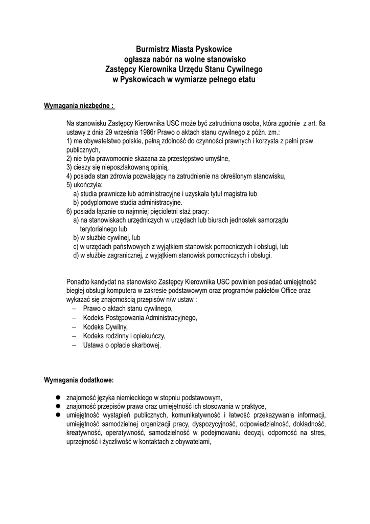 Burmistrz Miasta Pyskowice ogłasza nabór na wolne stanowisko Zastępcy Kierownika Urzędu Stanu Cywilnego w Pyskowicach w wymiarze pełnego etatu Wymagania niezbędne : Na stanowisku Zastępcy Kierownika USC może być zatrudniona osoba, która zgodnie z art. 6a ustawy z dnia 29 września 1986r Prawo o aktach stanu cywilnego z późn. zm.: 1) ma obywatelstwo polskie, pełną zdolność do czynności prawnych i korzysta z pełni praw publicznych, 2) nie była prawomocnie skazana za przestępstwo umyślne, 3) cieszy się nieposzlakowaną opinią, 4) posiada stan zdrowia pozwalający na zatrudnienie na określonym stanowisku, 5) ukończyła: a) studia prawnicze lub administracyjne i uzyskała tytuł magistra lub b) podyplomowe studia administracyjne. 6) posiada łącznie co najmniej pięcioletni staż pracy: a) na stanowiskach urzędniczych w urzędach lub biurach jednostek samorządu terytorialnego lub b) w służbie cywilnej, lub c) w urzędach państwowych z wyjątkiem stanowisk pomocniczych i obsługi, lub d) w służbie zagranicznej, z wyjątkiem stanowisk pomocniczych i obsługi. Ponadto kandydat na stanowisko Zastępcy Kierownika USC powinien posiadać umiejętność biegłej obsługi komputera w zakresie podstawowym oraz programów pakietów Office oraz wykazać się znajomością przepisów n/w ustaw : − Prawo o aktach stanu cywilnego, − Kodeks Postępowania Administracyjnego, − Kodeks Cywilny, − Kodeks rodzinny i opiekuńczy, − Ustawa o opłacie skarbowej. Wymagania dodatkowe: znajomość języka niemieckiego w stopniu podstawowym, znajomość przepisów prawa oraz umiejętność ich stosowania w praktyce, umiejętność wystąpień publicznych, komunikatywność i łatwość przekazywania informacji, umiejętność samodzielnej organizacji pracy, dyspozycyjność, odpowiedzialność, dokładność, kreatywność, operatywność, samodzielność w podejmowaniu decyzji, odporność na stres, uprzejmość i życzliwość w kontaktach z obywatelami, Do głównych obowiązków na tym stanowisku będzie należało : Zadania podstawowe: a) rejestracja urodzeń, małżeństw, zgonów, prowadzenie ksiąg stanu cywilnego i archiwum z zakresu USC, b) wydawanie odpisów z akt stanu cywilnego, c) wydawanie decyzji z zakresu prawa o aktach stanu cywilnego, d) przyjmowanie oświadczeń o braku przeszkód do zawarcia małżeństwa, o uznaniu dziecka, o nadaniu dziecku nazwiska męża matki, o zmianie imienia dziecka, o powrocie do nazwiska noszonego przed zawarciem małżeństwa, o wstąpieniu w związek małżeński, e) wydawanie zaświadczeń i postanowień w zakresie należącym do USC, f) dokonywanie wpisów do ksiąg stanu cywilnego w oparciu o zgłoszenie innych USC, decyzje administracyjne, orzeczenia sądowe, g) przygotowywanie projektów decyzji z zakresu ustawy o zmianie imion i nazwisk, h) sporządzanie sprawozdawczości statystycznej GUS dotyczącej urodzeń, małżeństw i zgonów. Zadania okresowe: praca w soboty w zależności od ilości ślubów. Wymagane dokumenty : życiorys zawodowy C.V. list motywacyjny ze wskazaniem stanowiska , kwestionariusz osobowy dla osoby ubiegającej się o zatrudnienie, (wzór kwestionariusza zgodnie z załącznikiem nr. 1 do Rozporządzenia Ministra Pracy i Polityki Społecznej z dnia 22.06.2006r. – Dz.U. z 2006r. Nr 125 , poz. 869) kserokopie dokumentów potwierdzających wykształcenie , kserokopie dokumentów potwierdzających posiadanie stażu pracy, oświadczenie, że kandydat nie był prawomocnie skazany za przestępstwo umyślne ( w przypadku zatrudnienia , kandydat przedkłada zaświadczenie o niekaralności z Krajowego Rejestru Karnego ) oświadczenie o posiadaniu pełnej zdolności do czynności prawnych oraz o korzystaniu z pełni praw publicznych, zgoda na przetwarzanie danych osobowych kandydata zawartych w ofercie pracy dla potrzeb niezbędnych do realizacji procesu rekrutacji - zgodnie z ustawą z dnia 29 sierpnia 1997r. o ochronie danych osobowych (Dz. U. z 2002r. Nr 101 , poz. 926 z późn. zm.) oraz ustawą z dnia 21 listopada 2008r. o pracownikach samorządowych (Dz. U. z 2008r. Nr 223, poz. 1458 ). Termin i miejsce składania dokumentów : Oferty należy składać w zamkniętych kopertach z podanym adresem zwrotnym i dopiskiem: „Nabór na stanowisko – Zastępcy Kierownika USC w Pyskowicach”, do dnia 14.05.2009r w Biurze Obsługi Interesanta (parter pok. 107) w godzinach pracy Urzędu tj. poniedziałek, wtorek, środa od godz. 7.30 do 15.30 , czwartek od godz. 7.30 do 17.30, piątek od godz. 7.30 do 13.30 lub przesłać na adres: Urząd Miejski Pyskowice , ul. Strzelców Bytomskich 3 , 44-120 Pyskowice, (decyduje data wpływu oferty do Urzędu Miejskiego) Inne informacje: Zatrudnienie na w/w stanowisku nastąpi od dnia 01.07.2009r. Zgodnie z ustawą z dnia z dnia 21 listopada 2008r. o pracownikach samorządowych (Dz. U. z 2008r. Nr 223, poz. 1458) publikacji w Biuletynie Informacji Publicznej podlegają dane osobowe, osoby wyłonionej w wyniku przeprowadzonego naboru . Kandydaci spełniający wymagania formalne zostaną powiadomieni e-mailem lub telefonicznie o terminie testu i rozmowy kwalifikacyjnej. Regulamin naboru na wolne stanowiska urzędnicze, w tym kierownicze stanowiska urzędnicze w Urzędzie Miejskim w Pyskowicach jest dostępny na stronie www.bip.pyskowice.pl oraz na tablicy ogłoszeń. Wzór kwestionariusza osobowego oraz oświadczeń dla osoby ubiegającej się o zatrudnienie na stanowisku Zastępcy Kierownika USC w Pyskowicach - do pobrania na stronie www.bip.pyskowice.pl Oświadczenia, kwestionariusz osobowy, CV oraz list motywacyjny powinny być podpisane własnoręcznie przez kandydata. Numer naboru: Or.1110-003/09 (Or.KW-0135/09) Okres publikacji : 30.04.2009r – 14.05.2009r Burmistrz Miasta (-) mgr inż. Wacław Kęska